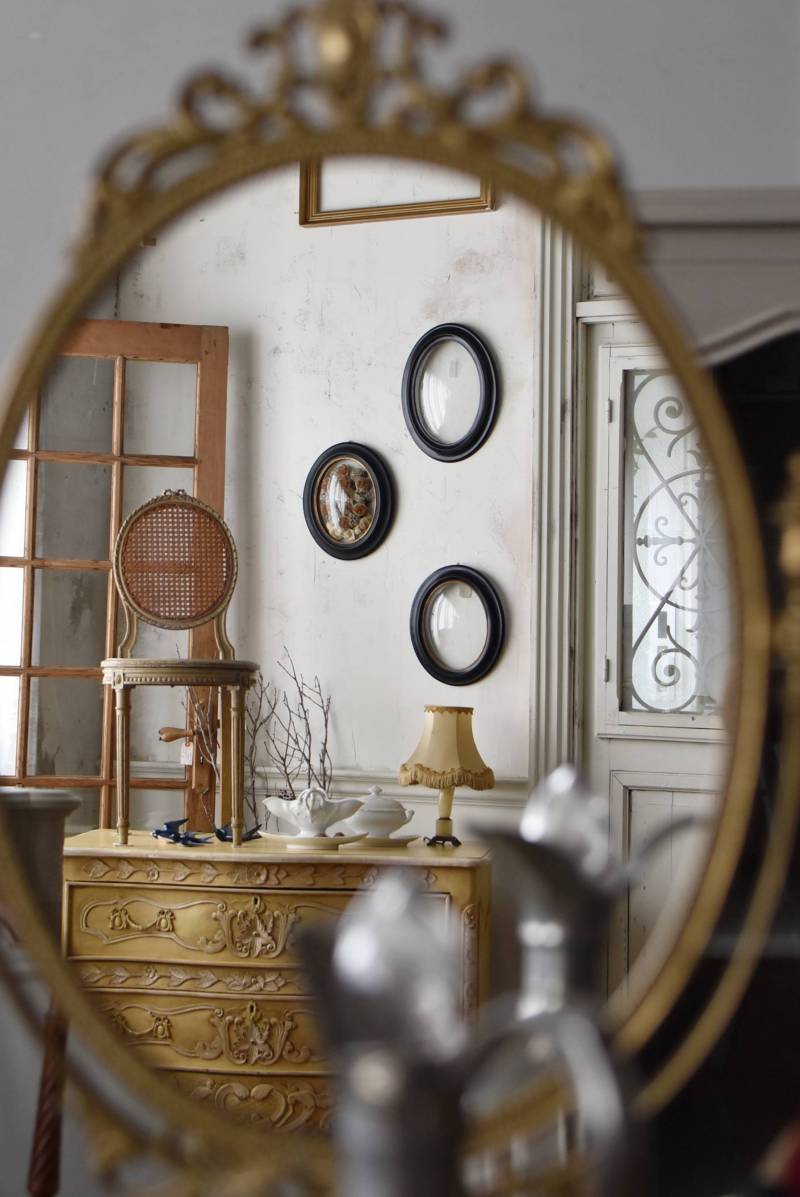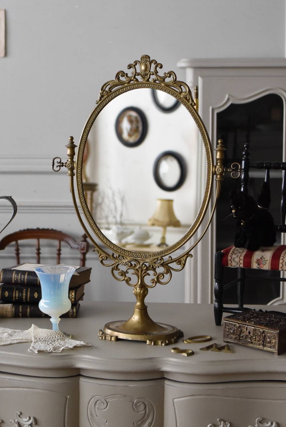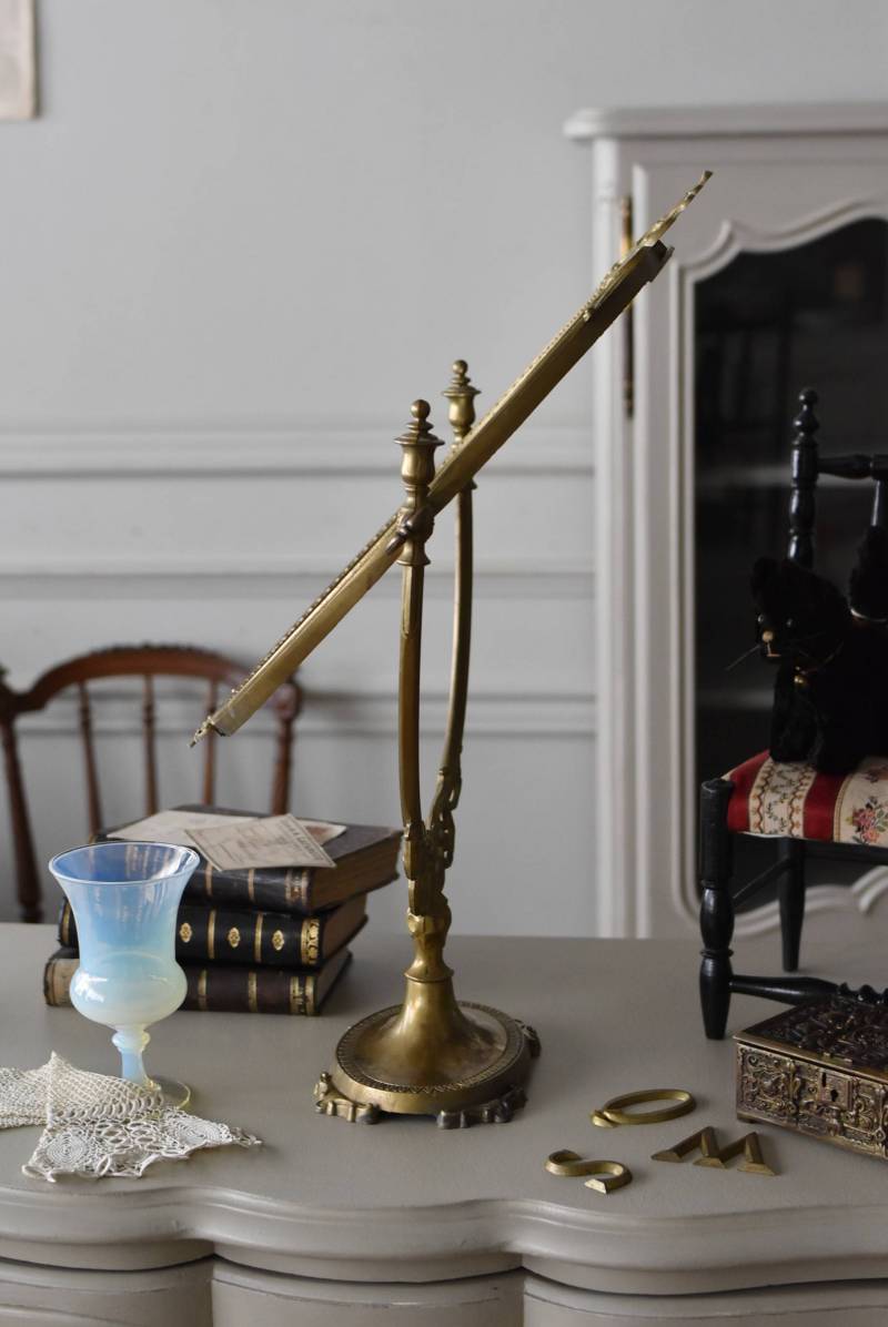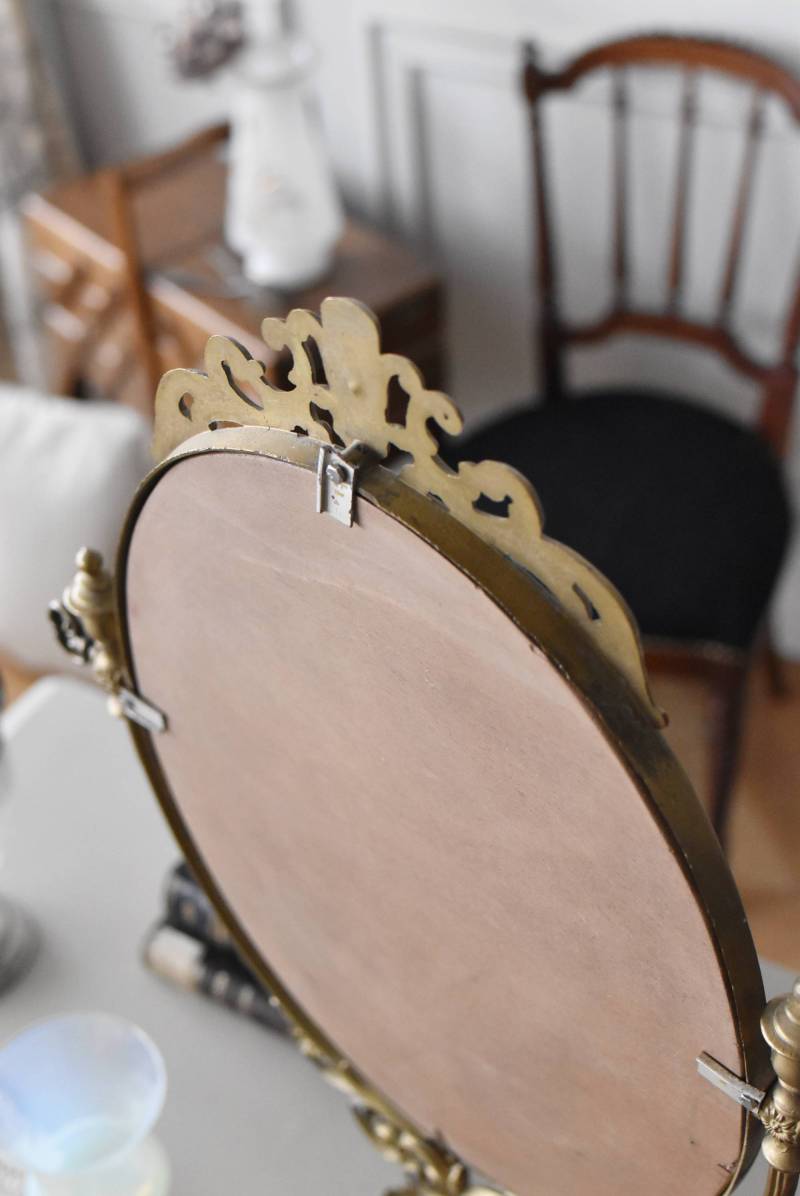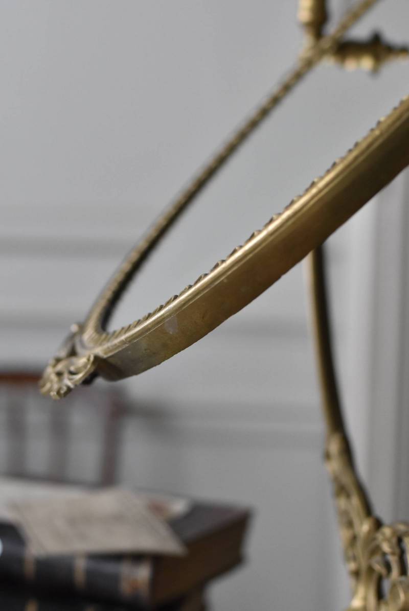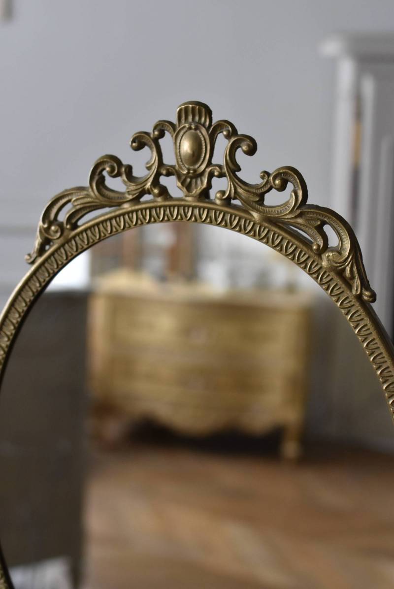 比較的大きめサイズのフレンチスタンドミラー。 すっきりとしたオーバル型になったミラー周りが豪華に彩られ、上下のくり抜かれた繊細な装飾や花びらモチーフのような連続模様で囲まれた可憐な雰囲気が漂います。真鍮ならではの経年による深みのある風合いが漂い、植物モチーフとなったラインの先がくるんと巻かれた流れるような姿は卓上を雰囲気を高めてくれそうです。 鏡面は新しく交換しています。両サイドのつまみを緩めるとミラーの角度を調節することが可能です。 W 約39cm D 約12cm H 約57cm 鏡面積 W約25.5cm×H約33cm
