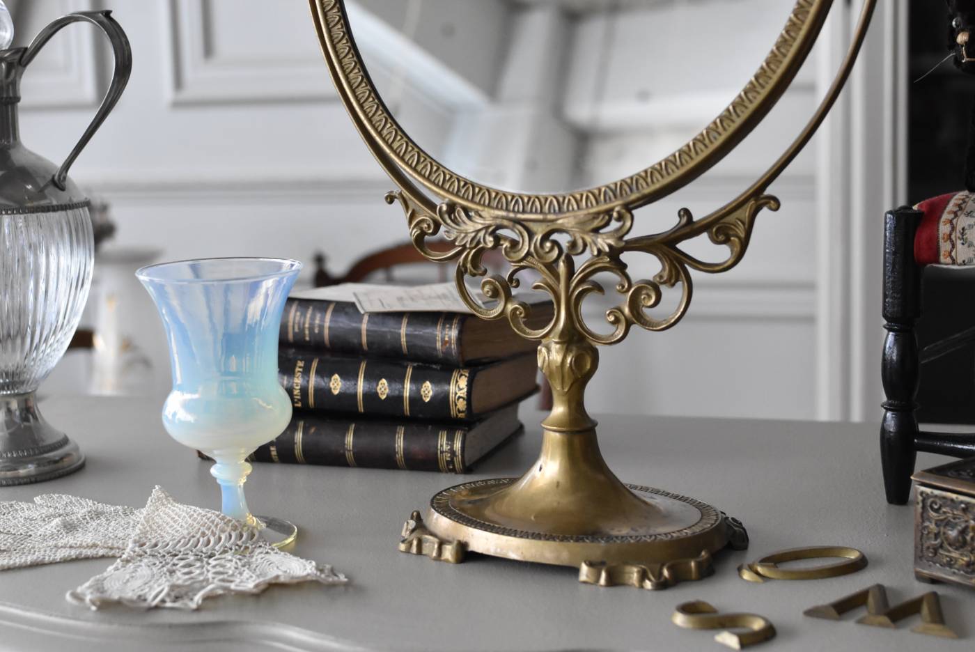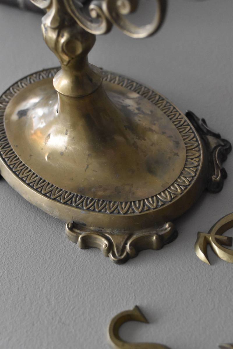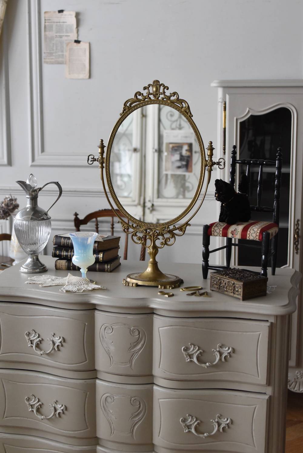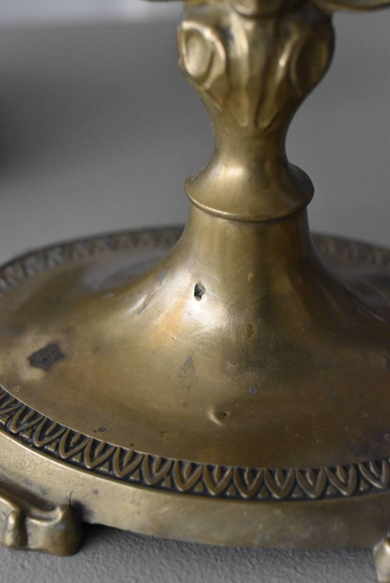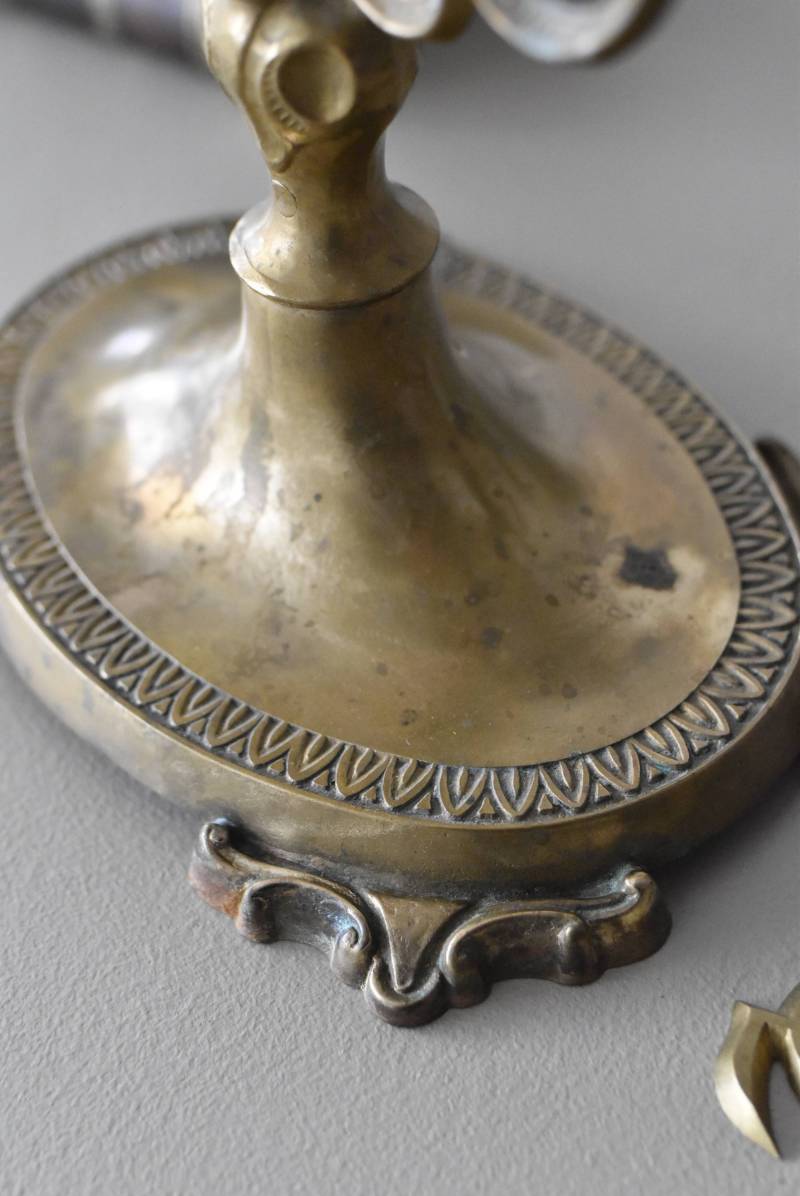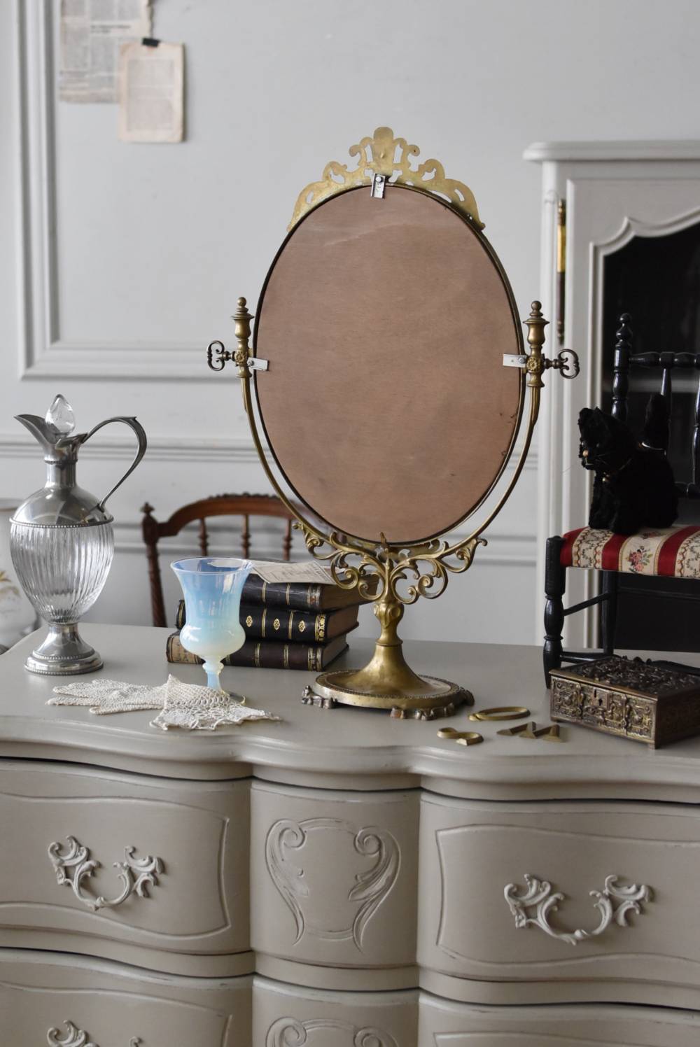 比較的大きめサイズのフレンチスタンドミラー。 すっきりとしたオーバル型になったミラー周りが豪華に彩られ、上下のくり抜かれた繊細な装飾や花びらモチーフのような連続模様で囲まれた可憐な雰囲気が漂います。真鍮ならではの経年による深みのある風合いが漂い、植物モチーフとなったラインの先がくるんと巻かれた流れるような姿は卓上を雰囲気を高めてくれそうです。 鏡面は新しく交換しています。両サイドのつまみを緩めるとミラーの角度を調節することが可能です。 W 約39cm D 約12cm H 約57cm 鏡面積 W約25.5cm×H約33cm