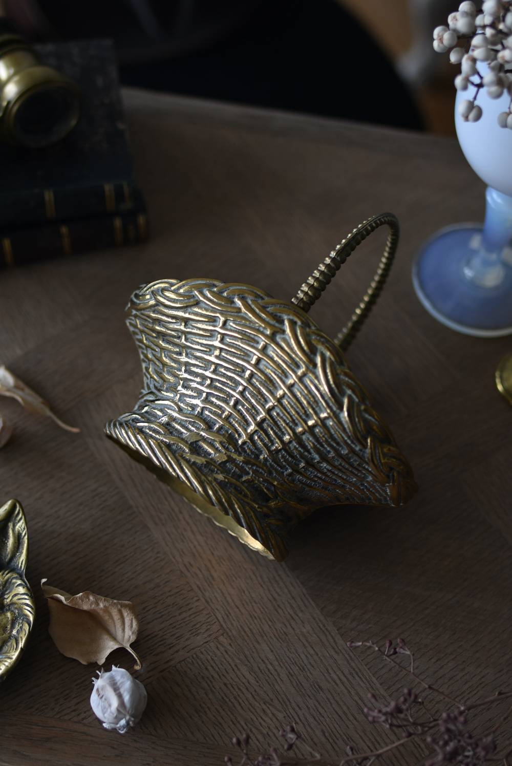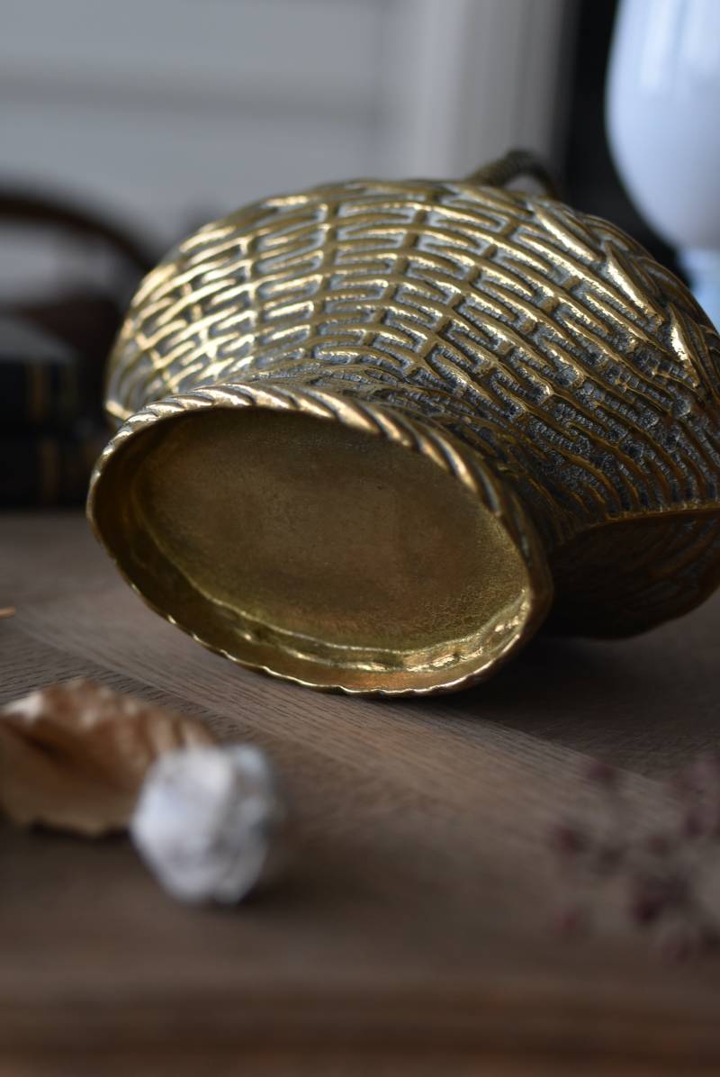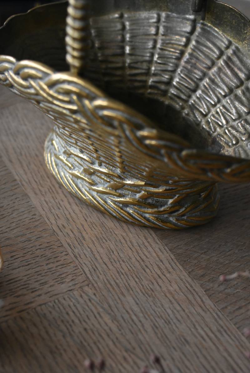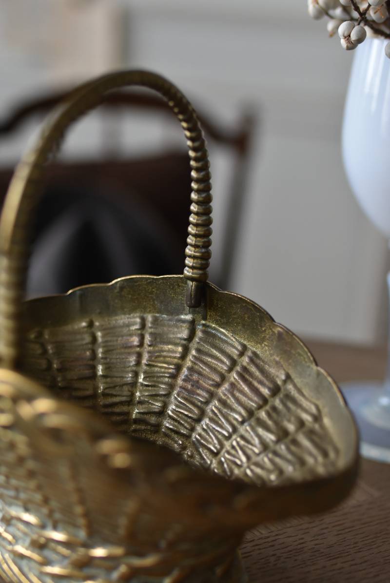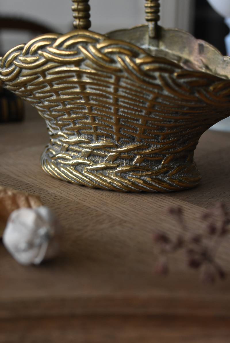 ボディはややくすんだゴールドカラーで、長い時をゆっくりと刻んだ趣豊かな表情が深みのある佇まい。バスケットをモチーフとしたシルエットと表面に施された編み目模様の作りこみが魅力の一つで、隅々まで丁寧に作り込まれていることが窺えます。ハンドル部分は左右にパタンと倒すことができる構造です。
