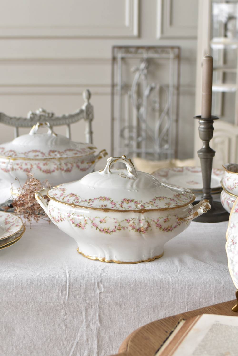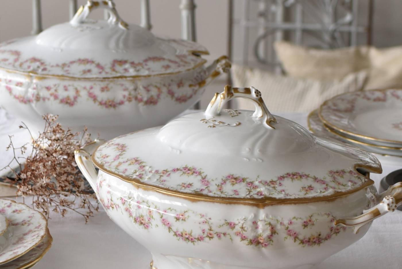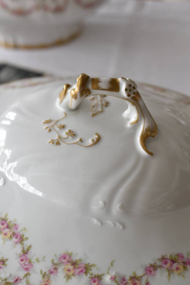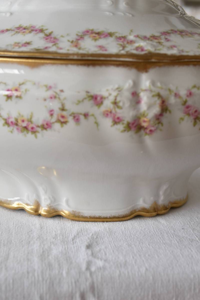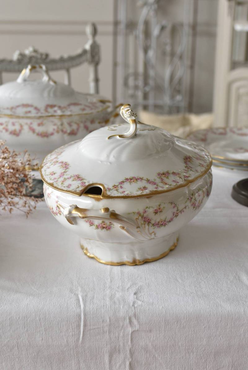 フランス・Emile Bourgeoisのスーピエール。 中央にふっくらと丸みのある横長シルエットで、リズミカルに連なった薔薇のような小花の模様が可憐な雰囲気を漂わせてくれます。器のサイドや蓋の取っ手までも蔓が伸びるように滑らかで立体的なラインが卓上を華やかに彩ってくれそうです。 ほんのりとかすれたゴールドラインによって気品高い印象をもたらし、艶やかな質感と淡いカラーにまとまった上品な姿です。同じシリーズのお皿やソーシエールなどの食器で揃える事が出来ます。 W 約34.5cm D 約22cm H 約20cm