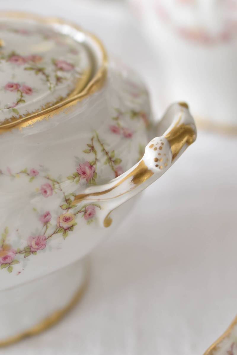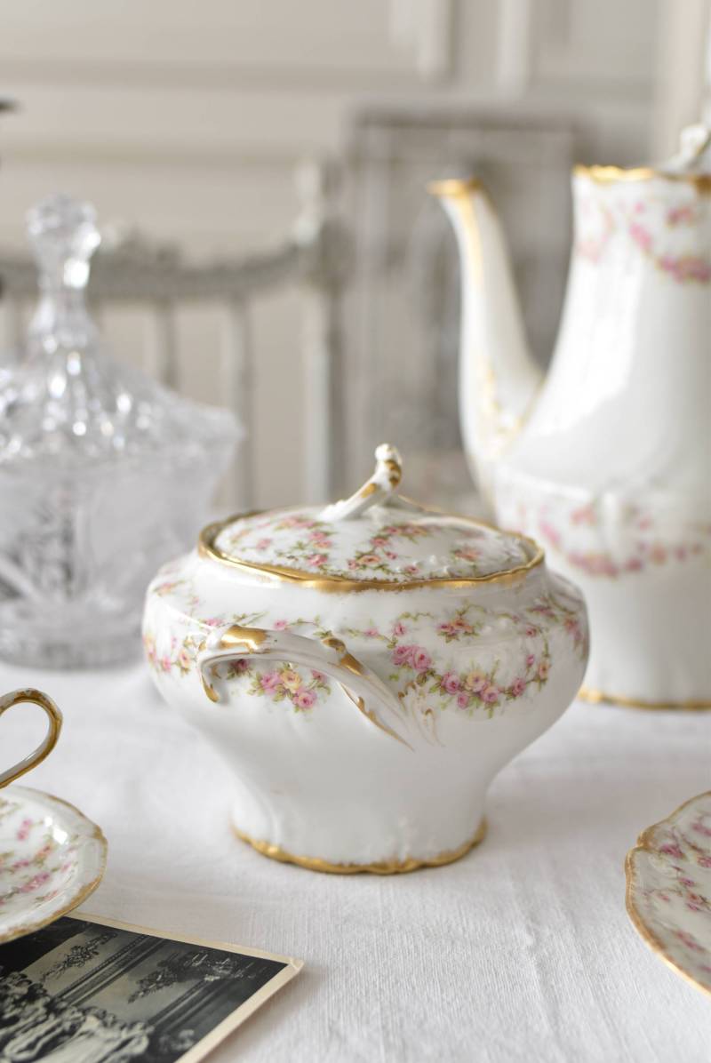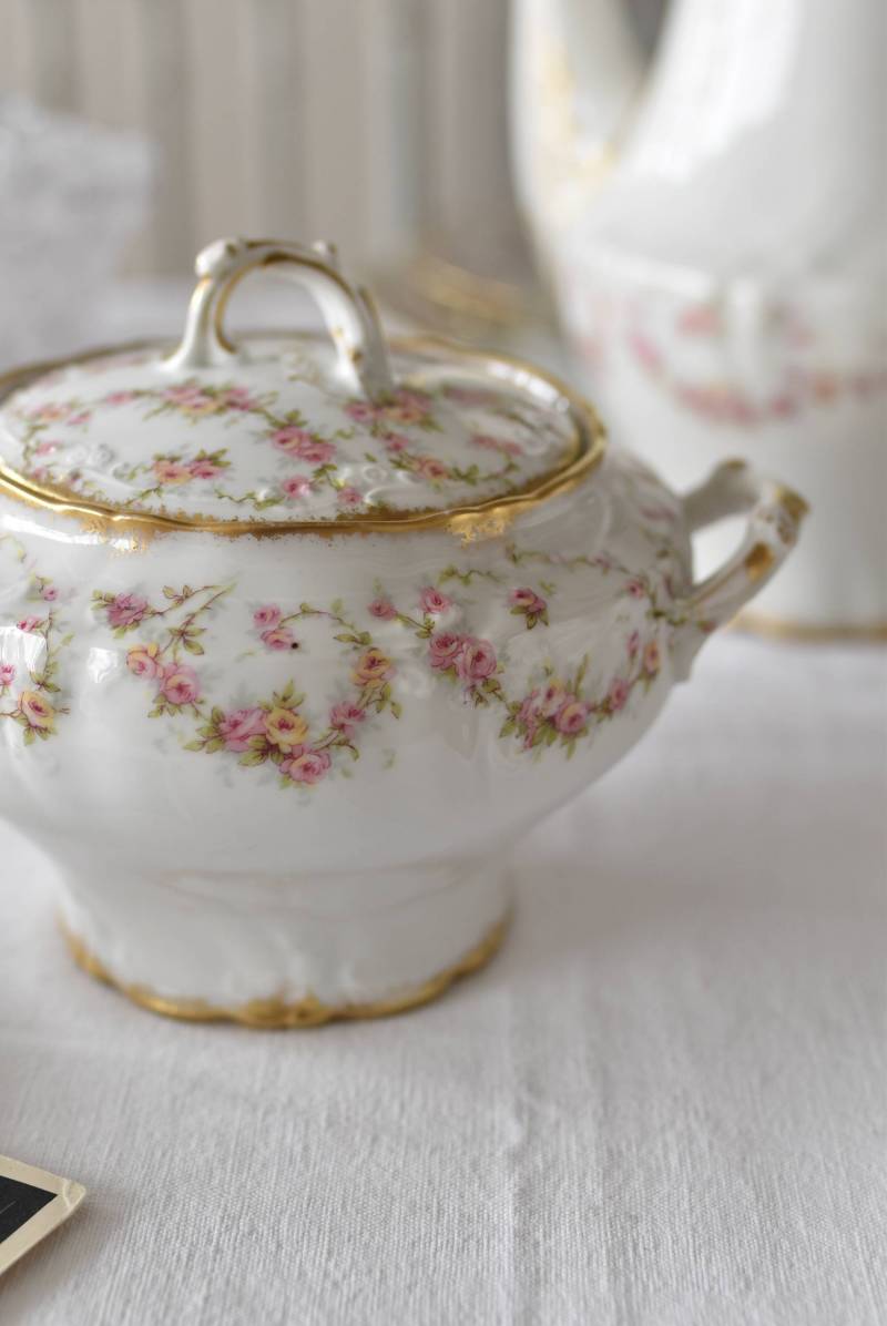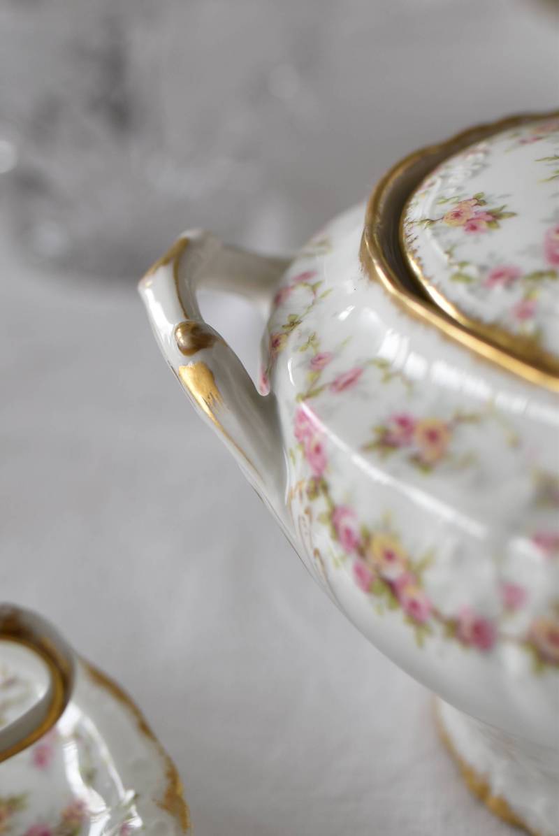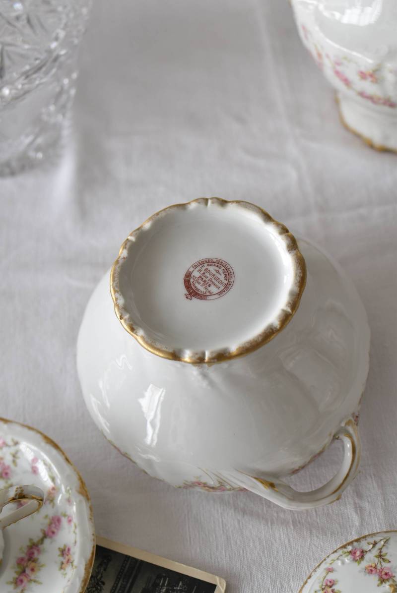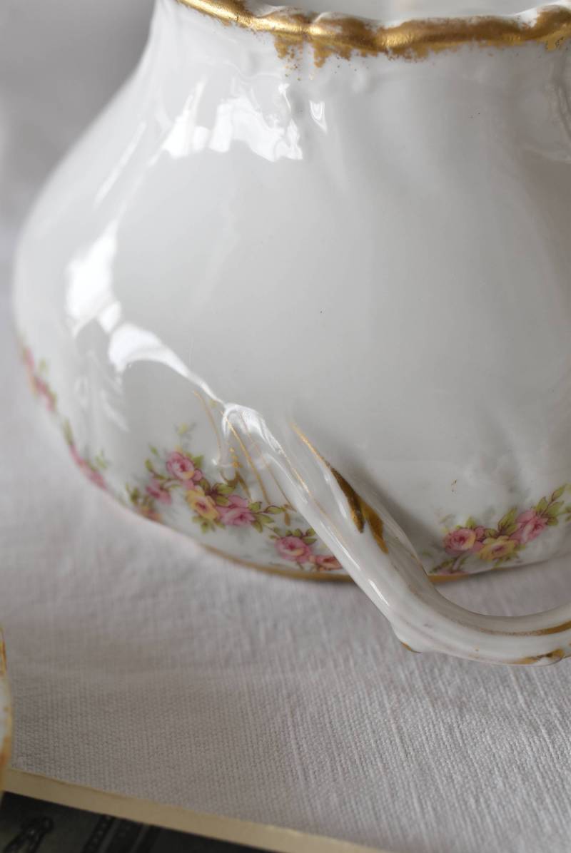フランス・Emile Bourgeoisのシュガーポット。 オレンジやピンクに色づいた薔薇のような繊細な模様で囲まれ、取っ手やつまみは蔓状に伸びるような躍動的なデザインとなり、ベースカラーの艶やかなホワイトも相まって可憐な雰囲気を纏っています。下に向かってやや細くなった個性的なフォルムも目を惹き、蓋がついているので小物入れとしても活躍してくれそうです。 少し薄くなっている箇所もありますが、ゴールドに縁取られた豪華な姿は卓上を色鮮やかに彩ってくれ、ふんわりと優しげな雰囲気が漂います。同じシリーズのお皿やカップ&ソーサーなどの食器で揃える事が出来ます。 W 約17cm D 約13cm H 約12cm