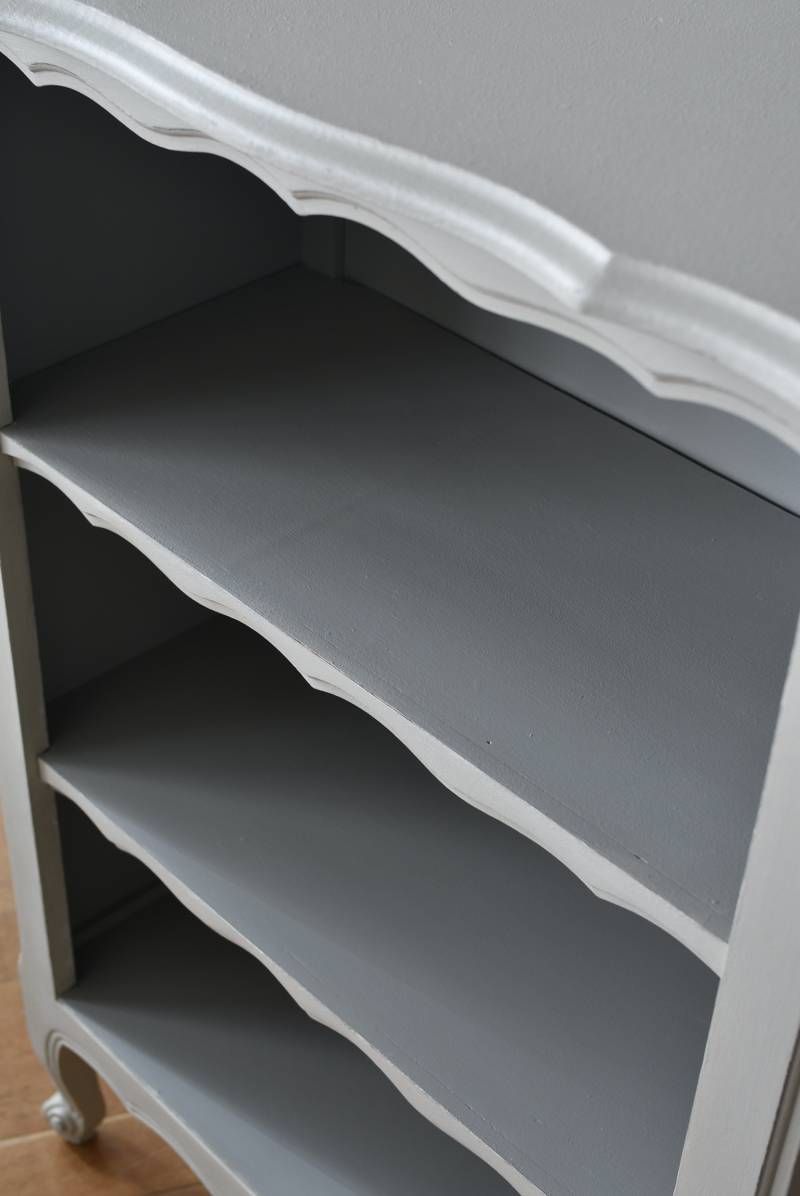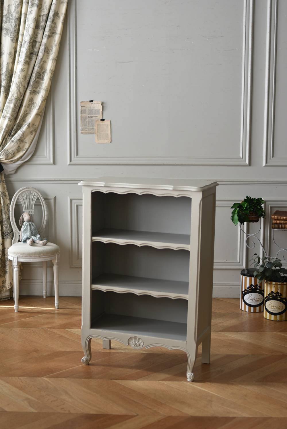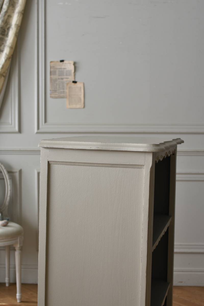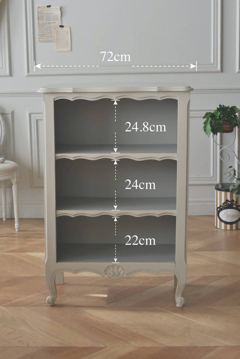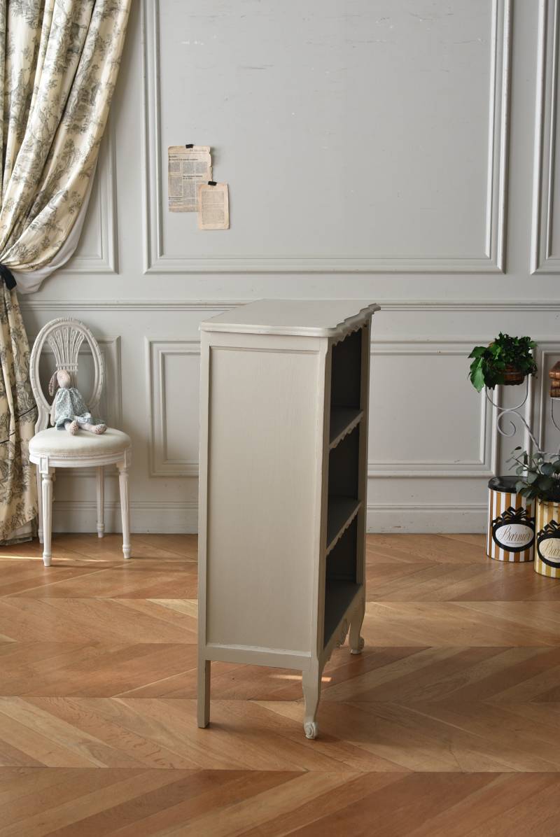 柔らかなグレーが上品なフランスのペイントシェルフ。 ボディ外側と内側でさりげないバイカラーとなったフレンチシックな空間に映える佇まい。跳ねるような波ラインと下部にあしらわれたシェル模様が可愛らしく、くるんと巻かれた猫脚がアクセントとなったフェミニンなデザインです。棚板は固定されており、しっかりとした作りなので本を並べるブックシェルフとしておすすめの逸品に。 比較的小ぶりなサイズでお部屋にも取り入れやすく、本棚としてはもちろん、お気に入りの小物を並べる飾り棚としても活躍してくれるアイテムです。 W 約72cm D 約35cm H 約106cm 棚板間隔(上から) 約24.8cm/約24cm/約22cm 棚板面積 W約65cm×D約27.5cm 搬入経路について こちらの商品の配送について