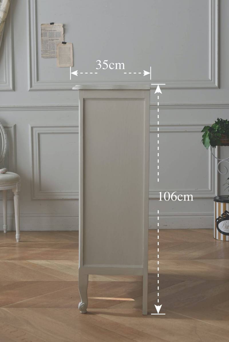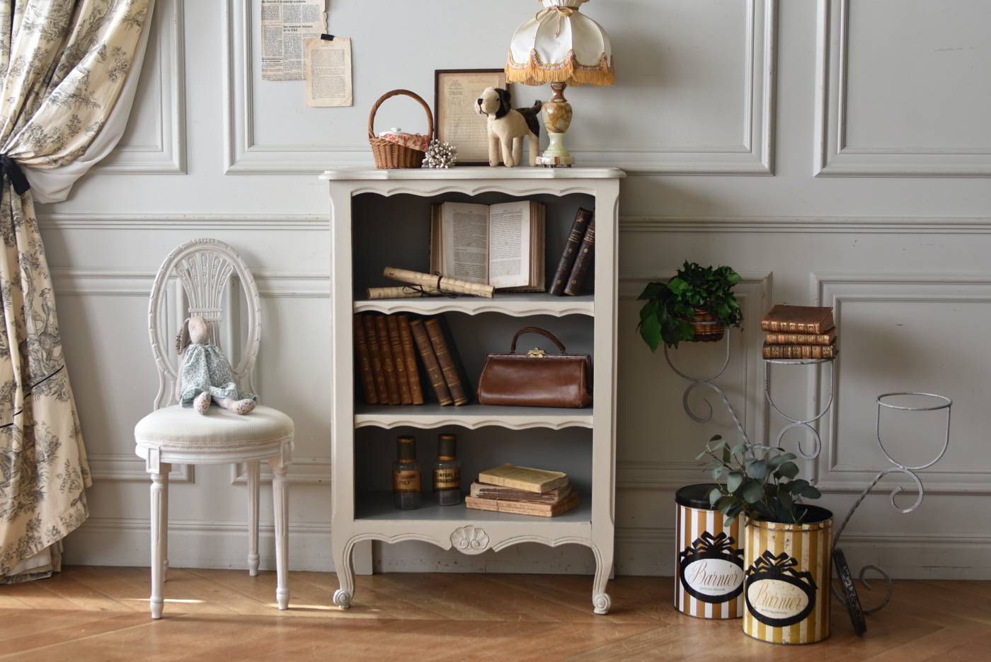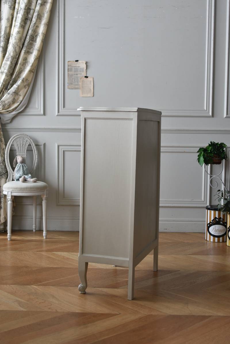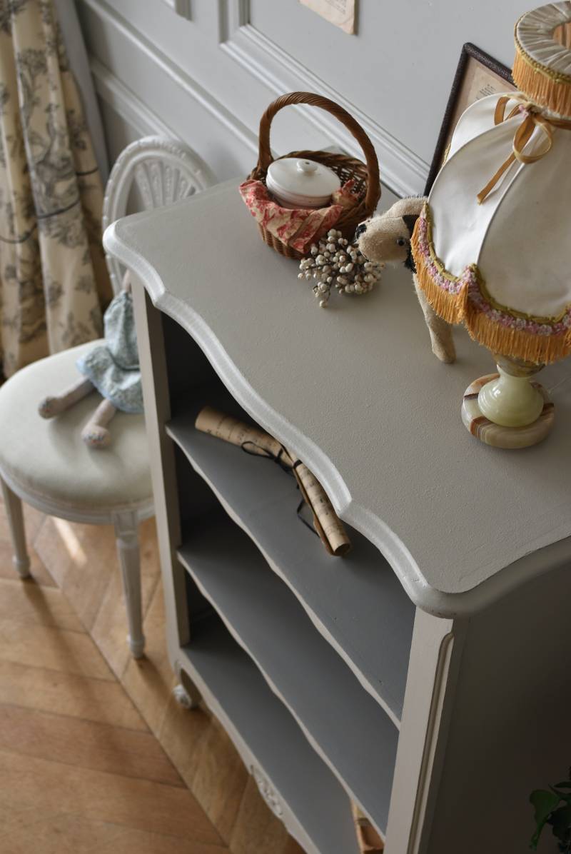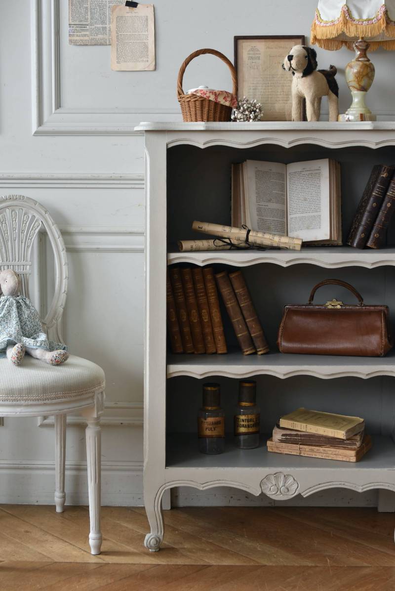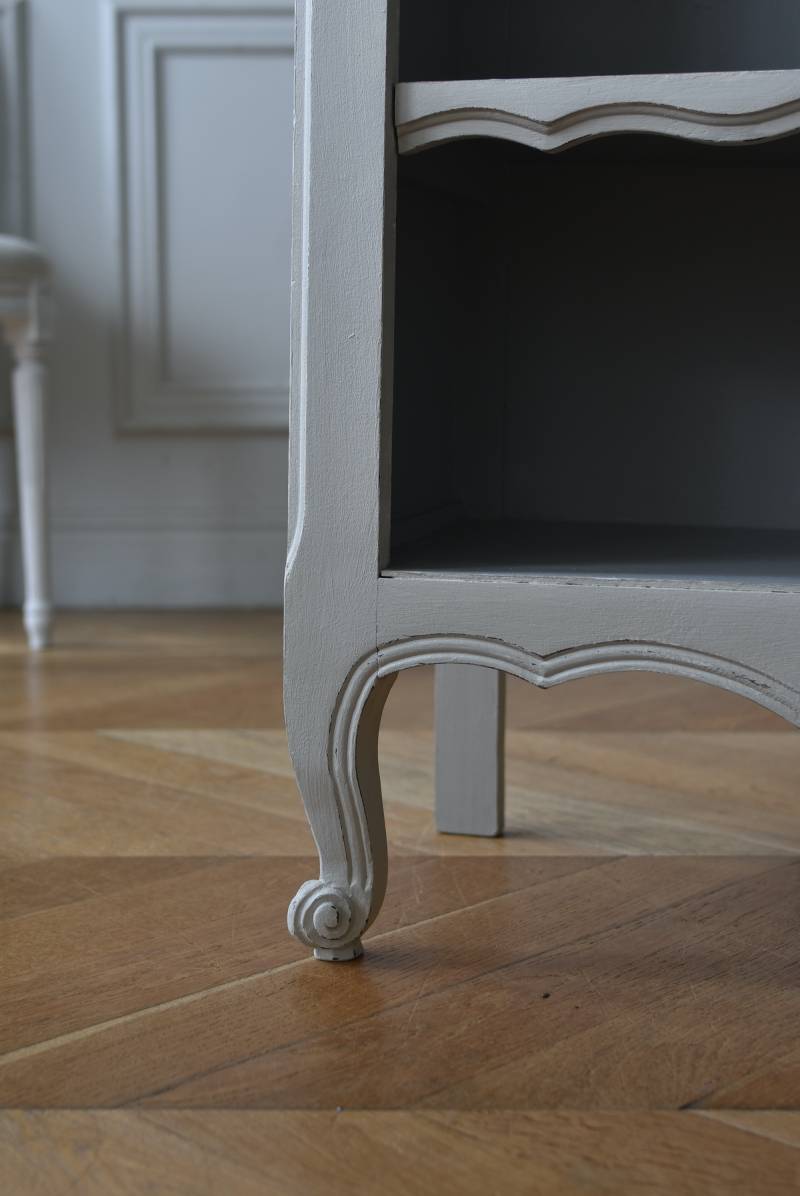 柔らかなグレーが上品なフランスのペイントシェルフ。 ボディ外側と内側でさりげないバイカラーとなったフレンチシックな空間に映える佇まい。跳ねるような波ラインと下部にあしらわれたシェル模様が可愛らしく、くるんと巻かれた猫脚がアクセントとなったフェミニンなデザインです。棚板は固定されており、しっかりとした作りなので本を並べるブックシェルフとしておすすめの逸品に。 比較的小ぶりなサイズでお部屋にも取り入れやすく、本棚としてはもちろん、お気に入りの小物を並べる飾り棚としても活躍してくれるアイテムです。 W 約72cm D 約35cm H 約106cm 棚板間隔(上から) 約24.8cm/約24cm/約22cm 棚板面積 W約65cm×D約27.5cm 搬入経路について こちらの商品の配送について