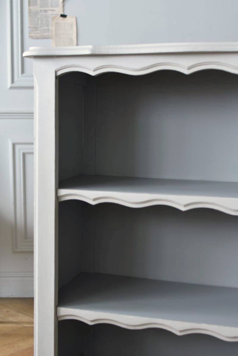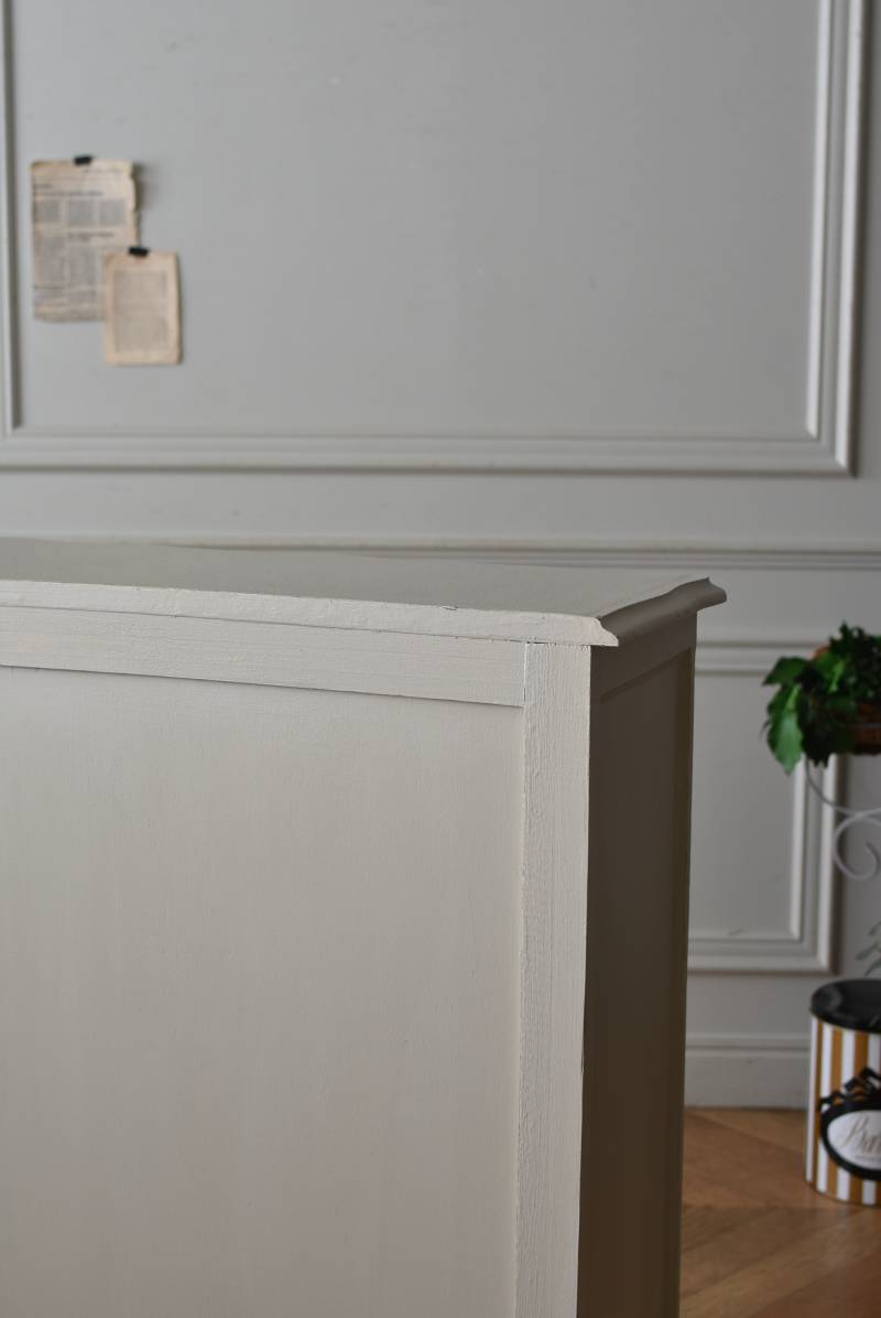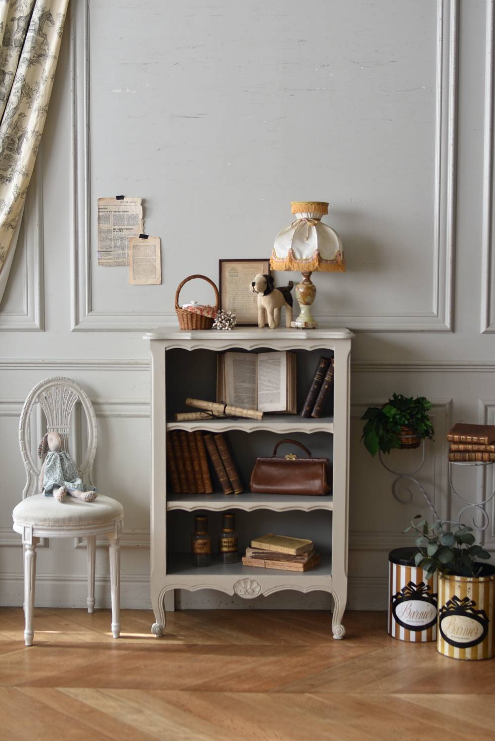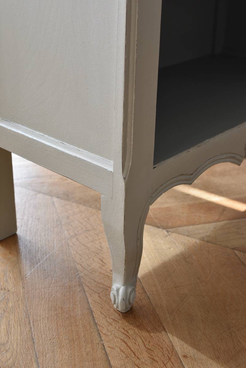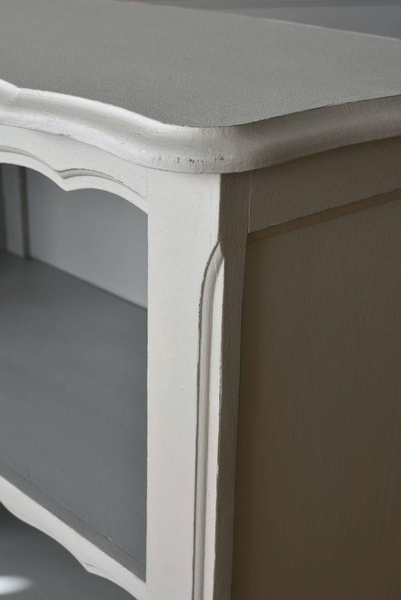 柔らかなグレーが上品なフランスのペイントシェルフ。 ボディ外側と内側でさりげないバイカラーとなったフレンチシックな空間に映える佇まい。跳ねるような波ラインと下部にあしらわれたシェル模様が可愛らしく、くるんと巻かれた猫脚がアクセントとなったフェミニンなデザインです。棚板は固定されており、しっかりとした作りなので本を並べるブックシェルフとしておすすめの逸品に。 比較的小ぶりなサイズでお部屋にも取り入れやすく、本棚としてはもちろん、お気に入りの小物を並べる飾り棚としても活躍してくれるアイテムです。 W 約72cm D 約35cm H 約106cm 棚板間隔(上から) 約24.8cm/約24cm/約22cm 棚板面積 W約65cm×D約27.5cm 搬入経路について こちらの商品の配送について