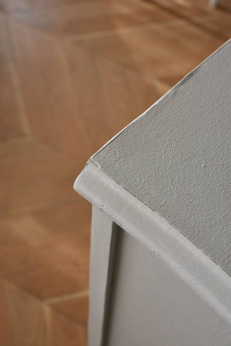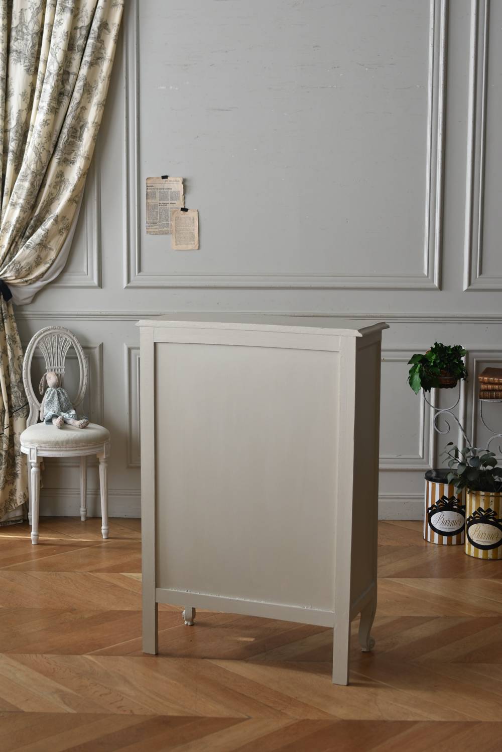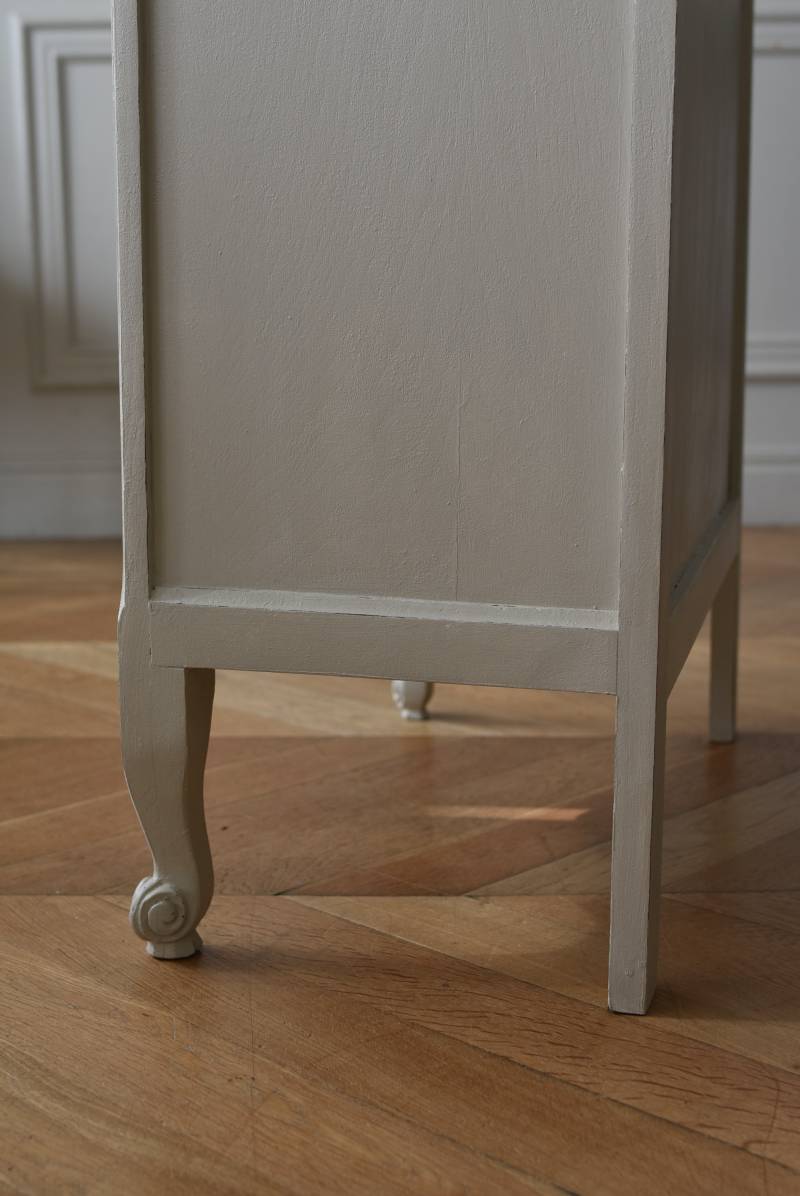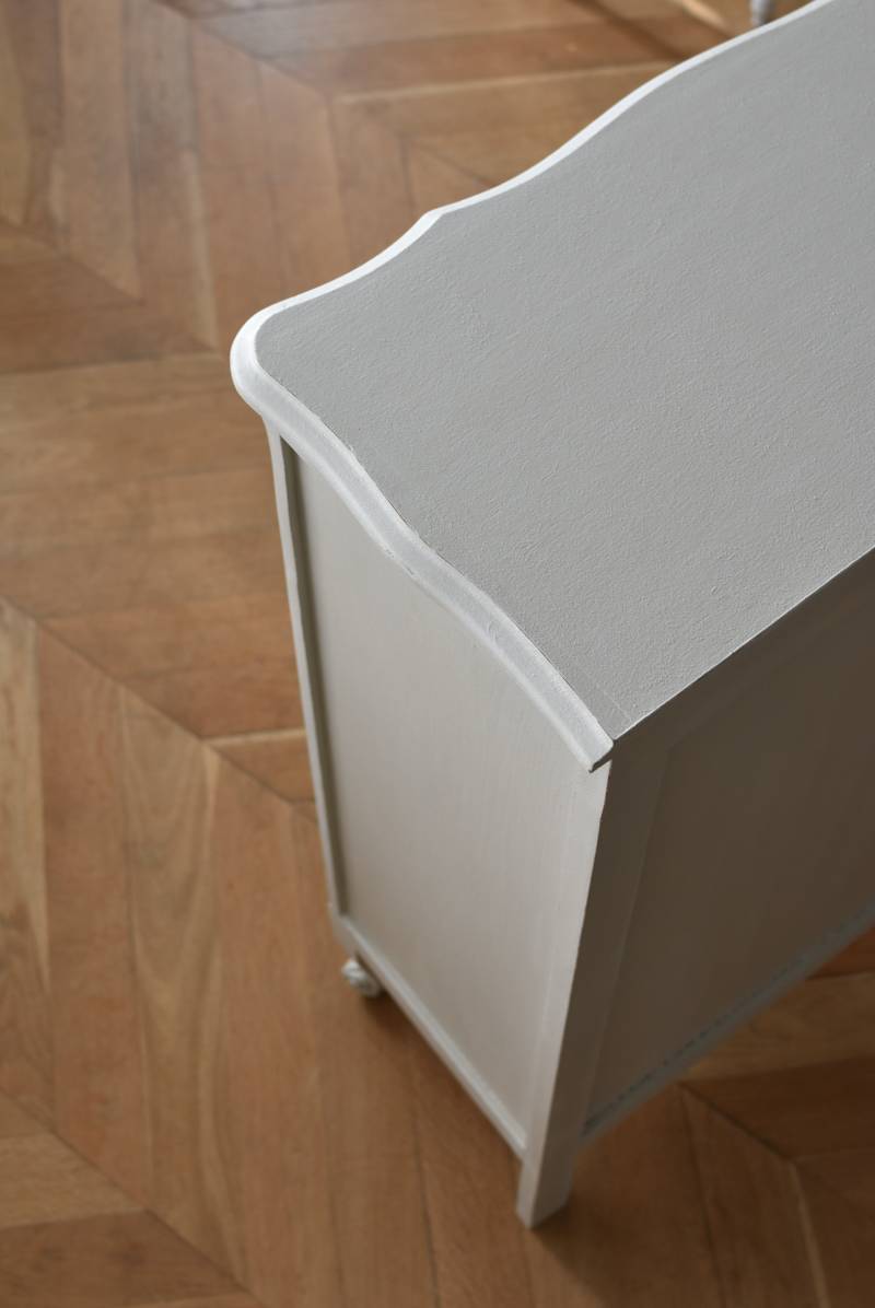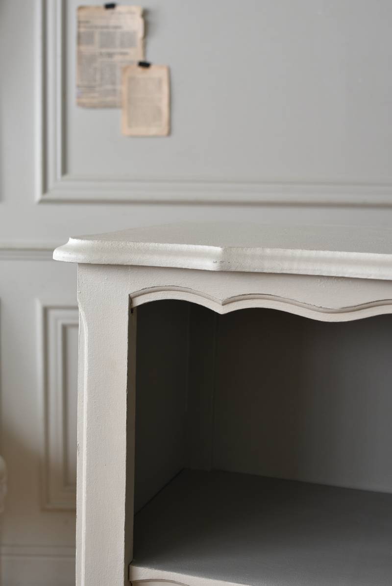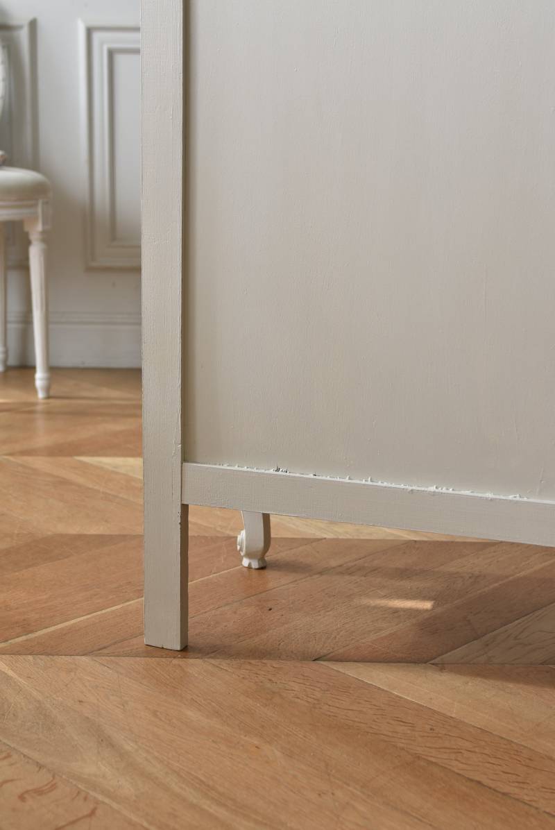 柔らかなグレーが上品なフランスのペイントシェルフ。 ボディ外側と内側でさりげないバイカラーとなったフレンチシックな空間に映える佇まい。跳ねるような波ラインと下部にあしらわれたシェル模様が可愛らしく、くるんと巻かれた猫脚がアクセントとなったフェミニンなデザインです。棚板は固定されており、しっかりとした作りなので本を並べるブックシェルフとしておすすめの逸品に。 比較的小ぶりなサイズでお部屋にも取り入れやすく、本棚としてはもちろん、お気に入りの小物を並べる飾り棚としても活躍してくれるアイテムです。 W 約72cm D 約35cm H 約106cm 棚板間隔(上から) 約24.8cm/約24cm/約22cm 棚板面積 W約65cm×D約27.5cm 搬入経路について こちらの商品の配送について