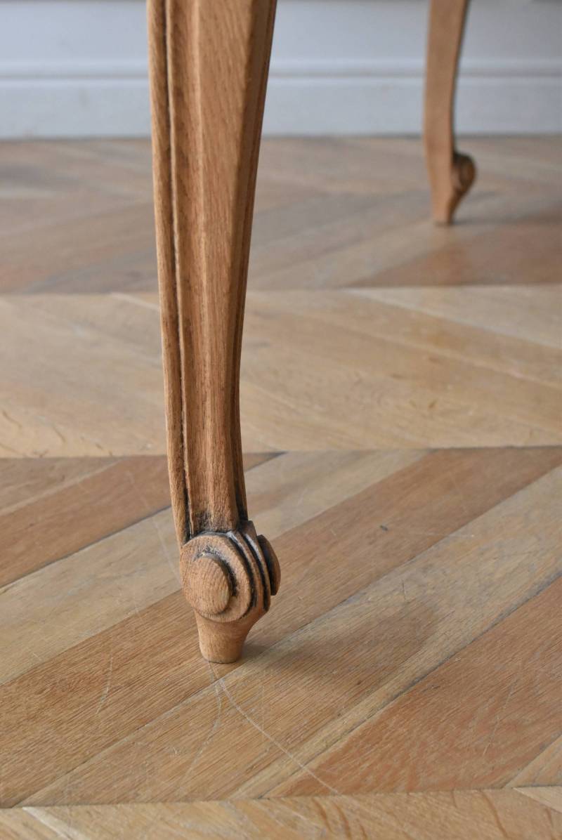 菱形が連なったような幾何学的な突板模様が楽しめ、剥離されたオーク材ならではの細やかではっきりとした木目と明るい色合いが、自然のぬくもりを与えてくれそうです。波打つようなラインを描いた幕板中央に施されたシェルモチーフのデザインが優美さをもたらしてくれ、どの眺めからも曲線美が引き立ちます。