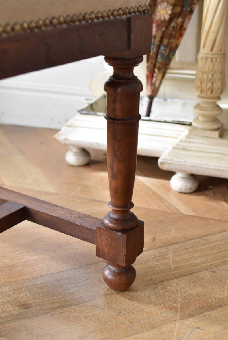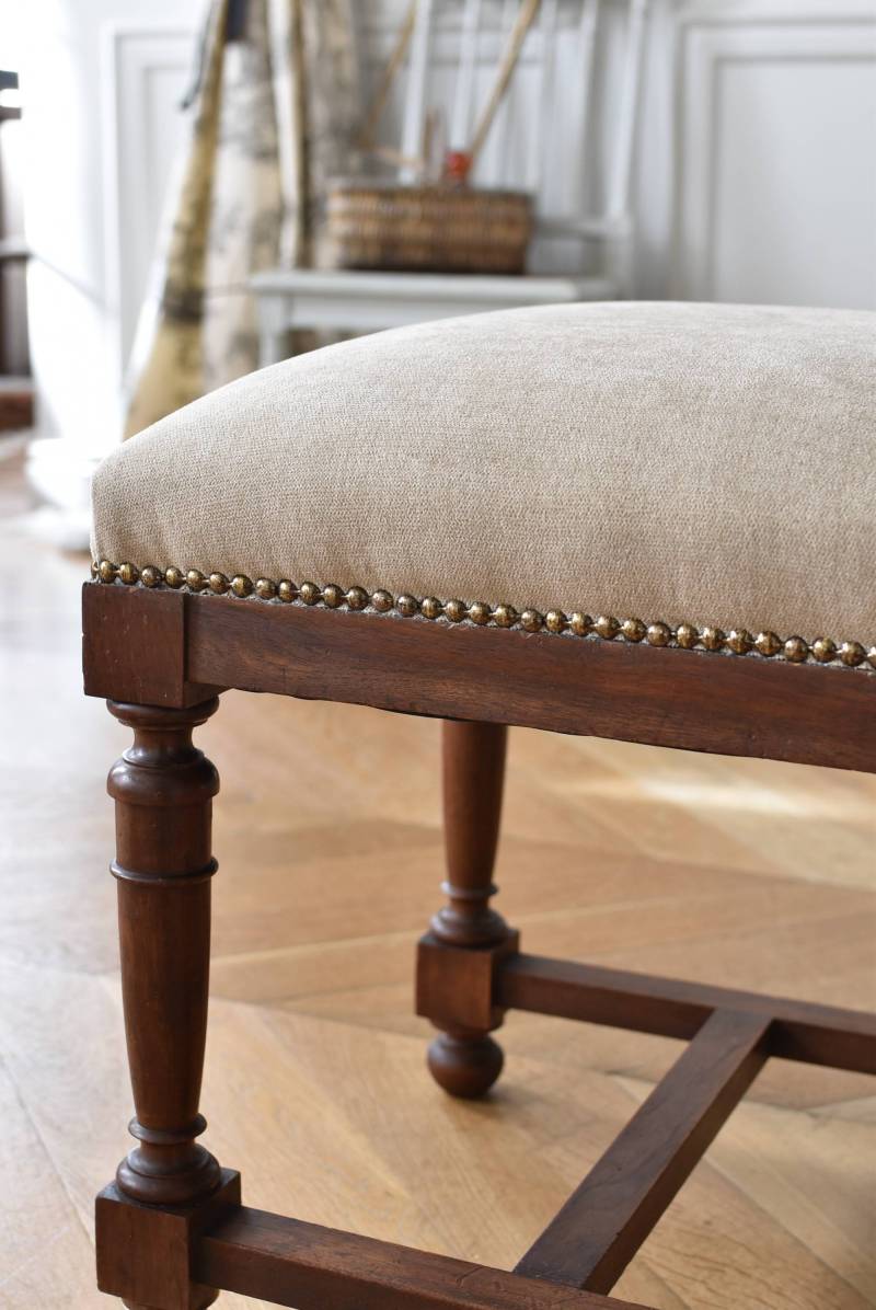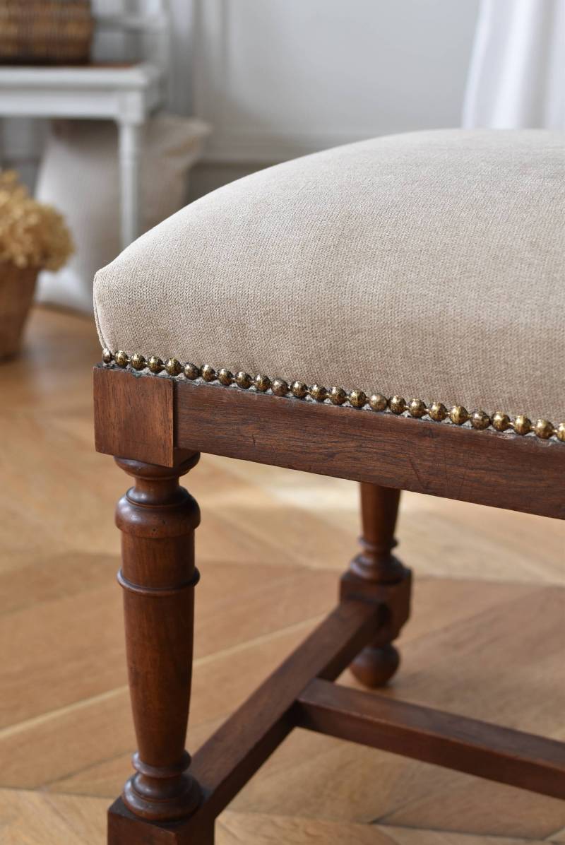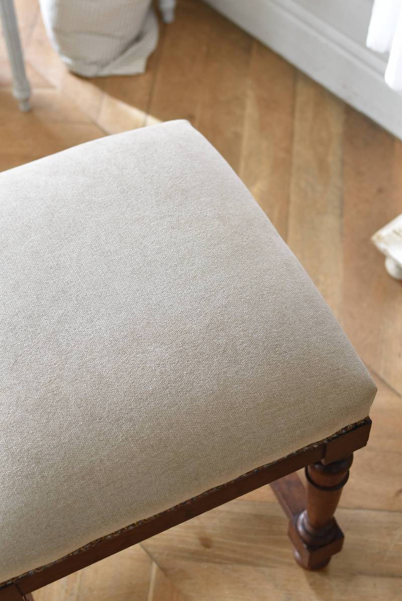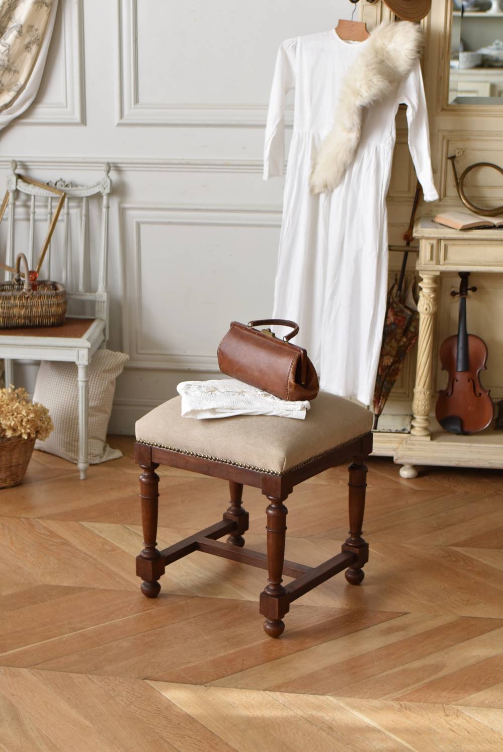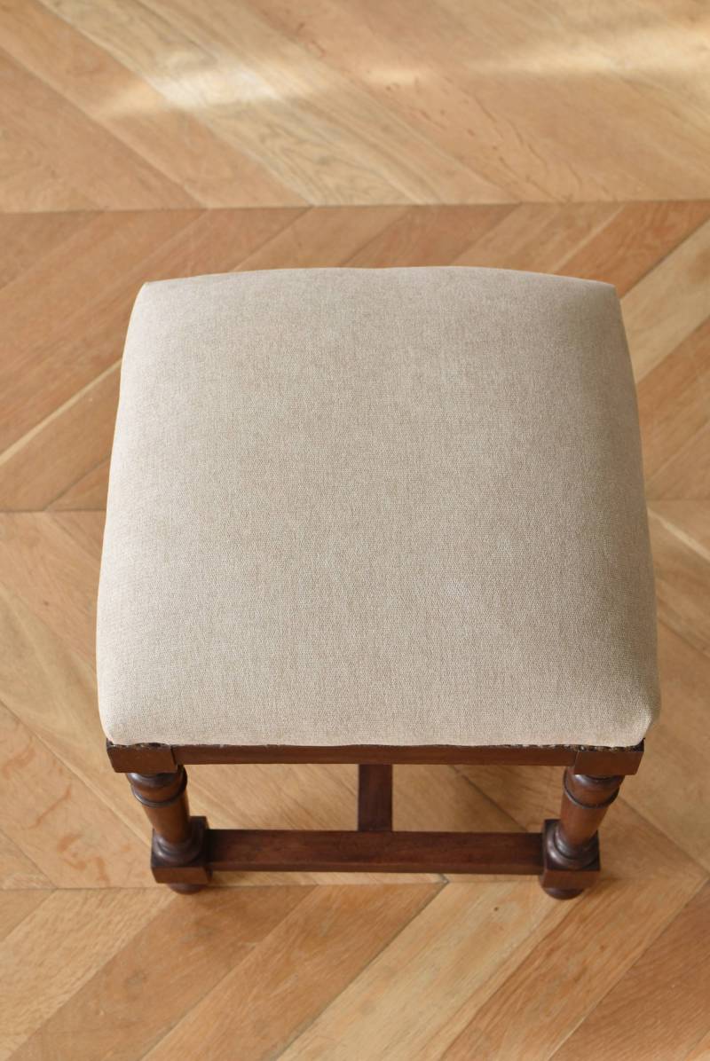 フランスのファブリックスツール。 四角いかっちりとしたフォルムに脚先に向かって細くなった丸みのあるラインがバランス良く合わさり、上品かつすっきりとした印象を受けます。しっかりと厚みのある材が使われた安定感のあるクラシカルな雰囲気があり、ダークブラウンの色味と相まって、程よい重厚感のある姿です。 フレームは一度パーツ毎にバラしてから、しっかりと組み直しを行っています。座面のファブリックは新しく張り直し、中もウレタンに交換済みで、しっかりとしたハリがあり柔らかすぎない座り心地です。 W 約43cm D 約43cm H 約50cm 脚元W約41.5cm×D約41.5cm