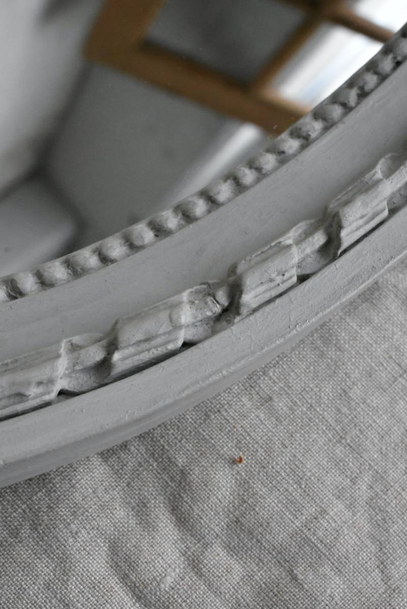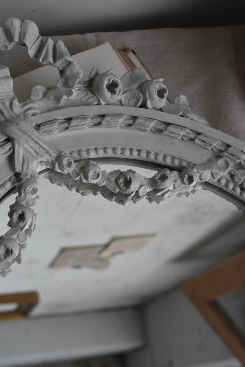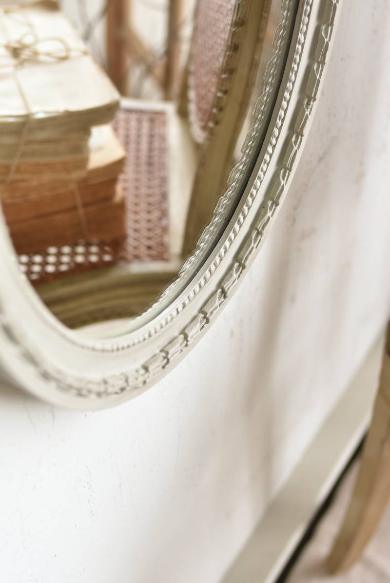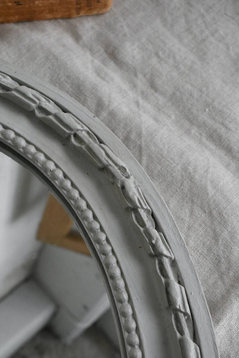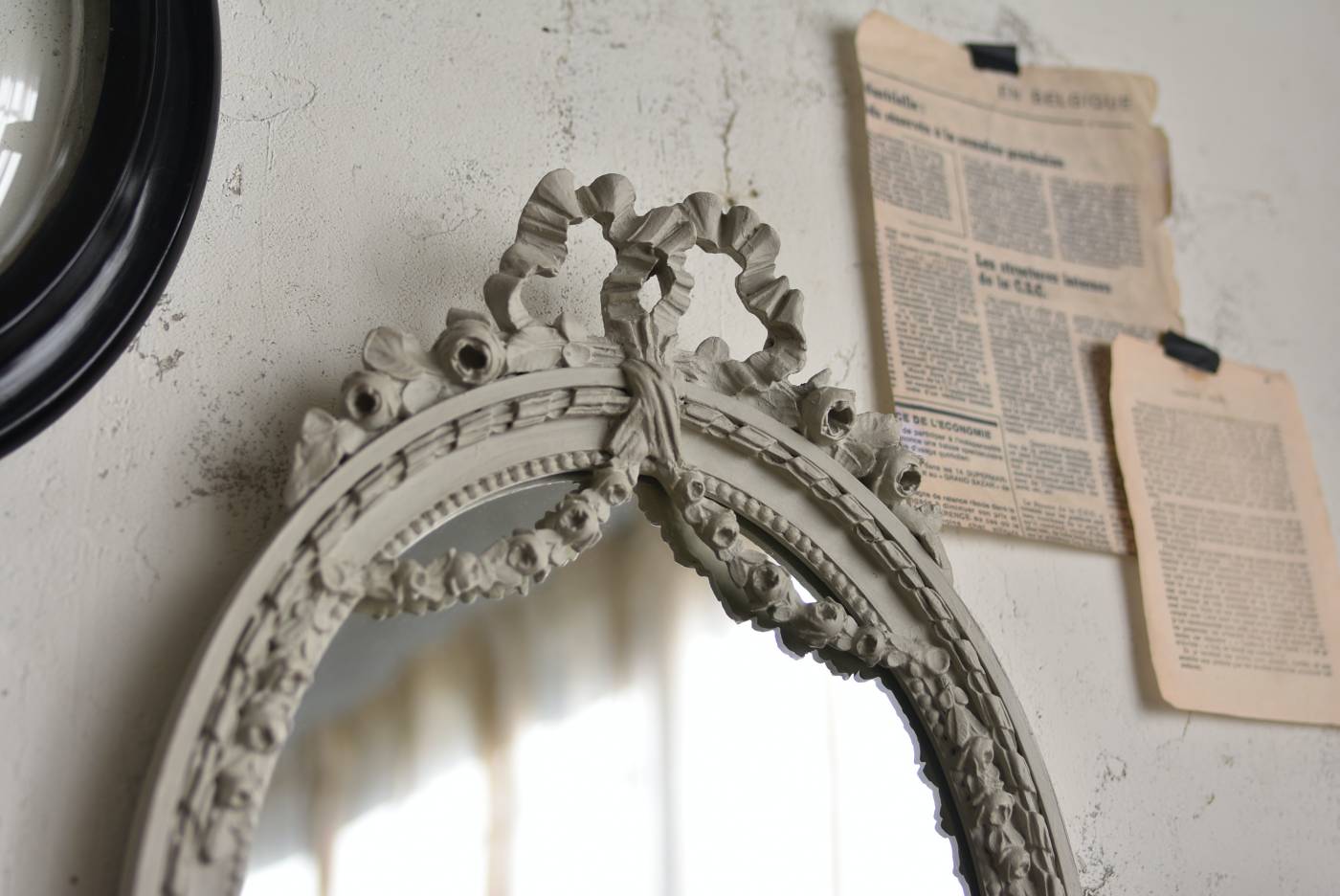 フランスのオーバルミラー。 明るく淡いグレーカラーにペイントされた上品な装いで、オーバルシルエットがどこか優しげな印象の佇まい。トップには大胆なリボンレリーフところんと丸いお花のガーランドがあしらわれ、エレガントな空間にも映える優雅なデザインです。ミラーはオリジナルのものをそのまま使用しており、多少の小さなキズが見受けられる程度で実用としてもしっかりと活躍してくれそう。 程よい大きさで存在感もあり、フェミニンな壁面ディスプレイを楽しめる可憐な雰囲気のアイテムです。 W 約34.7cm D 約4cm(+金具1.5cm) H 約52cm 内寸 W約27.5cm×H約37.5cm 重量 約2kg