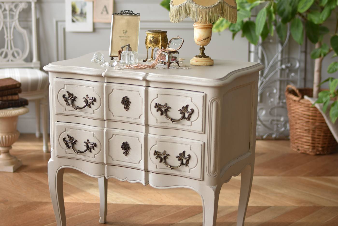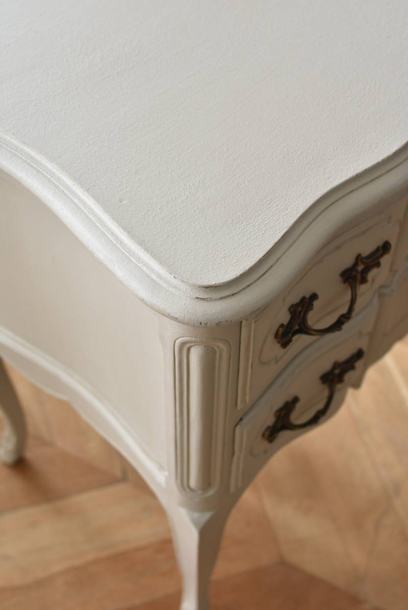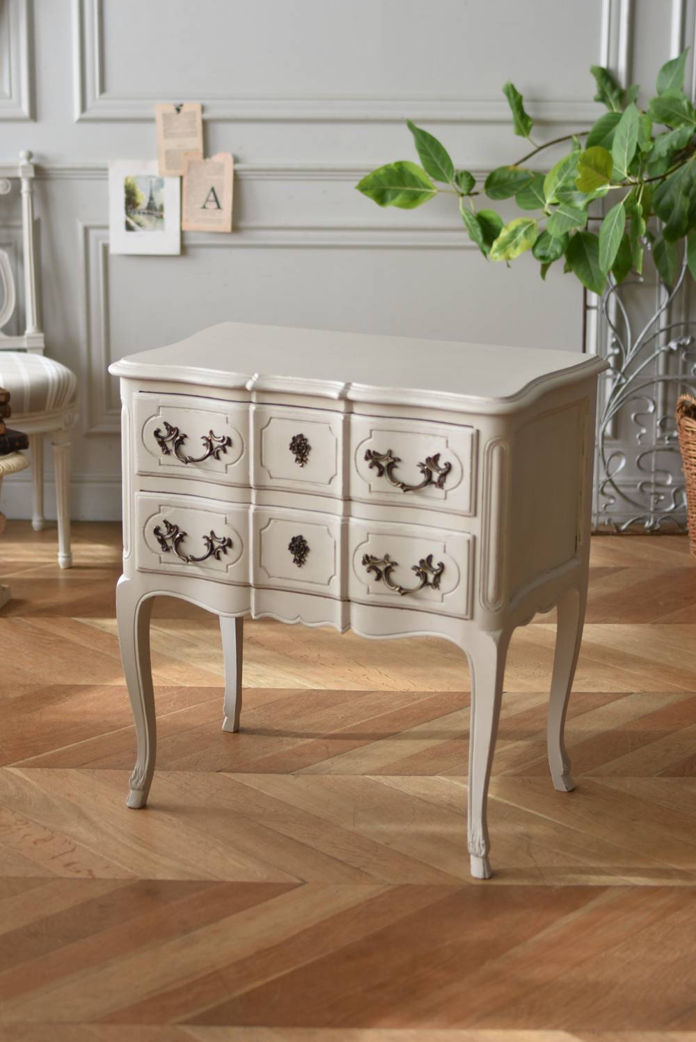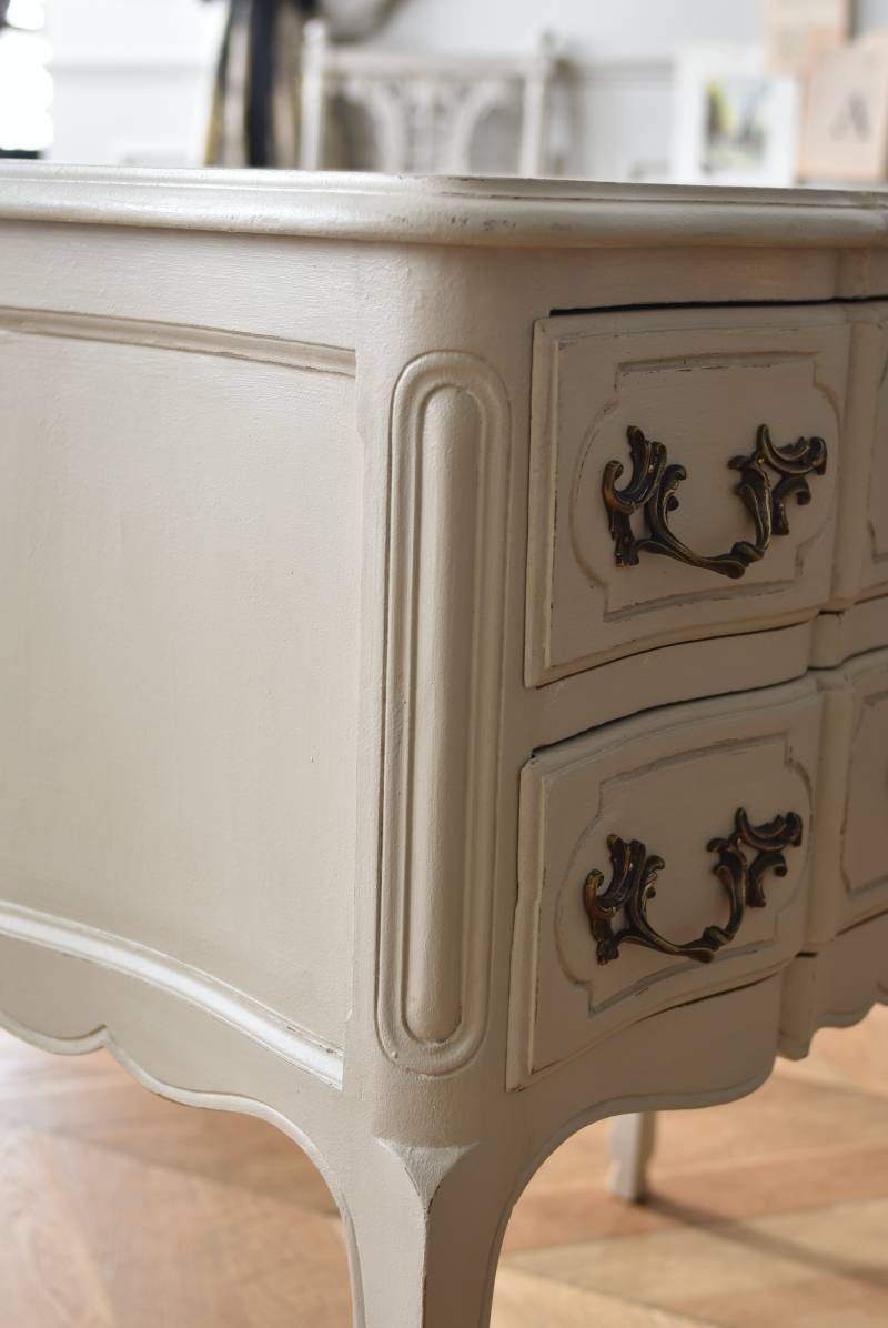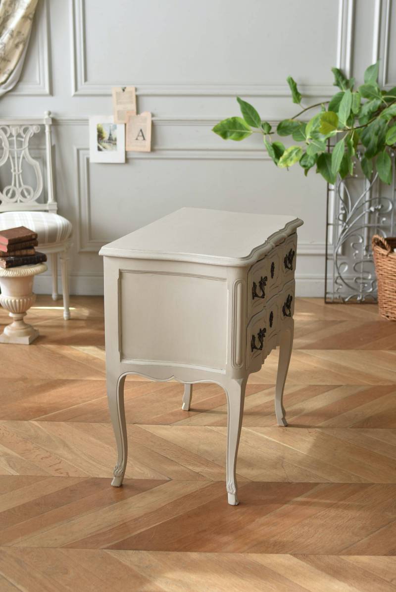 フランスの2段ペイントチェスト。 明るく柔らかなグレーカラーにペイントされたボディにロカイユモチーフの金属取手がアクセントとなった優美なデザイン。すらりとした華奢な脚元や緩やかに波打つボディラインが美しく、フランスらしいエレガントなイメージを空間にもたらしてくれるデザインです。引き出しは2つ設けられており、程よい収納力も備わった逸品に。 比較的小ぶりなサイズでお部屋にも取り入れやすく、上品な色味がフレンチシックな空間にも映えるアイテムです。 W 約73cm D 約45cm H 約77cm 引き出し内寸 W約53.5cm×D約34cm×H約11.5cm こちらの商品の配送について