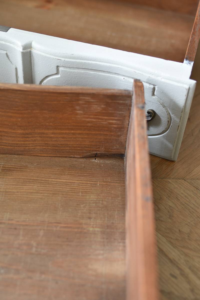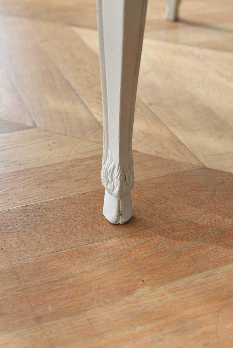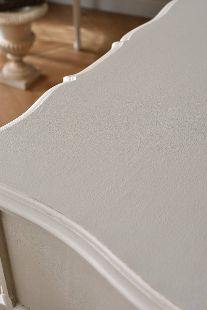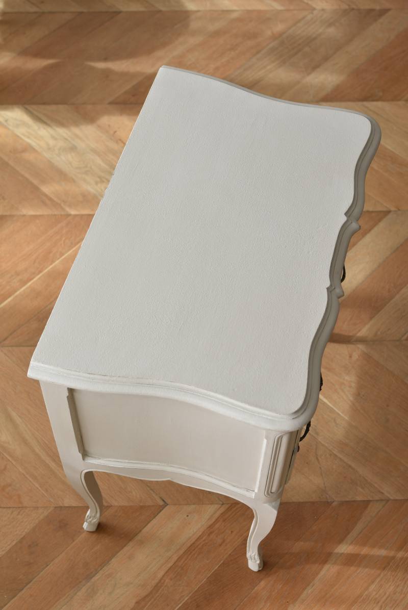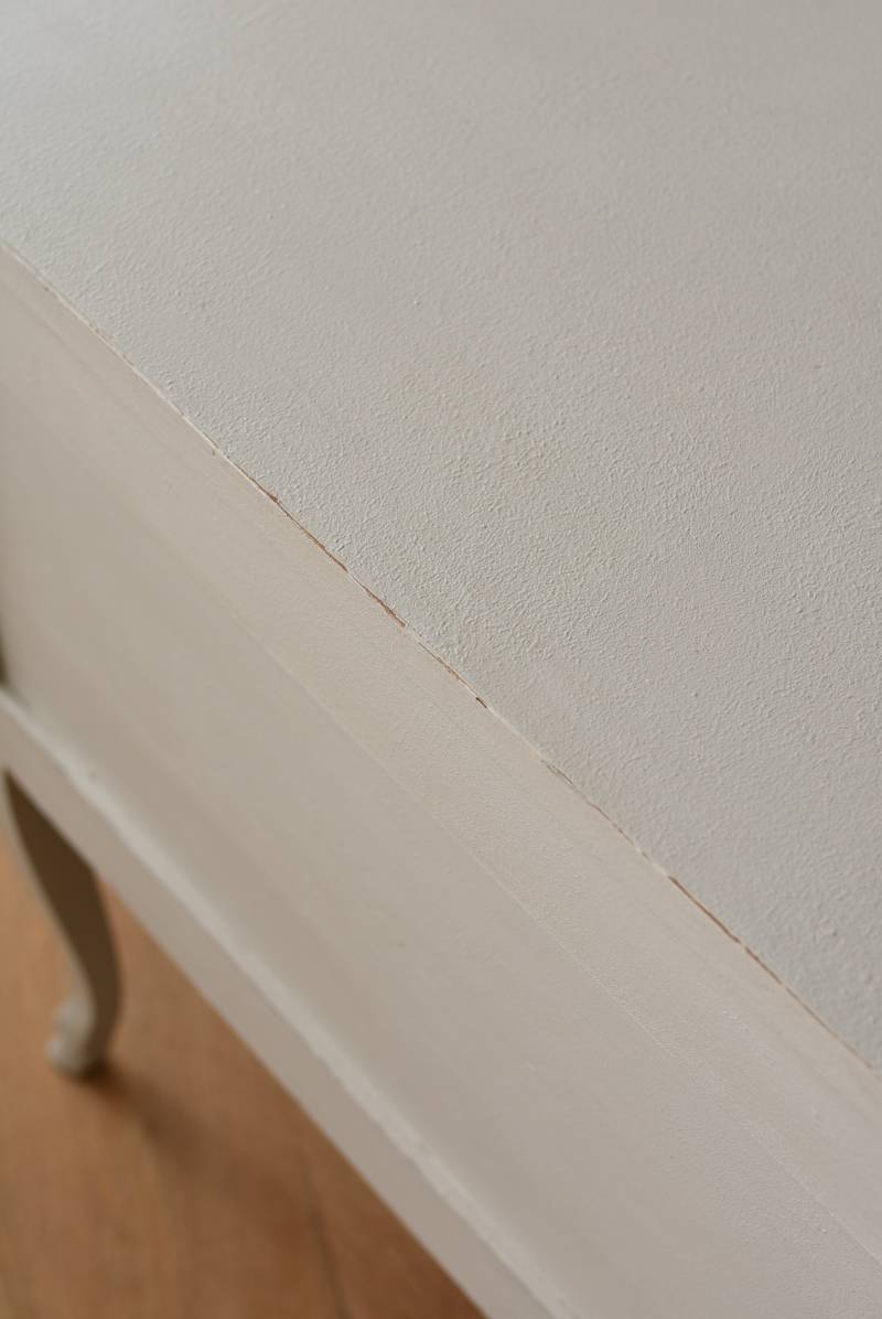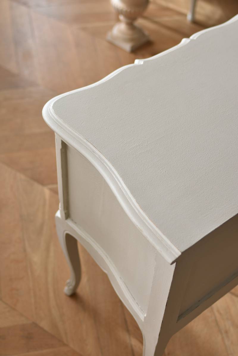 フランスの2段ペイントチェスト。 明るく柔らかなグレーカラーにペイントされたボディにロカイユモチーフの金属取手がアクセントとなった優美なデザイン。すらりとした華奢な脚元や緩やかに波打つボディラインが美しく、フランスらしいエレガントなイメージを空間にもたらしてくれるデザインです。引き出しは2つ設けられており、程よい収納力も備わった逸品に。 比較的小ぶりなサイズでお部屋にも取り入れやすく、上品な色味がフレンチシックな空間にも映えるアイテムです。 W 約73cm D 約45cm H 約77cm 引き出し内寸 W約53.5cm×D約34cm×H約11.5cm こちらの商品の配送について