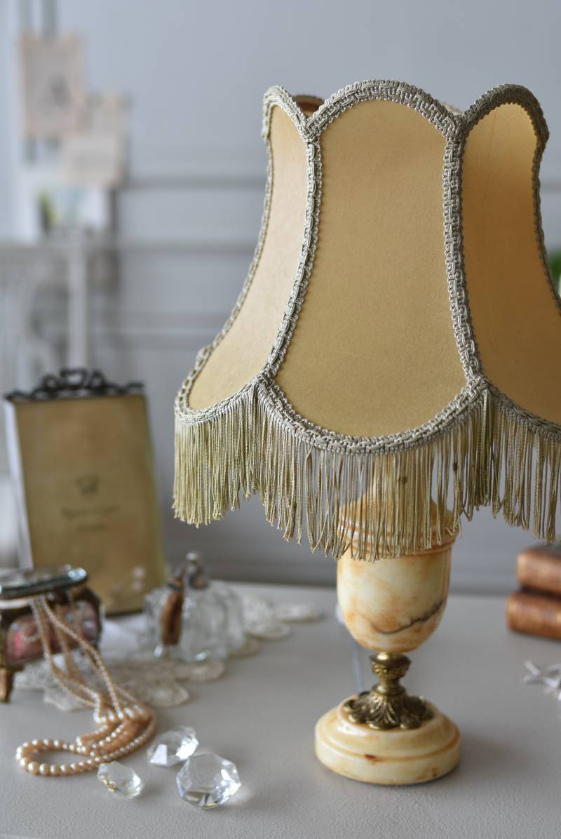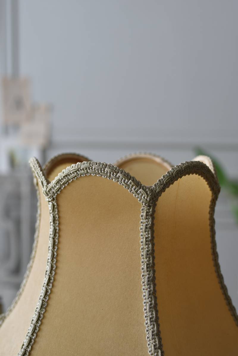 さらりとフリンジが揺れるフランスのテーブルランプ。 温かみのあるベージュカラーのシェードはやや硬めの質感で、ほんのりとした透け感のある朧げな表情が魅力的。土台は凹凸のはっきりとしたシルエットが優雅なストーン製で、アクセントとして入れられた真鍮装飾が気品あるデザインとなっています。明かりを灯すとふんわりとした優しい光を空間に届け、インテリアに奥行きをプラスしてくれるアイテムです。 色味や状態は多少異なりますが同じデザインのランプとシンメトリーに飾るのも雰囲気が出ておすすめです。 ソケット・コード・スイッチは新しい物に交換済みです。 電球は付属しません。 シェード直径 約25cm 土台直径 約8.5cm H 約38cm 電球口径 E17 *60W以下をご使用下さい。