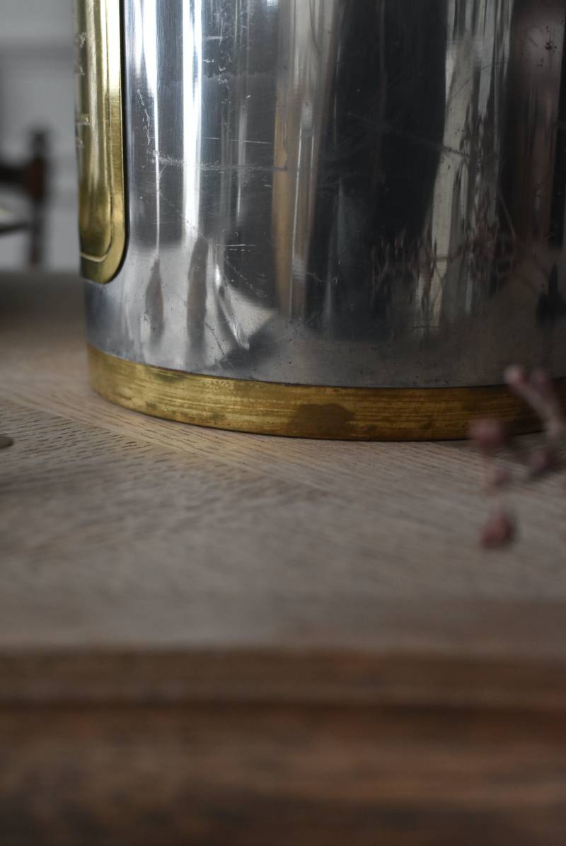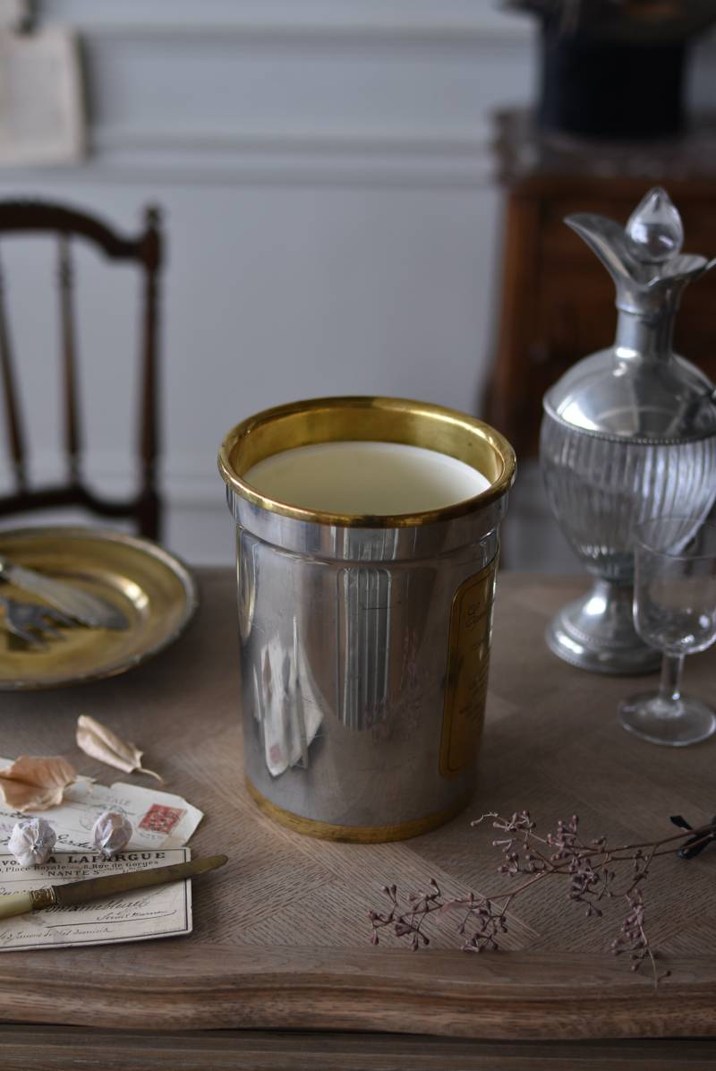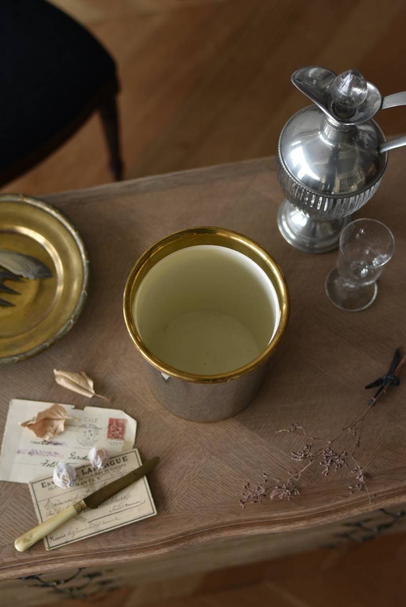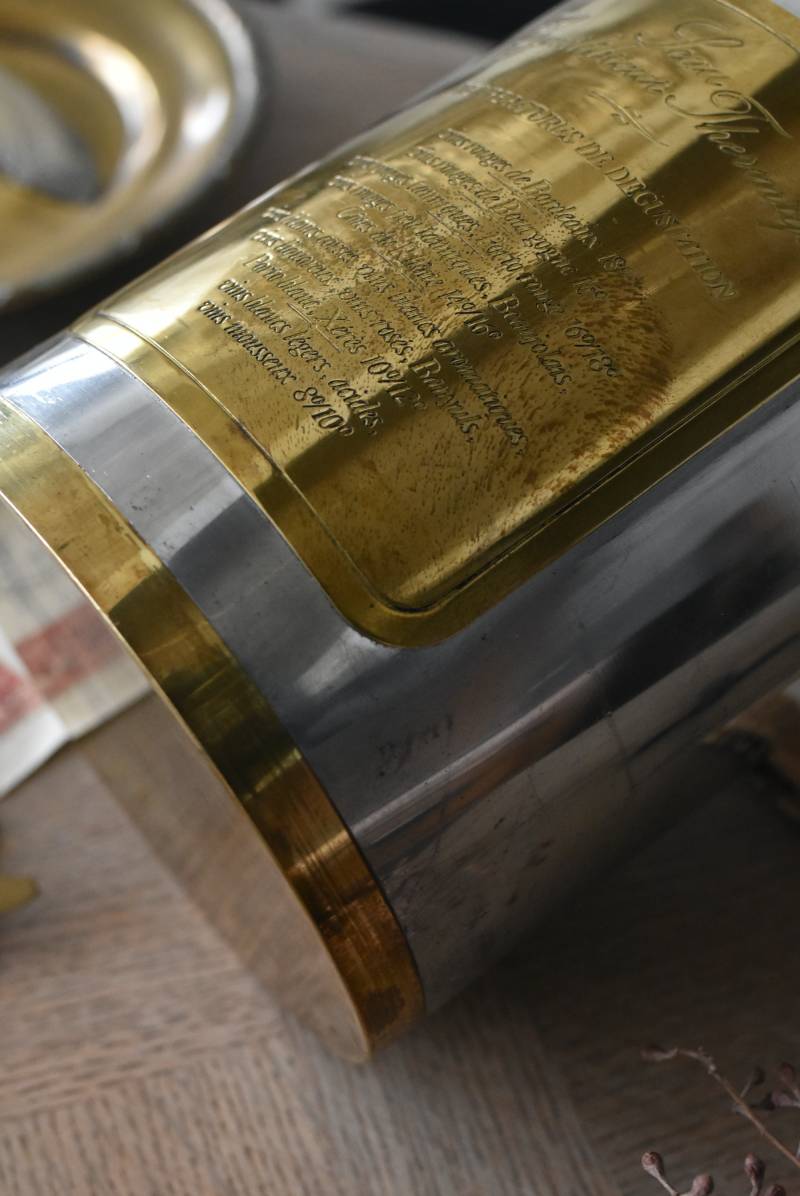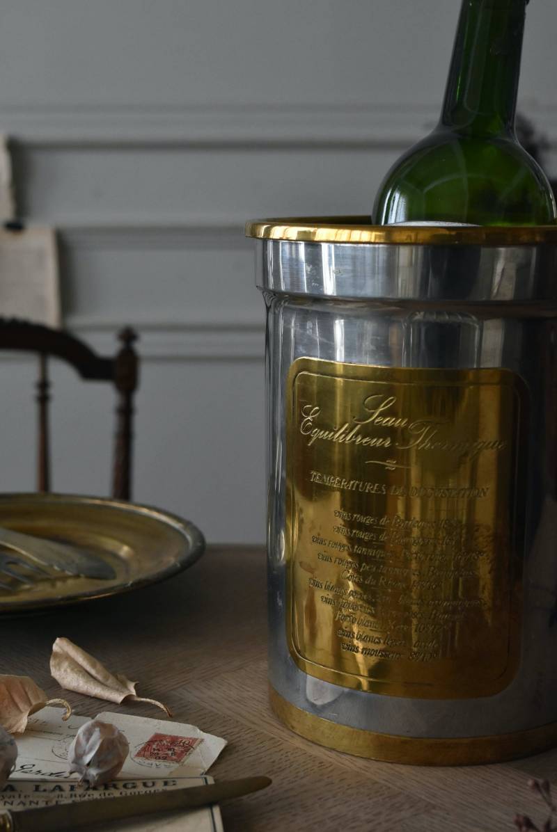 フランス・Les Etains du Manoir社のワインクーラー。 使い込まれた風合いが深みを増すボディのシルバーカラーと、アクセントとして取り入れられたゴールドの配色が凛としたスタイリッシュな装い。正面には様々なワインのサービング温度を記したプレートがあしらわれており、その気品漂うデザインがエレガントでクラシカルな印象をもたらしてくれます。内側のパーツははめ込んでいるのみで簡単に取り外しができ、お手入れもしやすい構造に。 ややスリムなシルエットですがどっしりとした重量があり、ワインボトルを入れても安定感のあるアイテムです。 直径 約15cm H 約19.5cm 口径 約13cm
