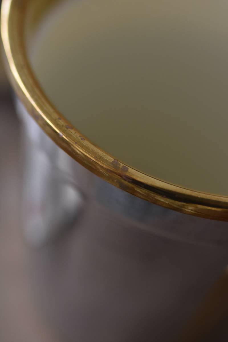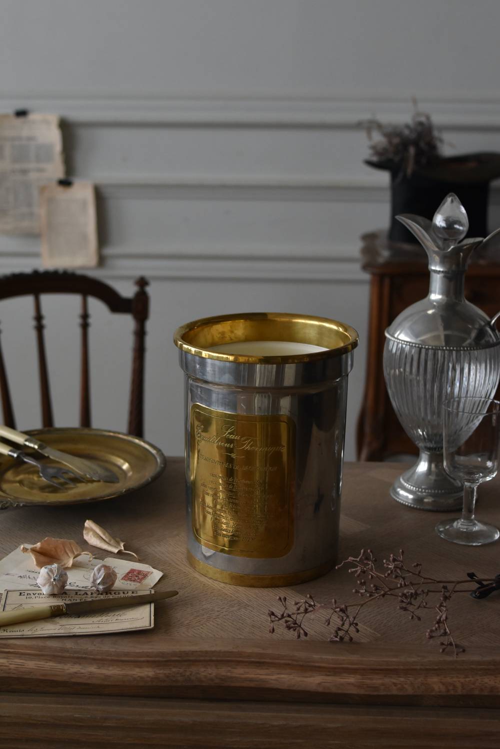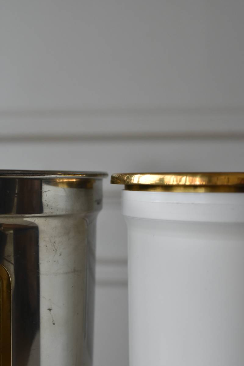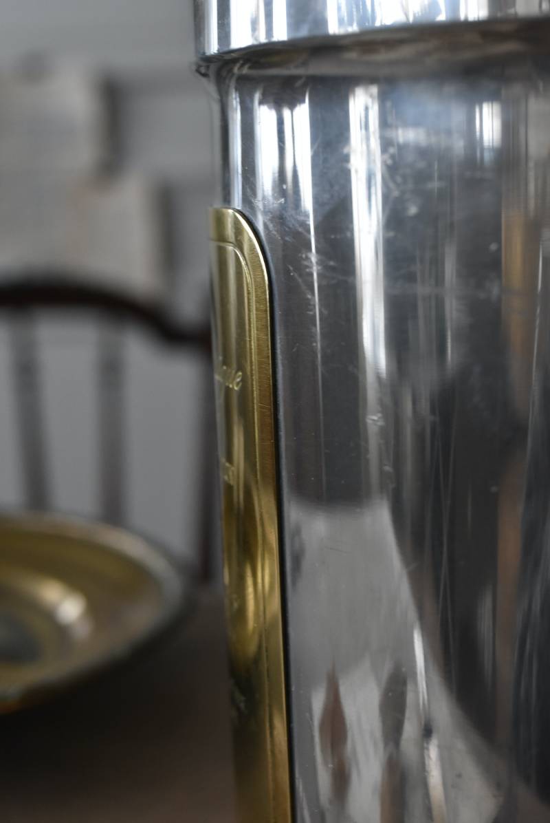 フランス・Les Etains du Manoir社のワインクーラー。 使い込まれた風合いが深みを増すボディのシルバーカラーと、アクセントとして取り入れられたゴールドの配色が凛としたスタイリッシュな装い。正面には様々なワインのサービング温度を記したプレートがあしらわれており、その気品漂うデザインがエレガントでクラシカルな印象をもたらしてくれます。内側のパーツははめ込んでいるのみで簡単に取り外しができ、お手入れもしやすい構造に。 ややスリムなシルエットですがどっしりとした重量があり、ワインボトルを入れても安定感のあるアイテムです。 直径 約15cm H 約19.5cm 口径 約13cm