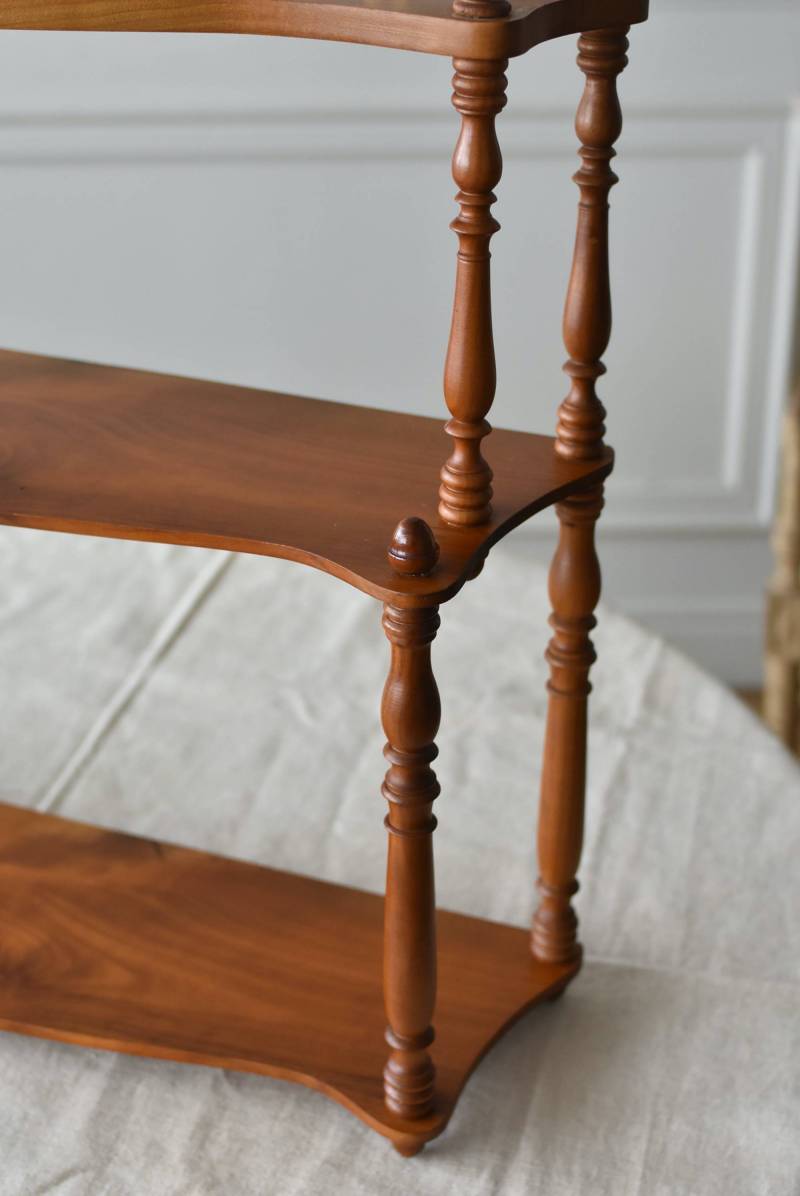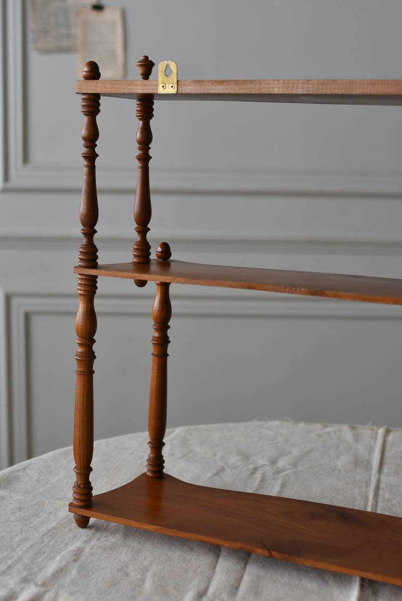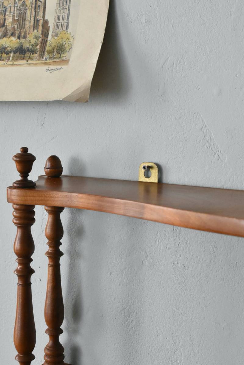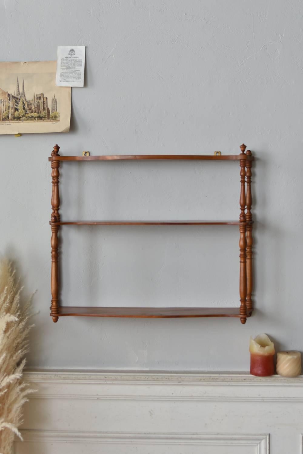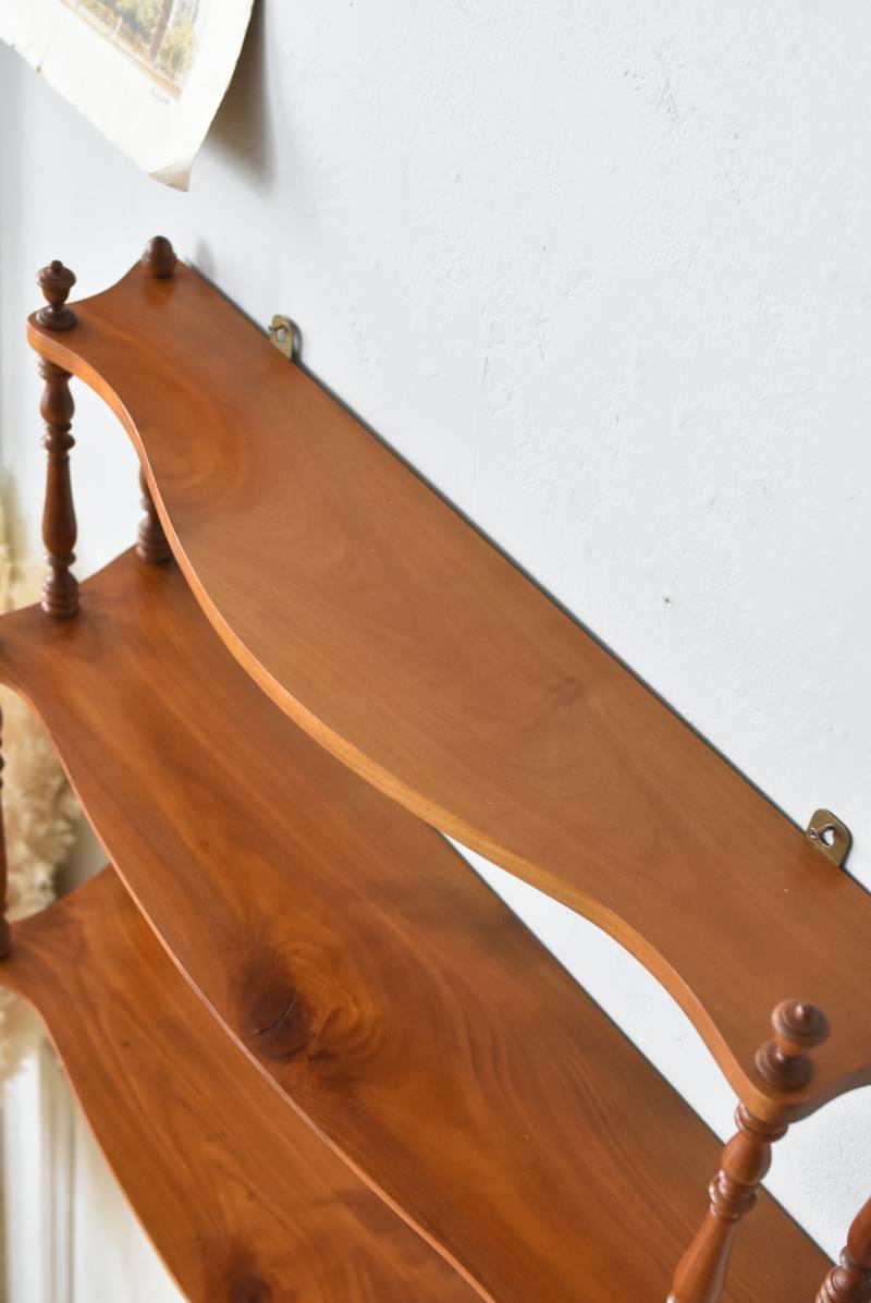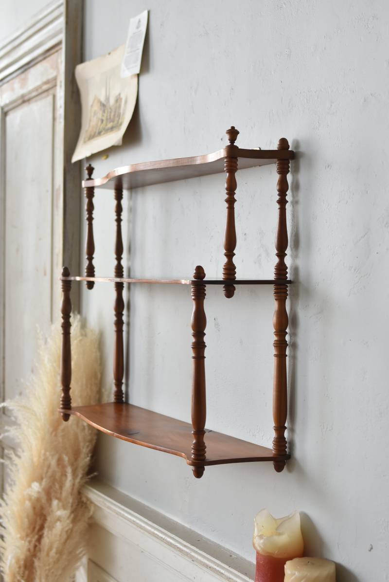 フランスの3段ウォールシェルフ。 柔らかで明るいブラウンカラーの木材で構成されたナチュラルな姿で、どこかほっこりとした温かみを感じられる佇まい。細やかな凹凸を描く支柱や穏やかに波打つ棚板ラインが魅力の一つで、壁面に奥行きをプラスしてくれるデザインとなっています。 真鍮製の金具で壁面に掛け、お気に入りの雑貨などを並べて壁面ディスプレイをより素敵に演出してくれるアイテムです。 W 約65cm D 約16.5cm H 約54cm 棚板間隔(上から) 約19cm/約27cm 重量 約2kg
