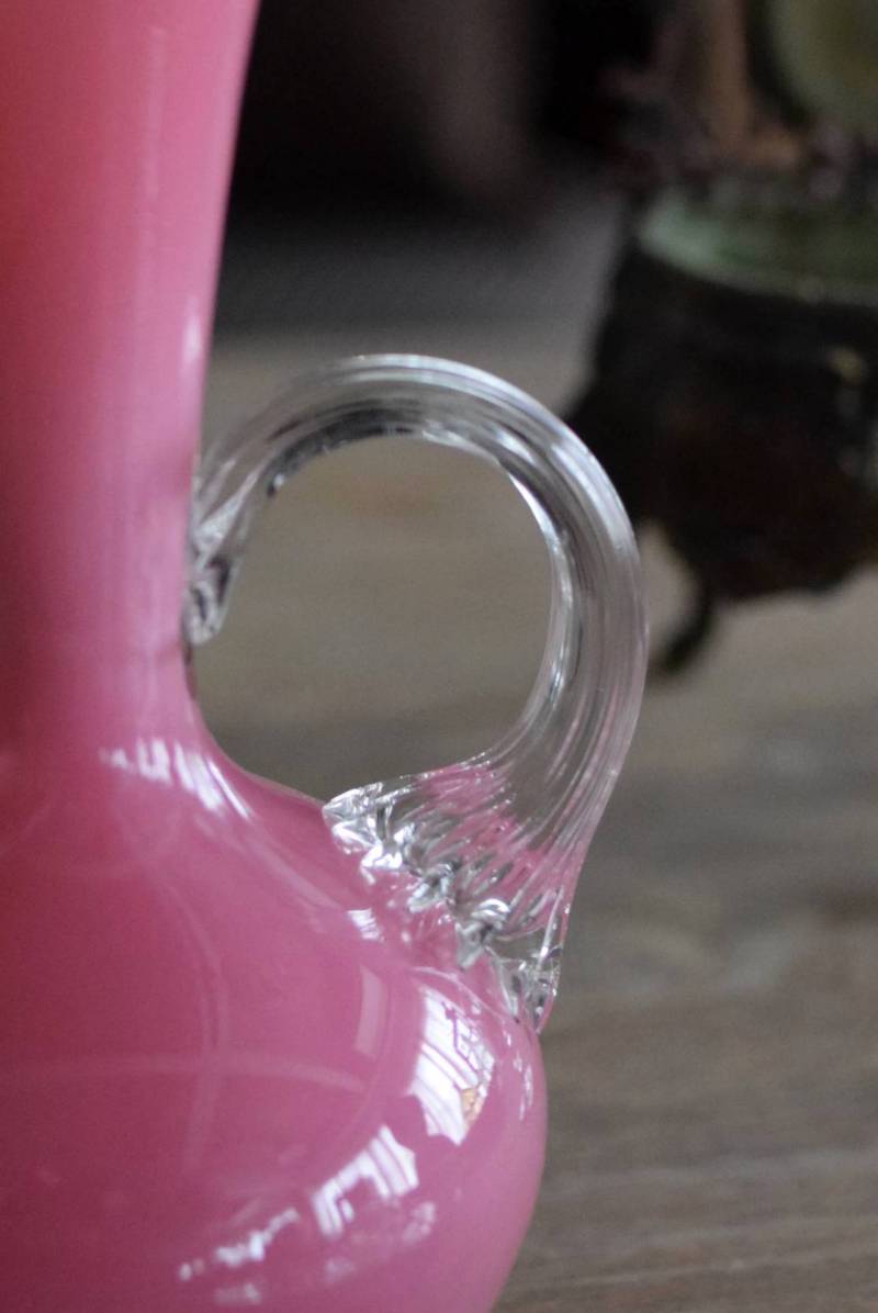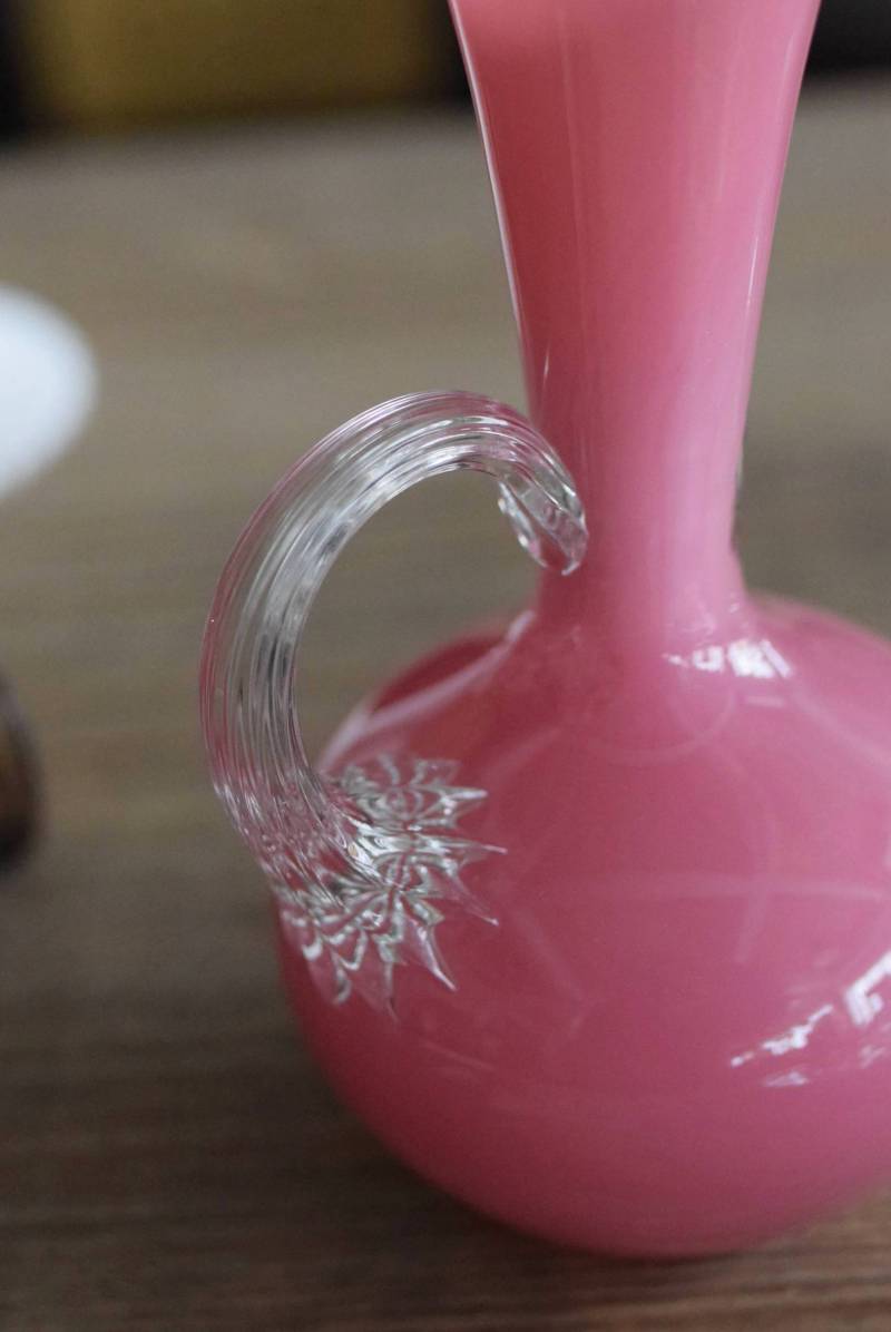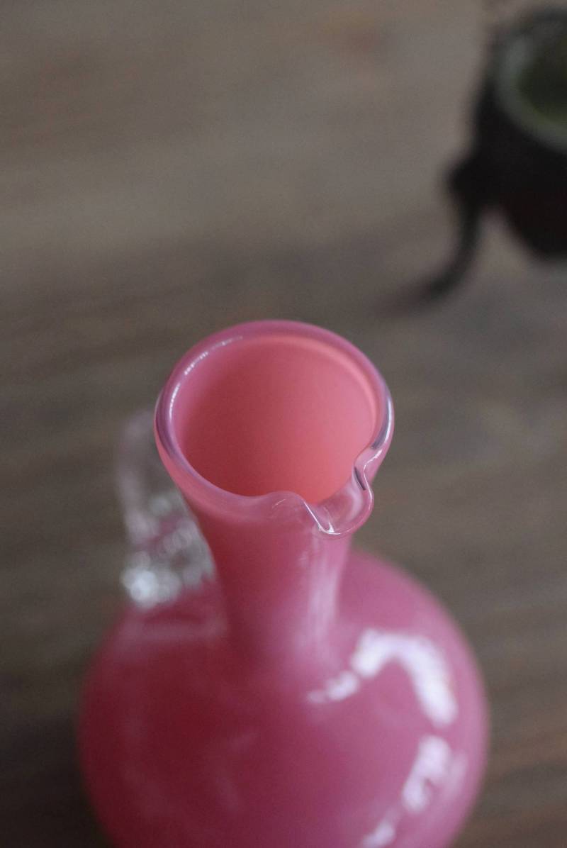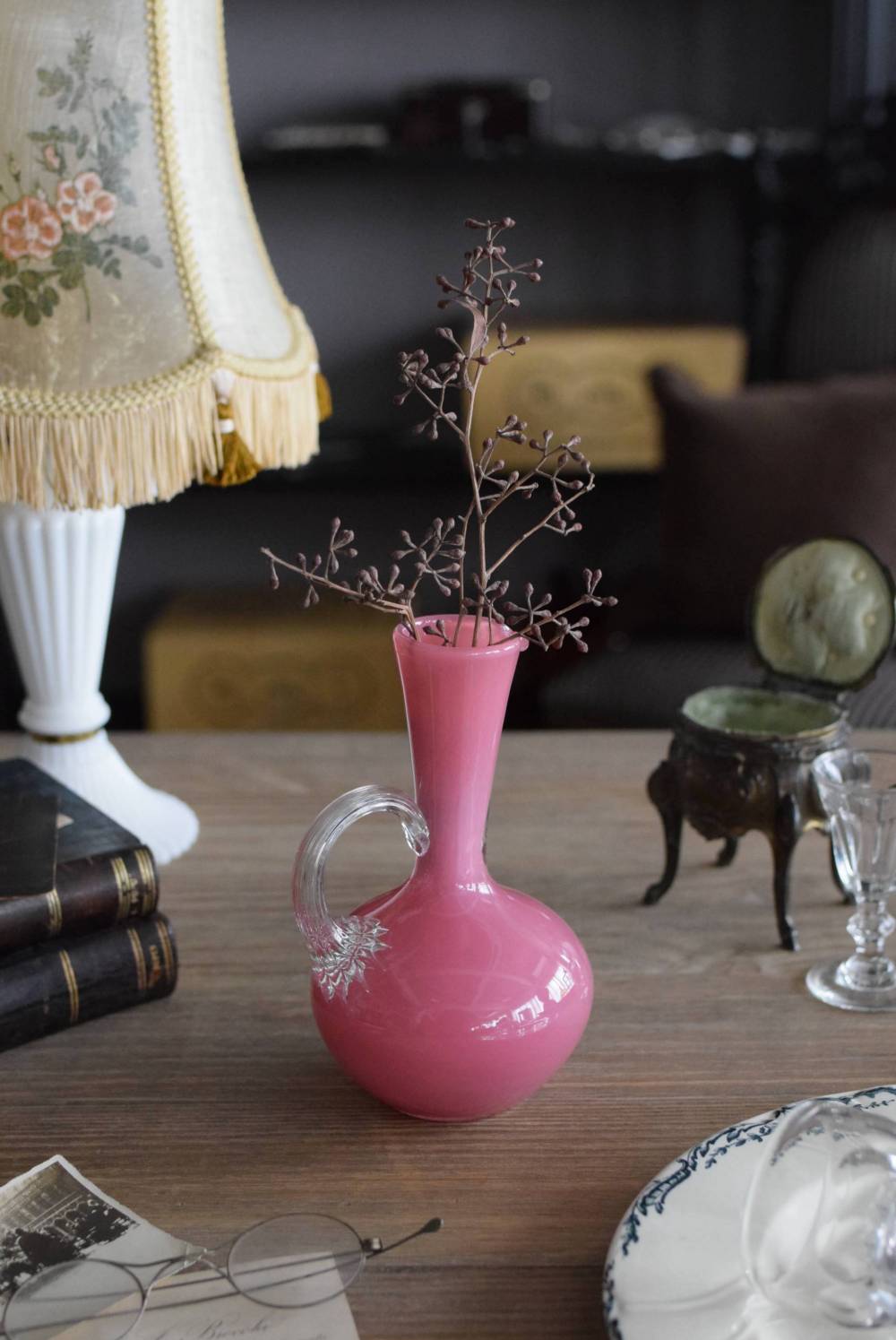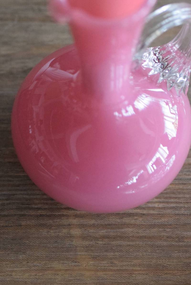 華やかなピンクが印象的な姿で、小ぶりなサイズ感ながら空間に映える一品。ピンクのガラスの上に、さらにクリアのガラスを纏わせたような厚みのある作りで、艶やかな表情を持ち、取手部分は氷のような儚げな美しさも感じられます。