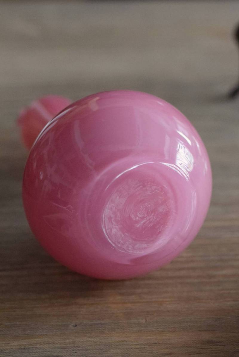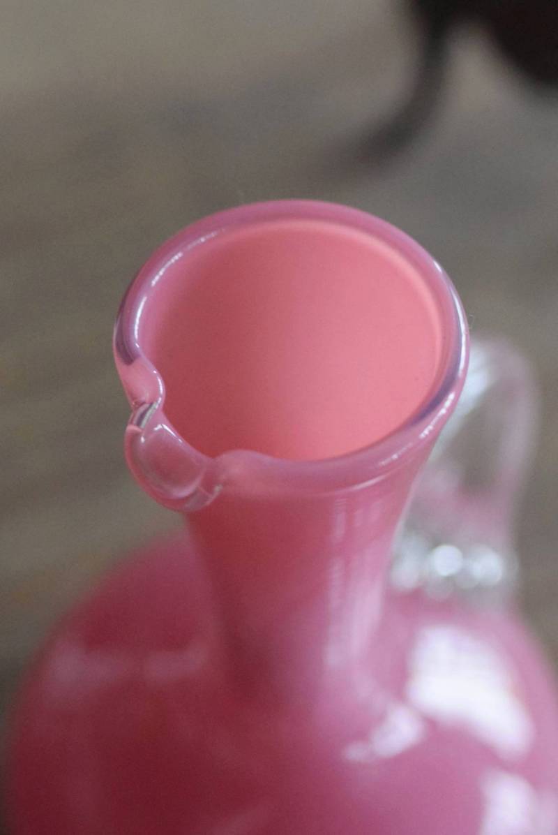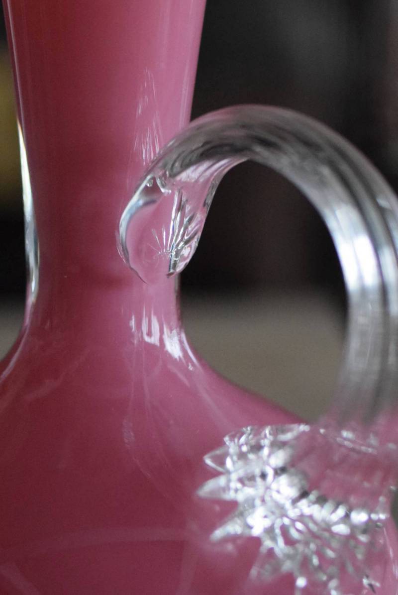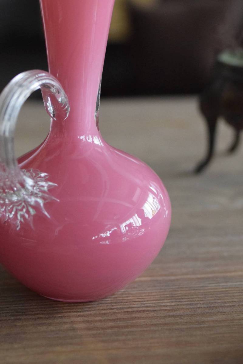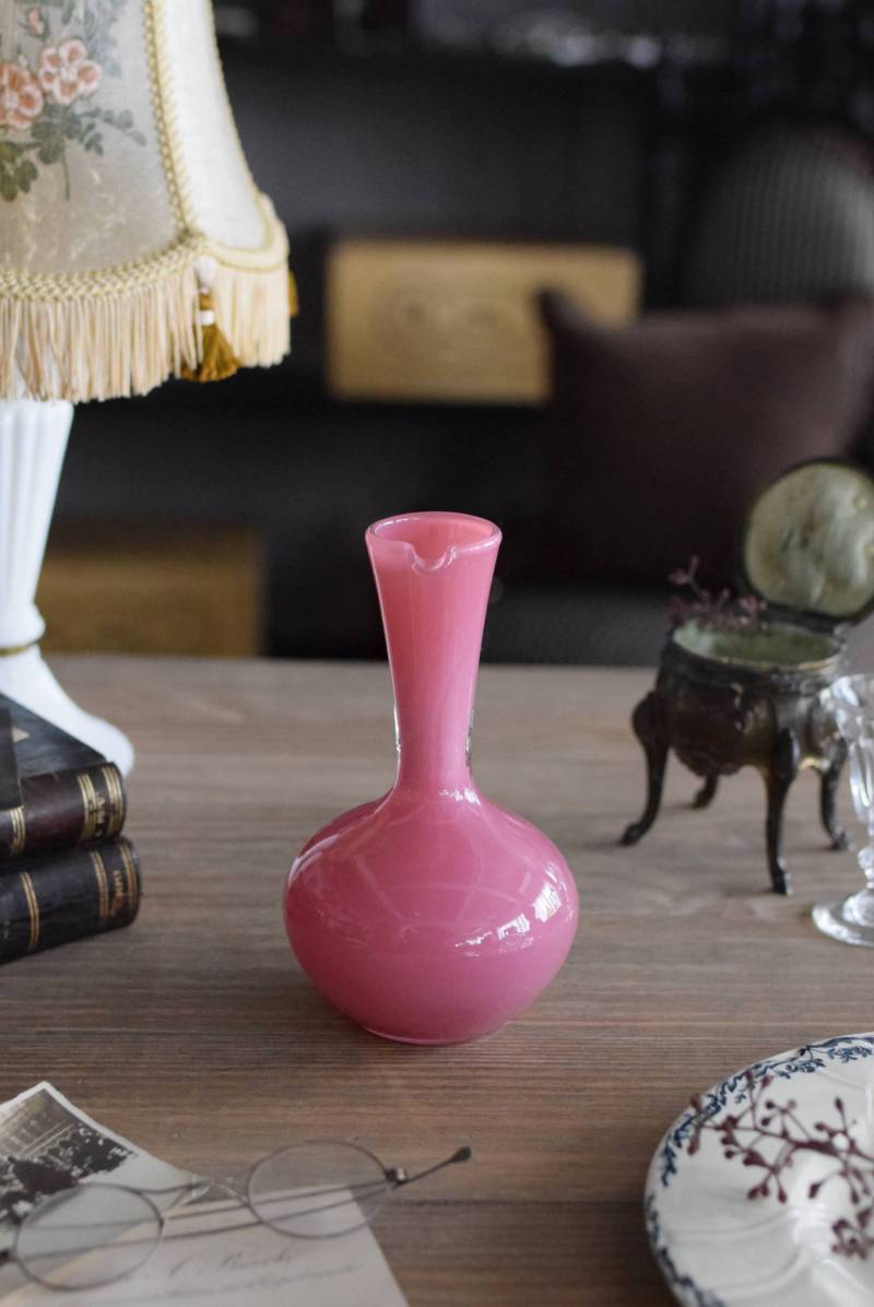 華やかなピンクが印象的な姿で、小ぶりなサイズ感ながら空間に映える一品。ピンクのガラスの上に、さらにクリアのガラスを纏わせたような厚みのある作りで、艶やかな表情を持ち、取手部分は氷のような儚げな美しさも感じられます。