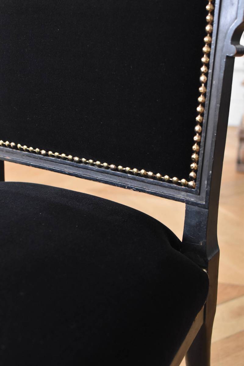 フランスのアンティークチャイルドチェア。 キリッと角ばったシルエットの背もたれにもファブリックが張られ、シックなブラックカラーにまとまった高級感のある雰囲気が漂います。脚元は、中央にぷっくりとした丸みのある装飾が合わさった柱を模したようなラインがずらりと並ぶリズミカルなデザインとなっています。 フレームは一度パーツ毎にバラしてから、しっかりと組み直しを行っています。座面のファブリックは新しく張り直し、中もウレタンに交換済みで、沈み込みすぎない座り心地です。小ぶりながらも芸術性の高い姿は置いているだけでも上品な存在感を放ってくれます。 W 約45.5cm D 約44cm H 約70cm 座面までH 約38cm