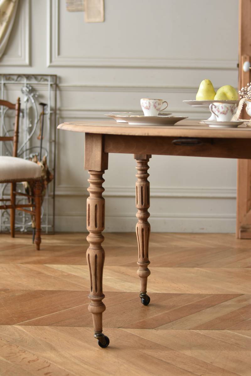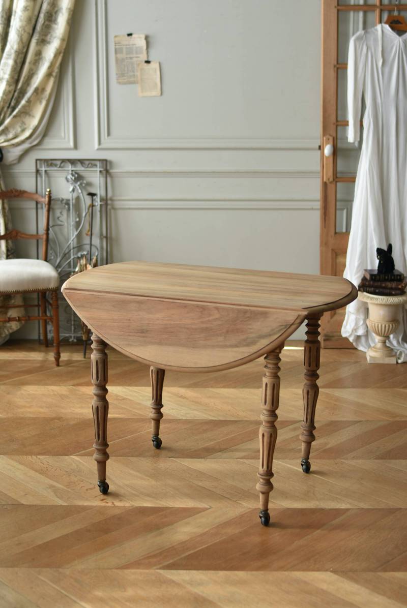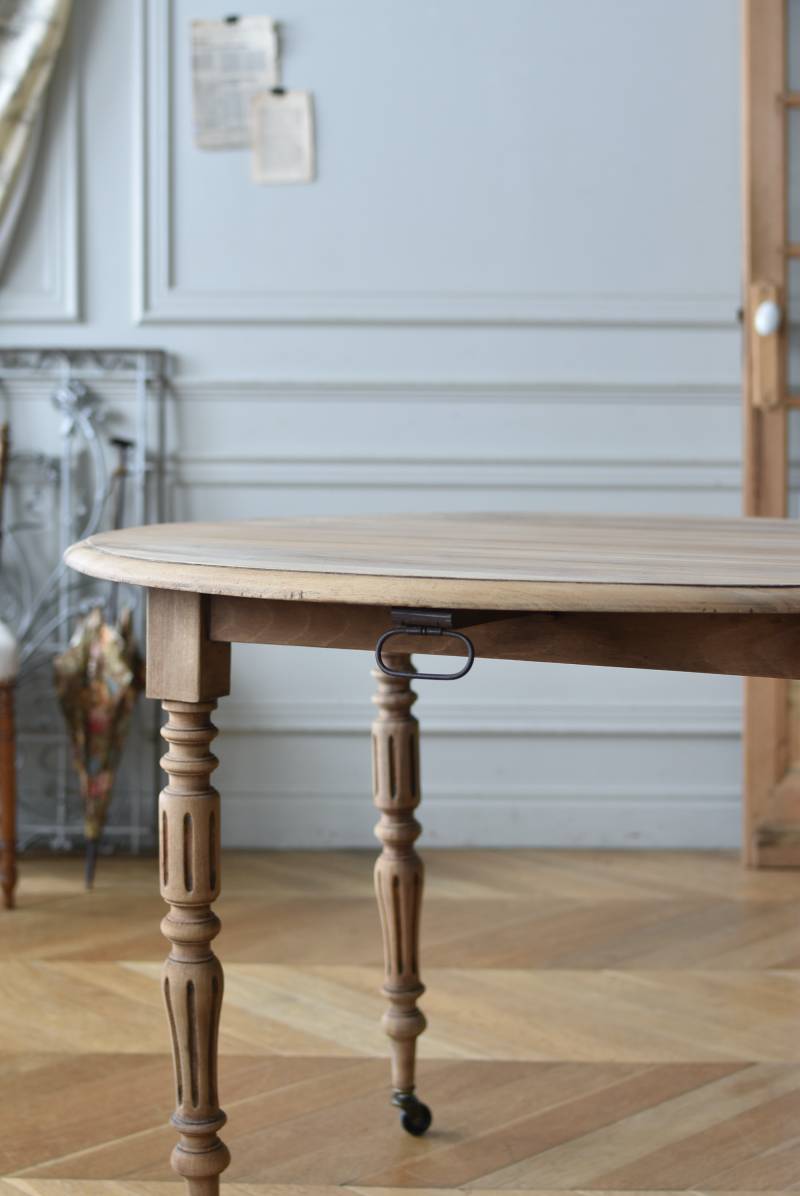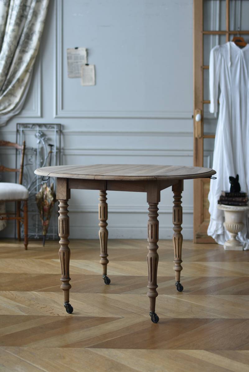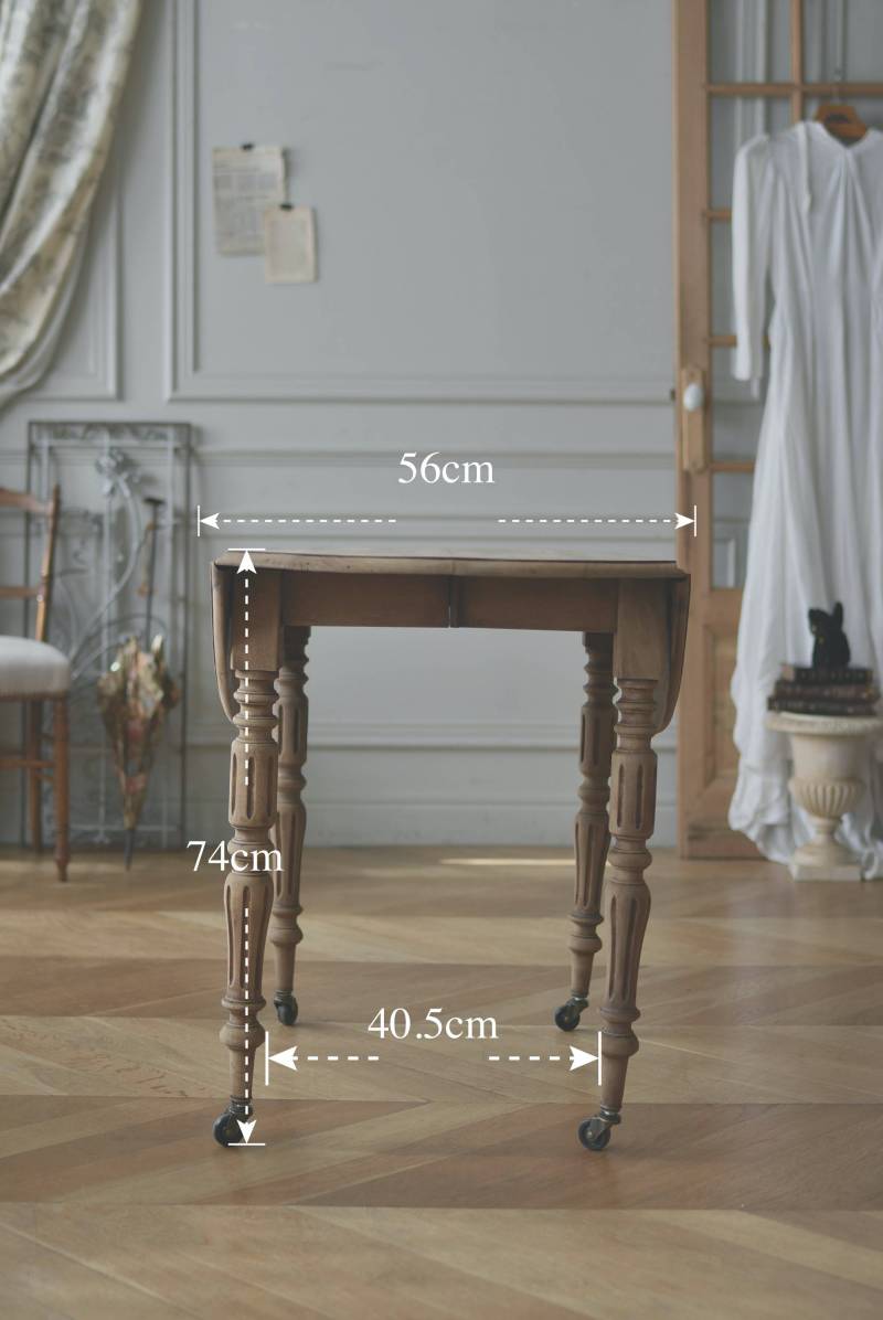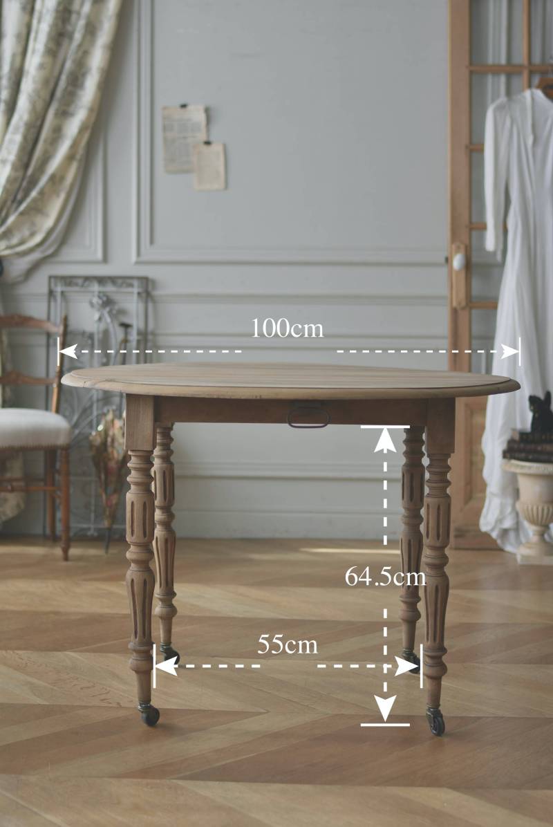 フランスのバタフライテーブル。 剥離された木肌は明るい色味で、ほっこりとした素朴な印象をもたらしてくれる佇まい。丸い天板が柔らかな雰囲気を空間に漂わせ、凹凸のはっきりとした脚元が目を惹く特徴的なデザインとなっています。両サイドの天板は蝶々の羽のようにパタンと折り畳む事ができ、シーンに合わせて天板の広さを変えてお楽しみいただける機能的な一面も。脚先にはキャスターが取り付けられており、移動もスムーズに行えます。 ダイニングテーブルとしてはもちろん、片面を折り畳んでコンソールテーブルとしてアレンジするのもおすすめのアイテムです。 W 約100cm D 約97.5cm (折りたたみ時 約56cm) H 約74cm 幕板までのH 約64.5cm 搬入経路について こちらの商品の配送について