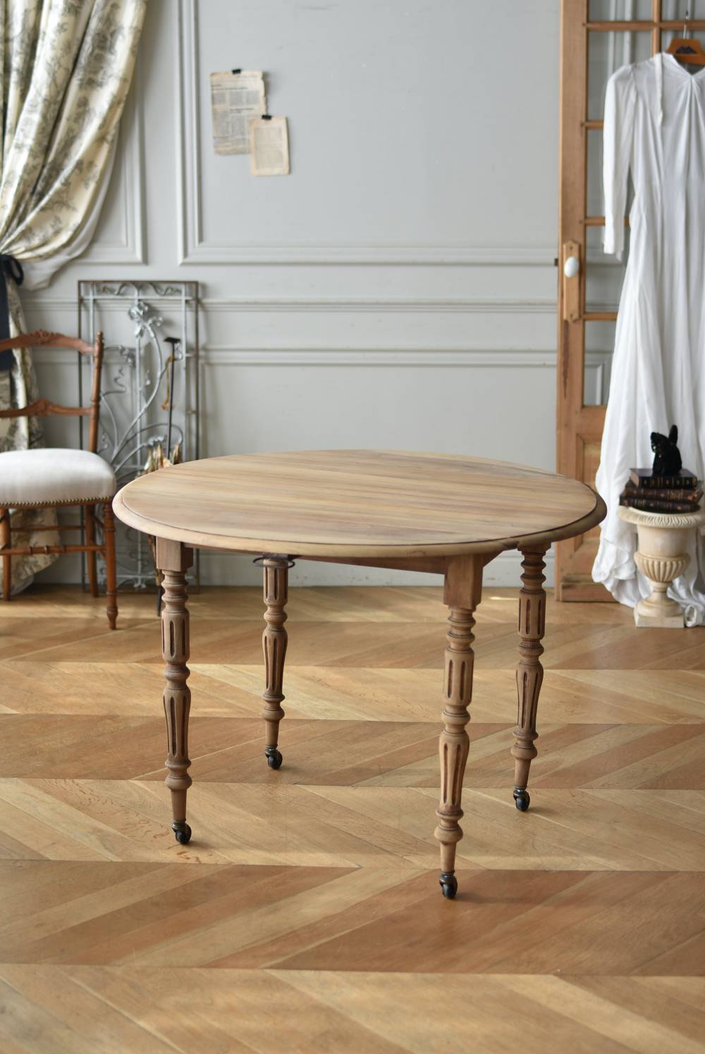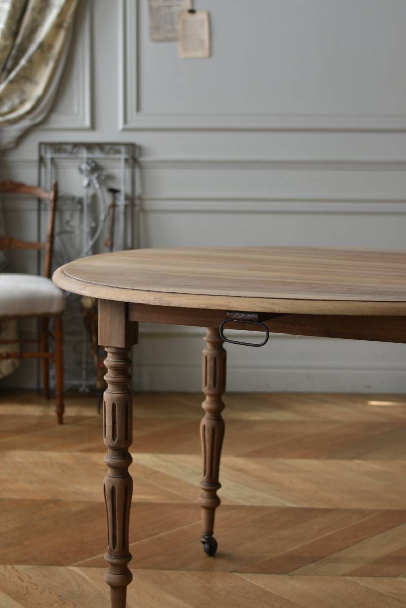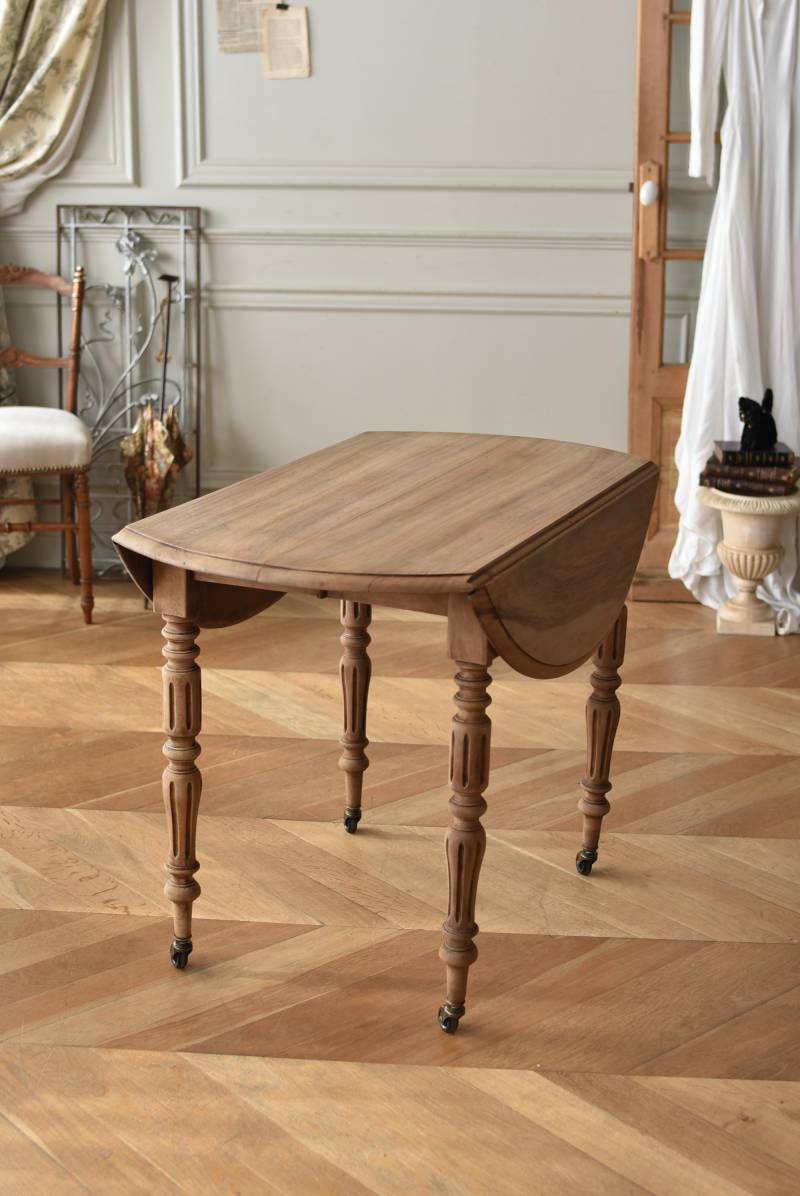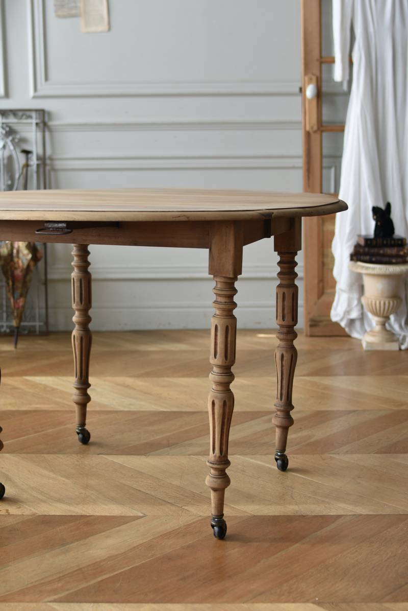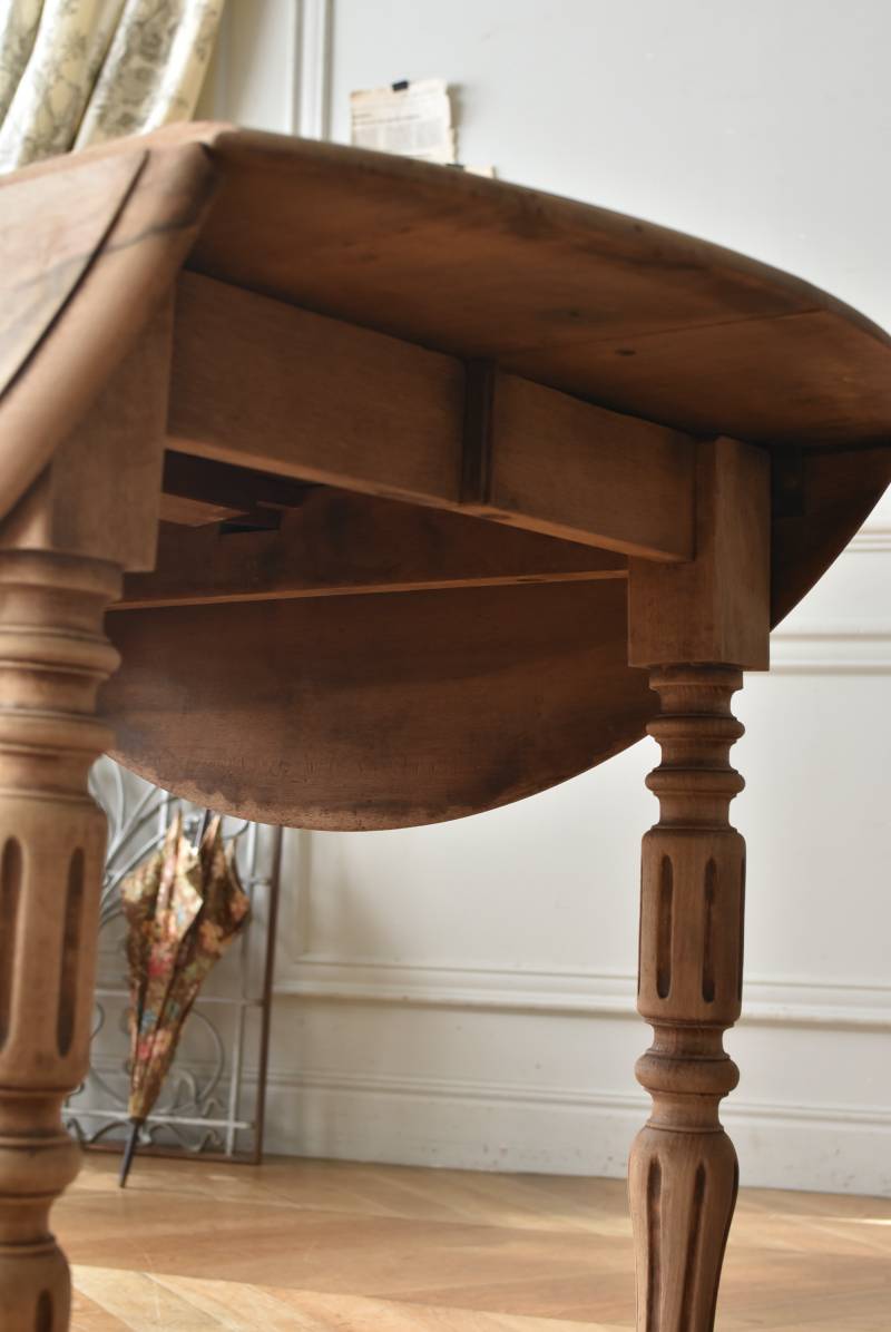 フランスのバタフライテーブル。 剥離された木肌は明るい色味で、ほっこりとした素朴な印象をもたらしてくれる佇まい。丸い天板が柔らかな雰囲気を空間に漂わせ、凹凸のはっきりとした脚元が目を惹く特徴的なデザインとなっています。両サイドの天板は蝶々の羽のようにパタンと折り畳む事ができ、シーンに合わせて天板の広さを変えてお楽しみいただける機能的な一面も。脚先にはキャスターが取り付けられており、移動もスムーズに行えます。 ダイニングテーブルとしてはもちろん、片面を折り畳んでコンソールテーブルとしてアレンジするのもおすすめのアイテムです。 W 約100cm D 約97.5cm (折りたたみ時 約56cm) H 約74cm 幕板までのH 約64.5cm 搬入経路について こちらの商品の配送について