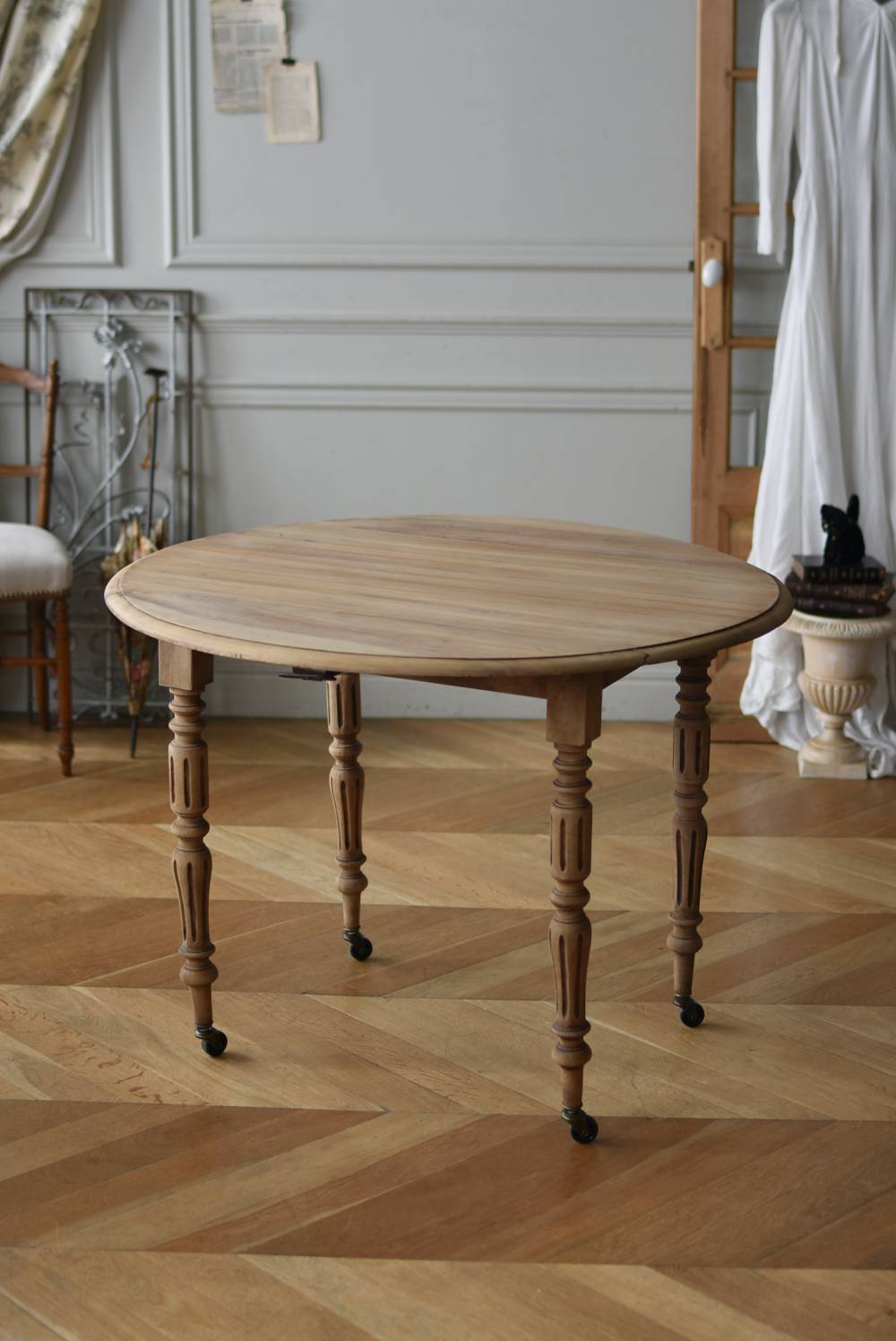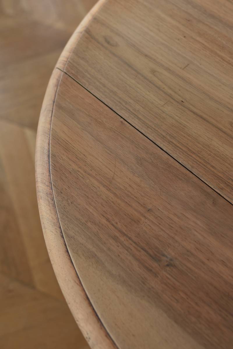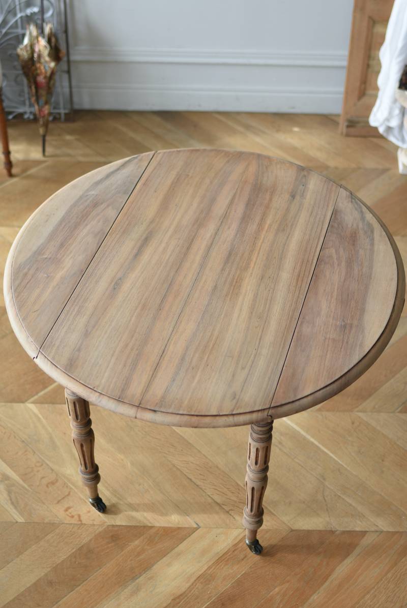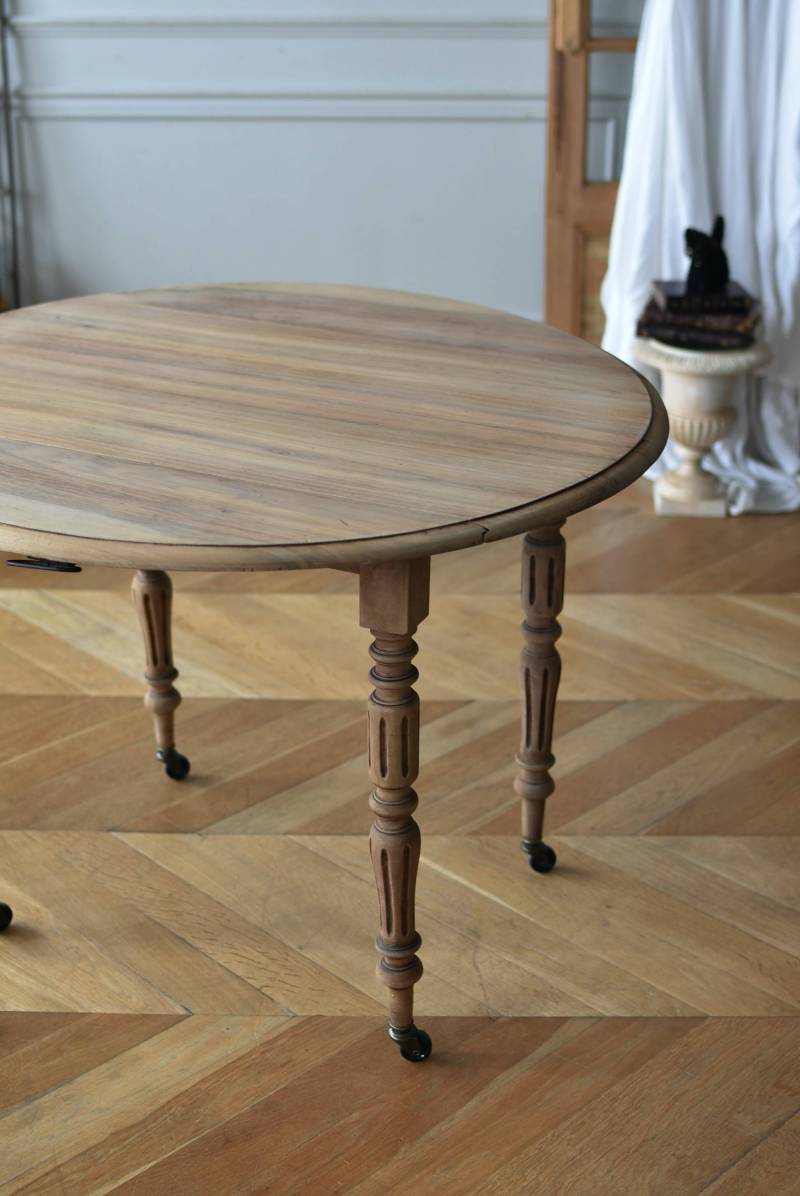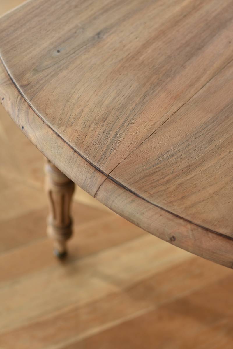 フランスのバタフライテーブル。 剥離された木肌は明るい色味で、ほっこりとした素朴な印象をもたらしてくれる佇まい。丸い天板が柔らかな雰囲気を空間に漂わせ、凹凸のはっきりとした脚元が目を惹く特徴的なデザインとなっています。両サイドの天板は蝶々の羽のようにパタンと折り畳む事ができ、シーンに合わせて天板の広さを変えてお楽しみいただける機能的な一面も。脚先にはキャスターが取り付けられており、移動もスムーズに行えます。 ダイニングテーブルとしてはもちろん、片面を折り畳んでコンソールテーブルとしてアレンジするのもおすすめのアイテムです。 W 約100cm D 約97.5cm (折りたたみ時 約56cm) H 約74cm 幕板までのH 約64.5cm 搬入経路について こちらの商品の配送について