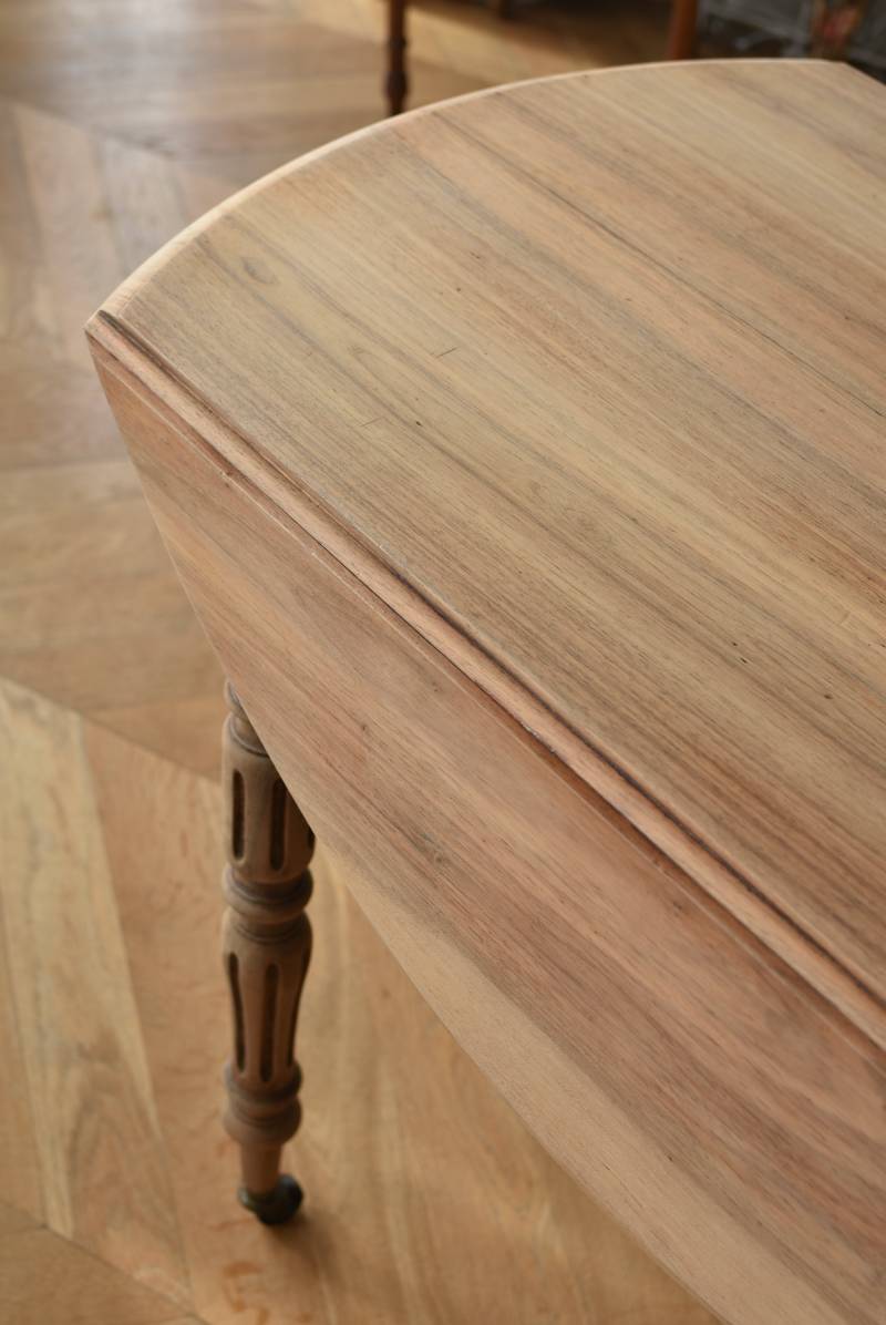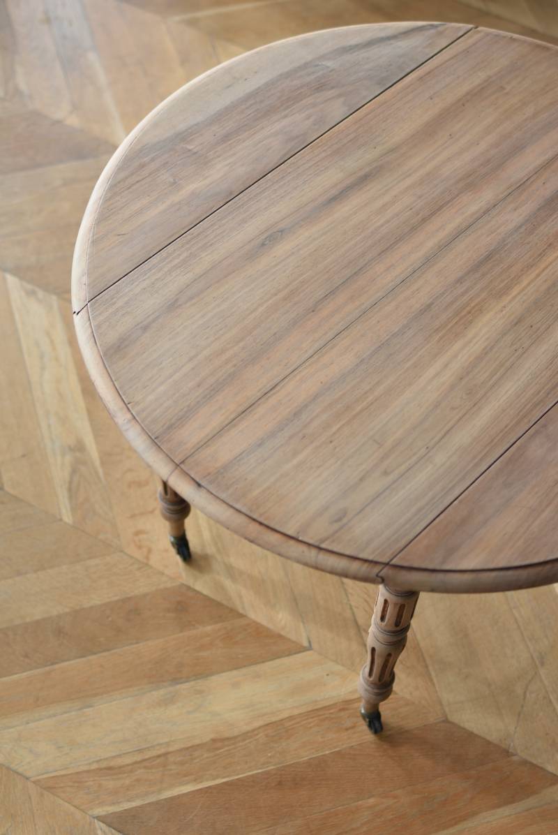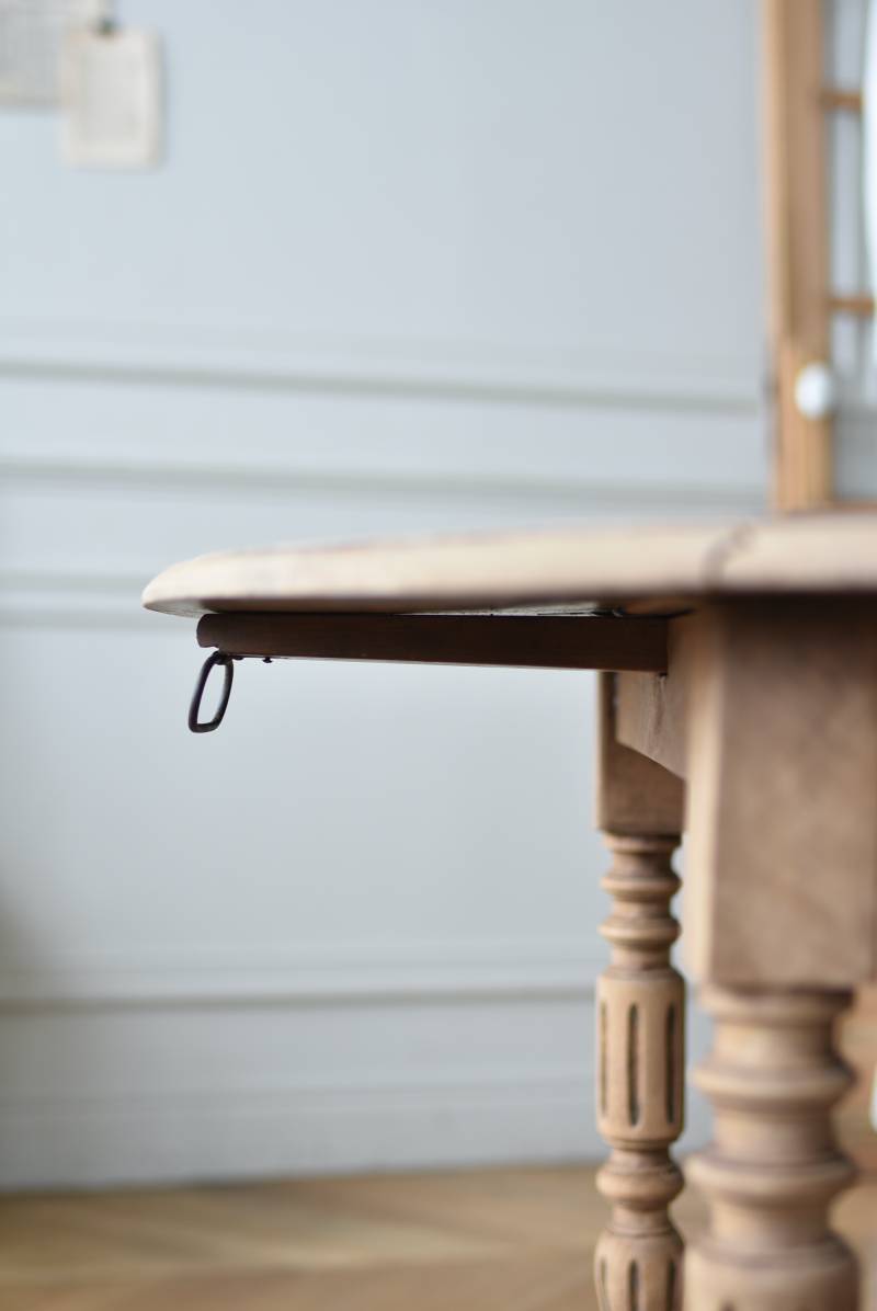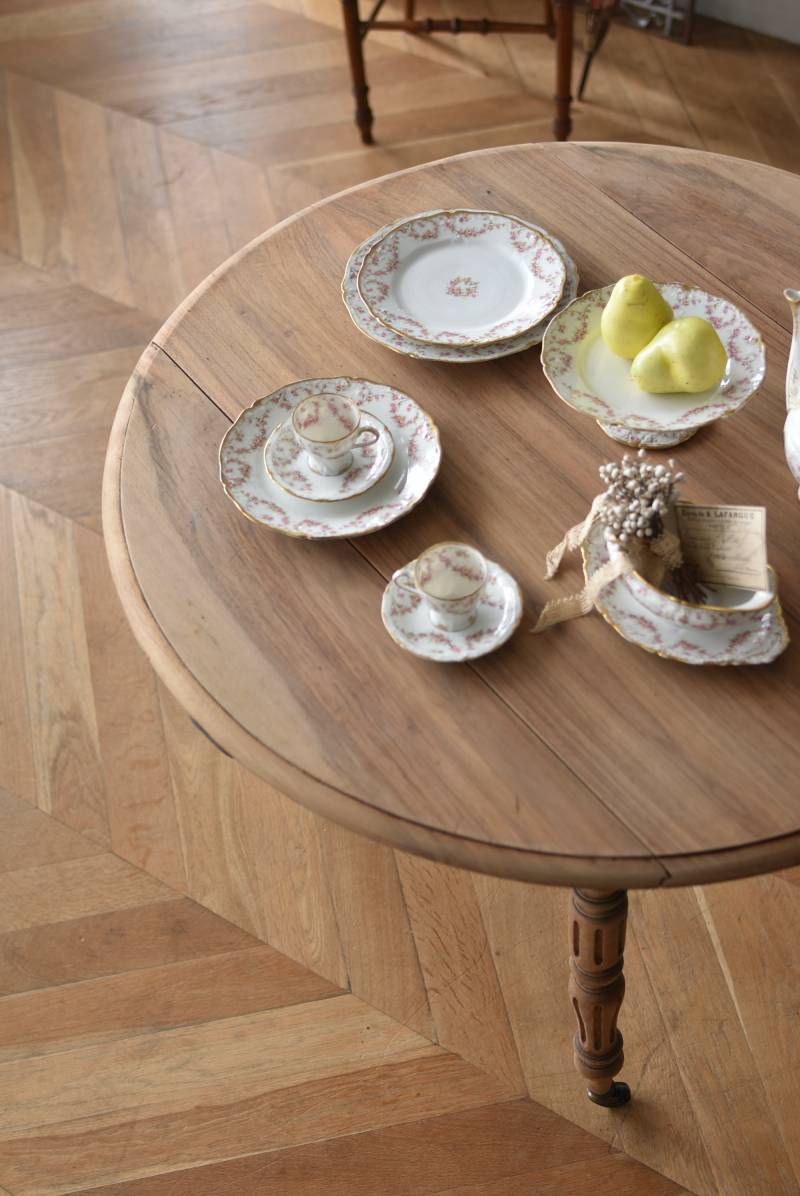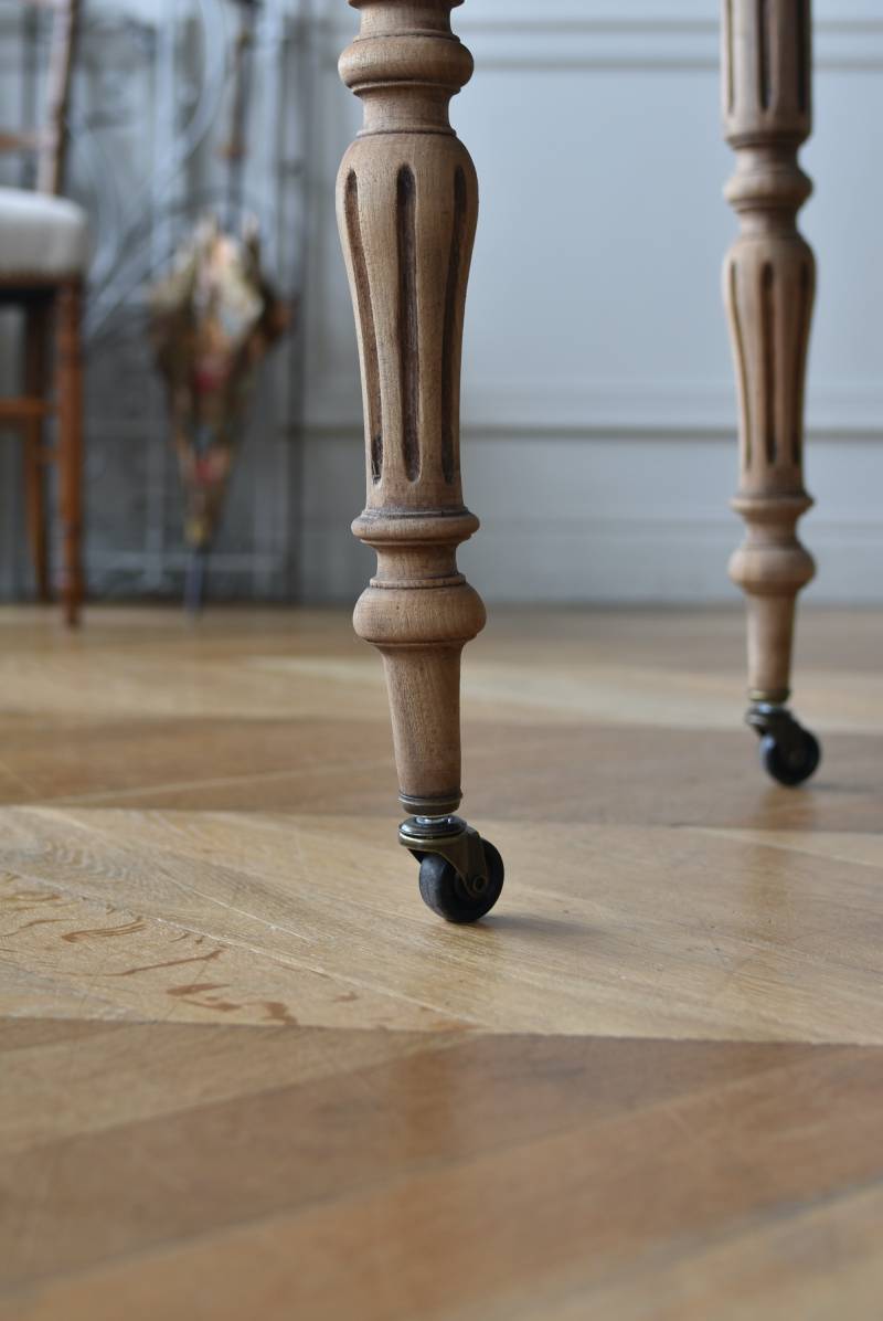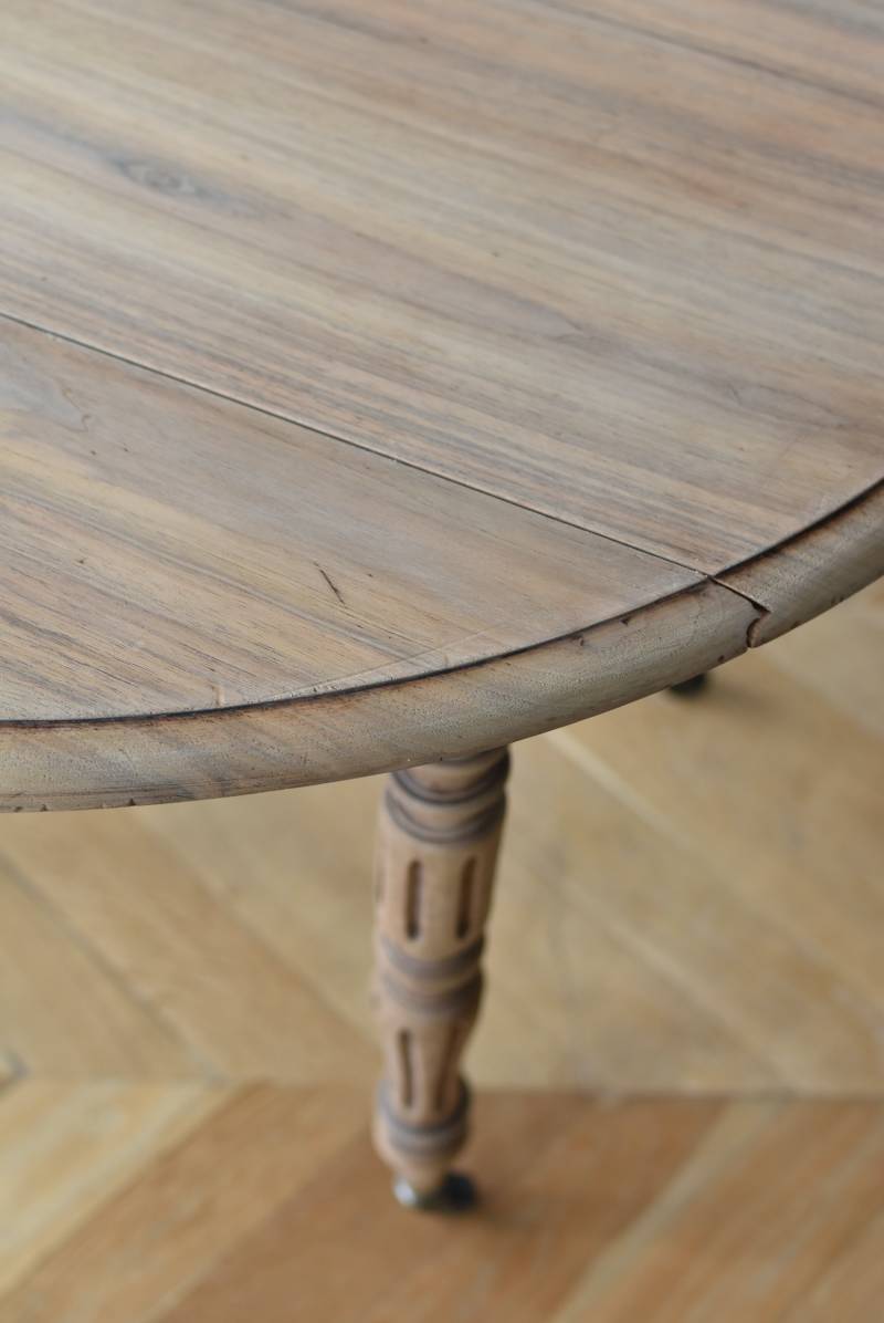 フランスのバタフライテーブル。 剥離された木肌は明るい色味で、ほっこりとした素朴な印象をもたらしてくれる佇まい。丸い天板が柔らかな雰囲気を空間に漂わせ、凹凸のはっきりとした脚元が目を惹く特徴的なデザインとなっています。両サイドの天板は蝶々の羽のようにパタンと折り畳む事ができ、シーンに合わせて天板の広さを変えてお楽しみいただける機能的な一面も。脚先にはキャスターが取り付けられており、移動もスムーズに行えます。 ダイニングテーブルとしてはもちろん、片面を折り畳んでコンソールテーブルとしてアレンジするのもおすすめのアイテムです。 W 約100cm D 約97.5cm (折りたたみ時 約56cm) H 約74cm 幕板までのH 約64.5cm 搬入経路について こちらの商品の配送について