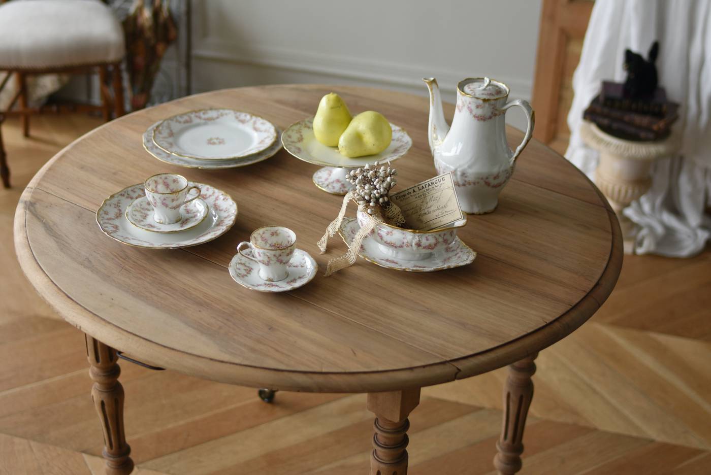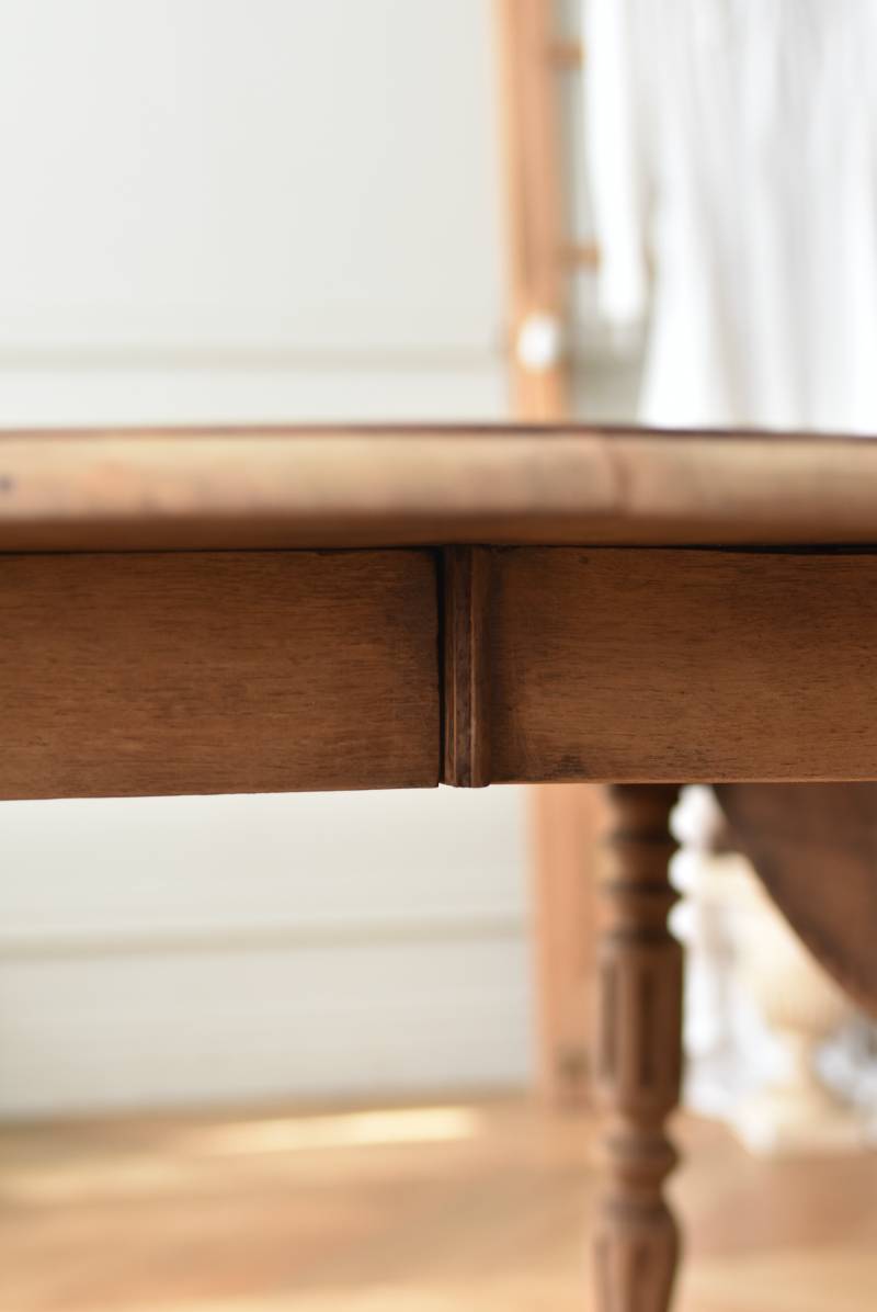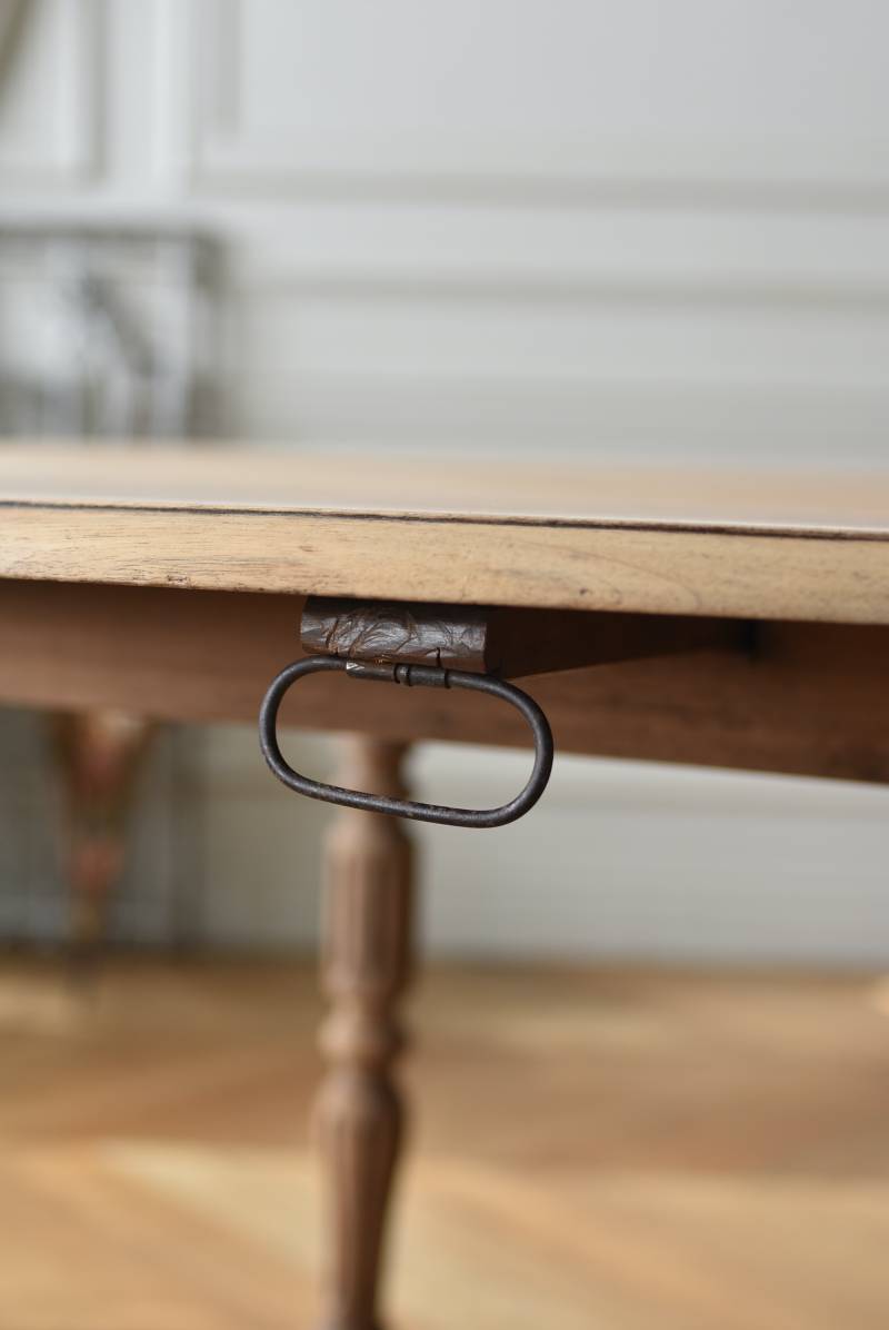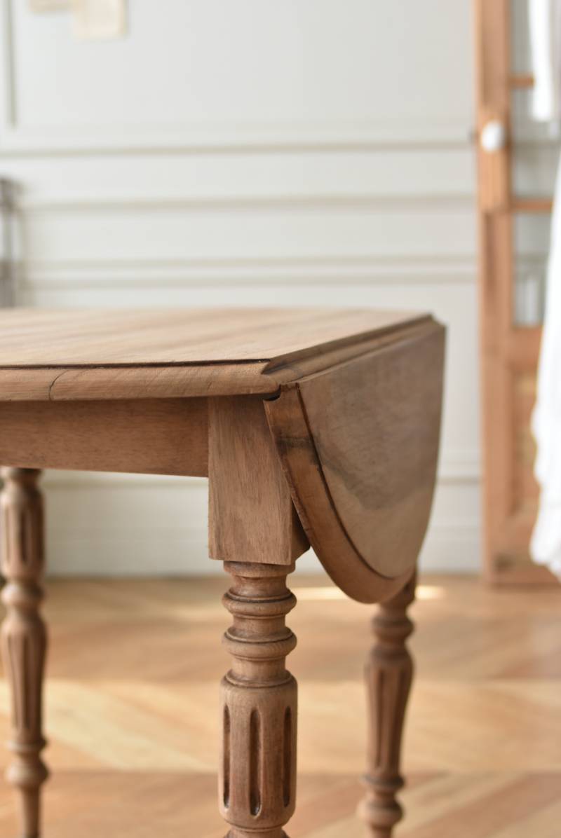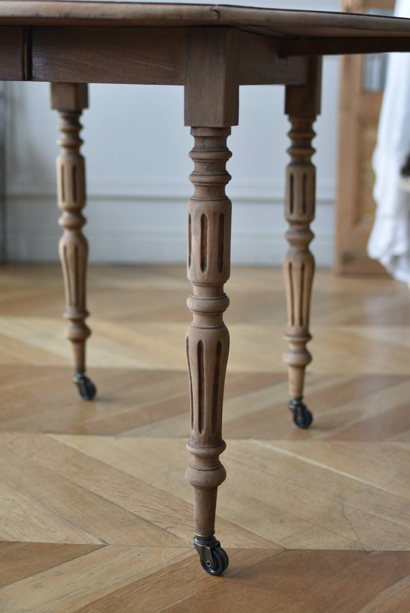 フランスのバタフライテーブル。 剥離された木肌は明るい色味で、ほっこりとした素朴な印象をもたらしてくれる佇まい。丸い天板が柔らかな雰囲気を空間に漂わせ、凹凸のはっきりとした脚元が目を惹く特徴的なデザインとなっています。両サイドの天板は蝶々の羽のようにパタンと折り畳む事ができ、シーンに合わせて天板の広さを変えてお楽しみいただける機能的な一面も。脚先にはキャスターが取り付けられており、移動もスムーズに行えます。 ダイニングテーブルとしてはもちろん、片面を折り畳んでコンソールテーブルとしてアレンジするのもおすすめのアイテムです。 W 約100cm D 約97.5cm (折りたたみ時 約56cm) H 約74cm 幕板までのH 約64.5cm 搬入経路について こちらの商品の配送について