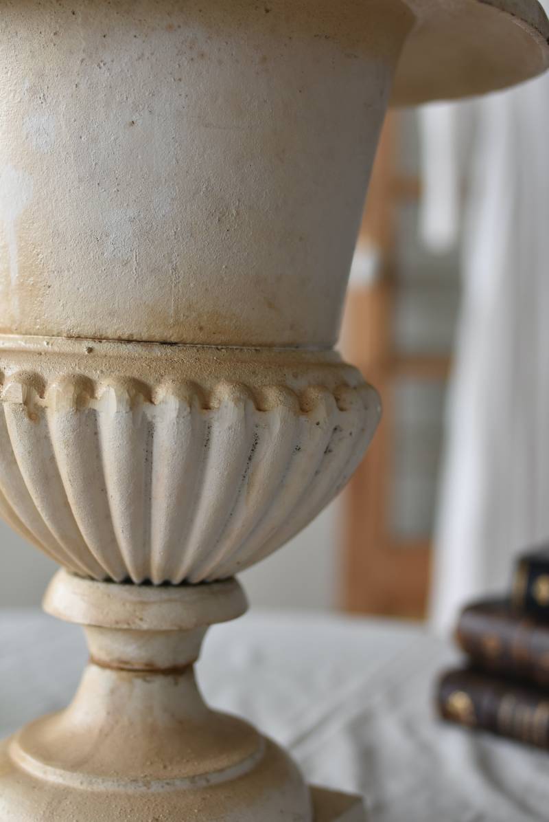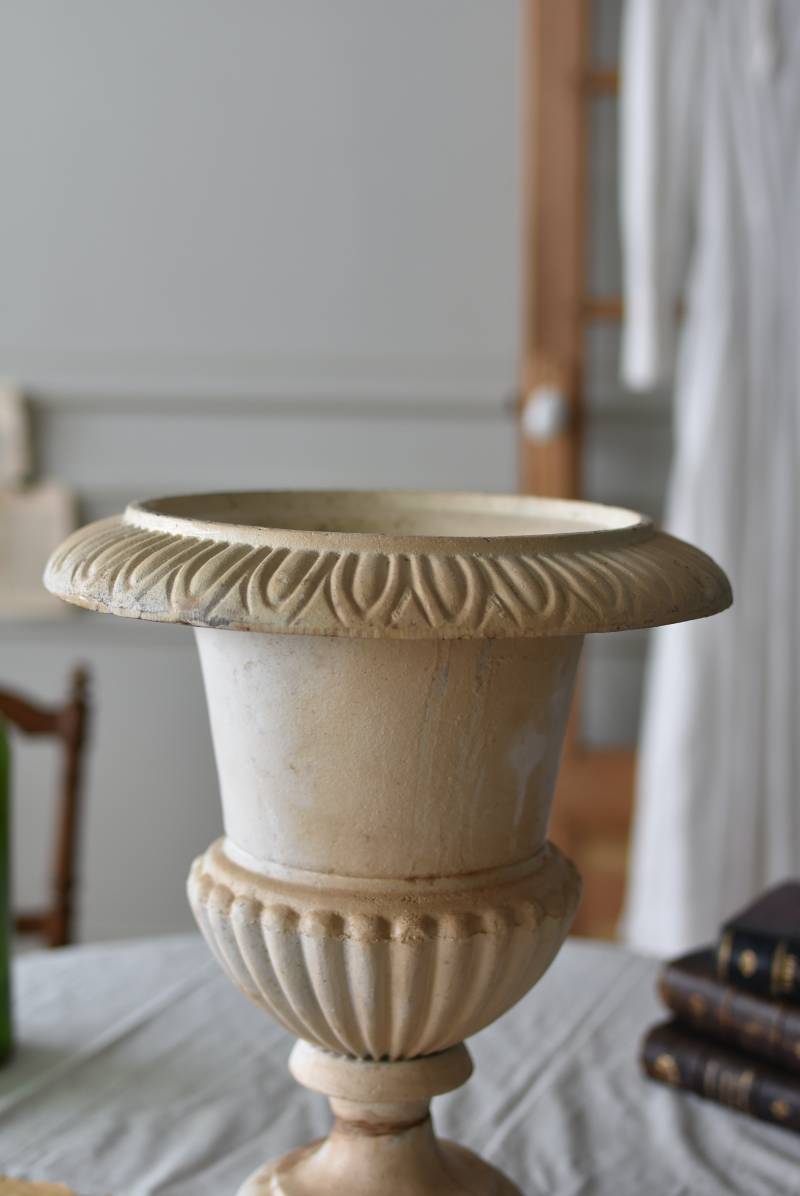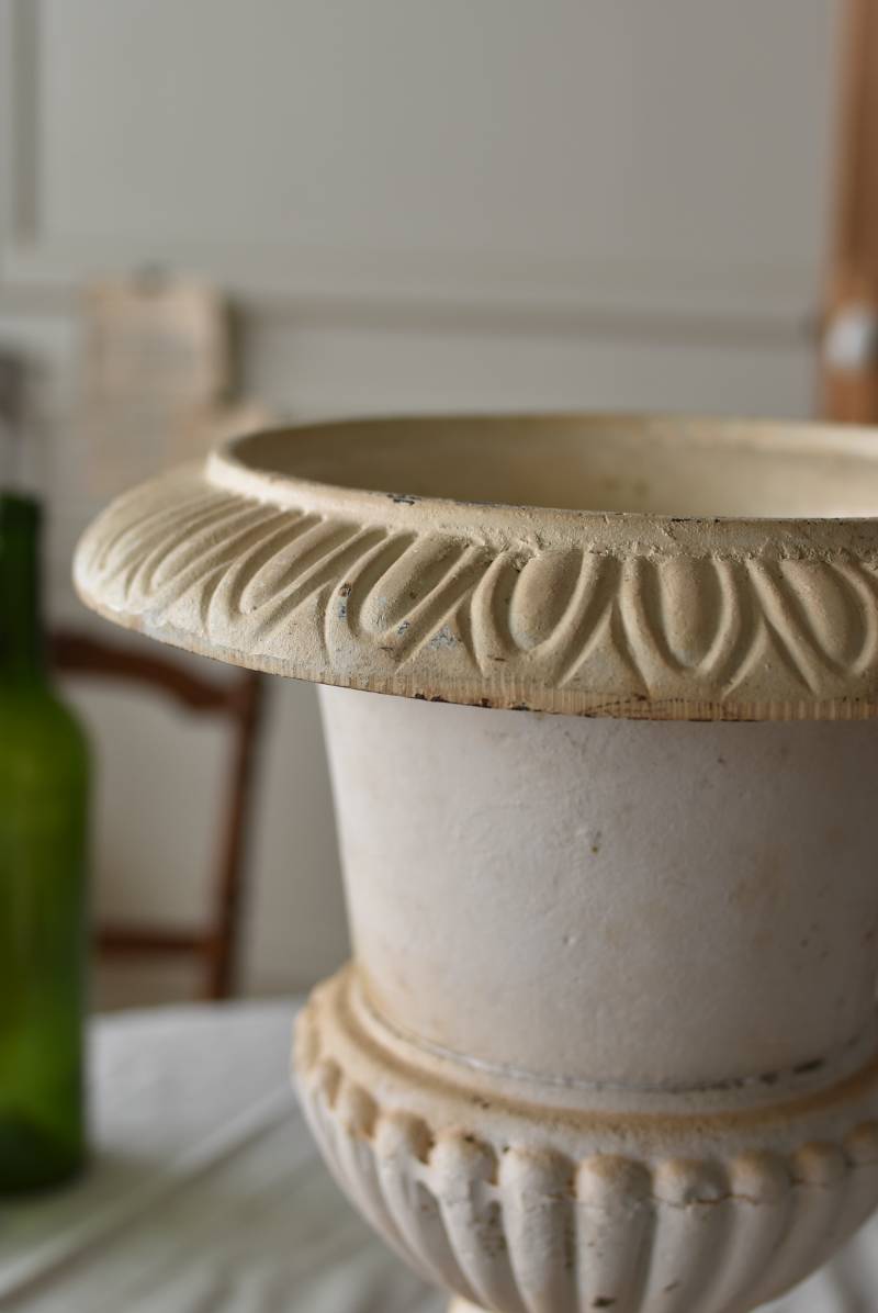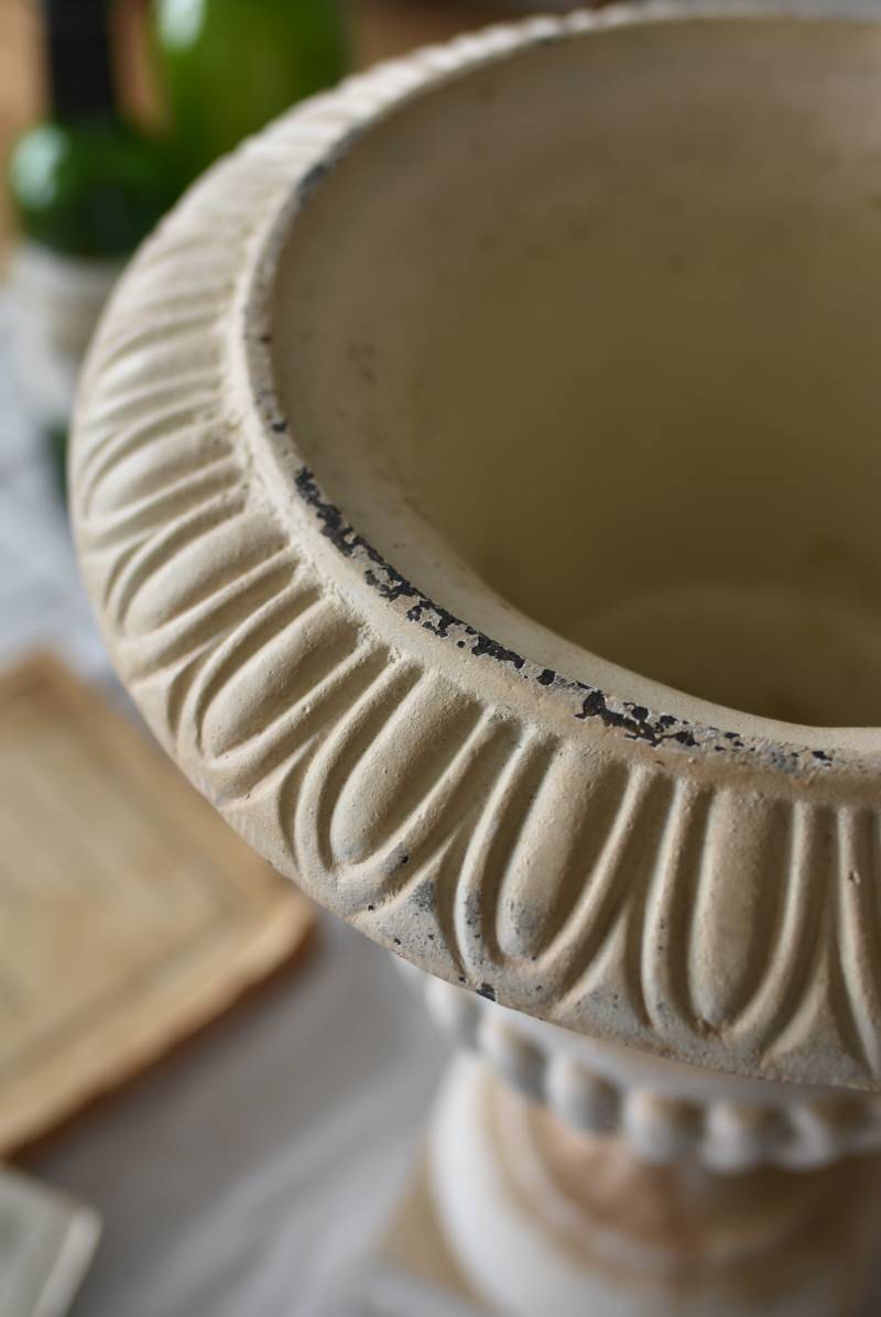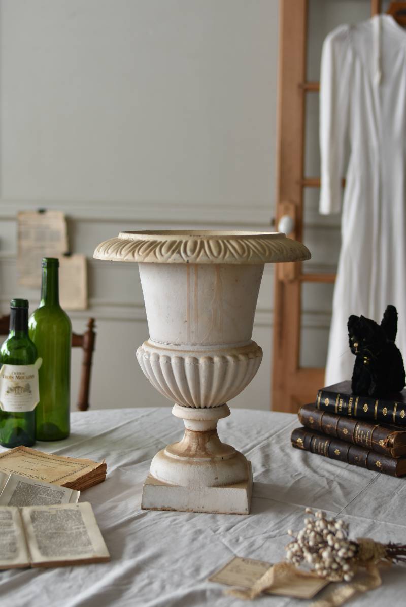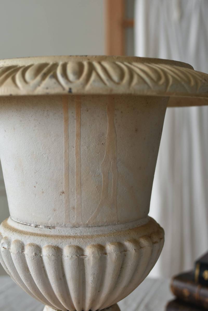 雰囲気たっぷりな表情を持つフランスのメディシス。 柔らかなホワイトカラーでまとまったボディは鋳物製でどっしりとした重量があり、小さめながらも安定感のあるデザイン。キュッとくびれた脚元とふわりと広がる口元のラインが美しく、フレンチシックな空間にも映える優美な姿となっています。サビや多少の歪みなどアンティークならではの風合いが深みのある印象に。 はっきりとした凹凸装飾は独自の存在感を漂わせ、状態は異なりますが同じデザインのメディシスとシンメトリーに飾るのもおすすめのアイテムです。 直径 約28.5cm 脚元 約14cm×14cm H 約36cm 口径 約15cm 深さ 約17.5cm 重量 約11kg