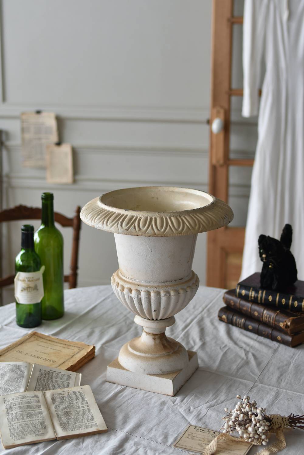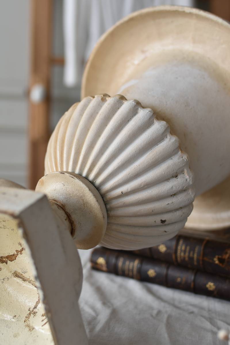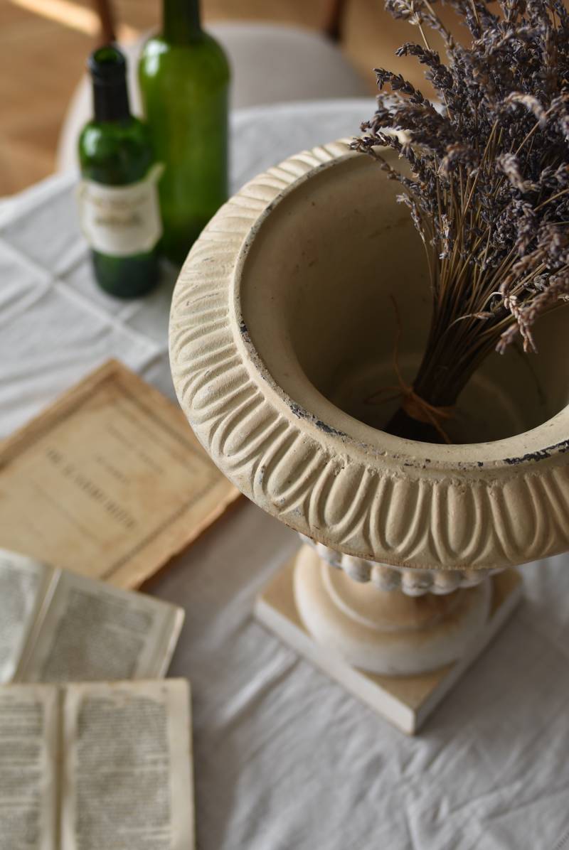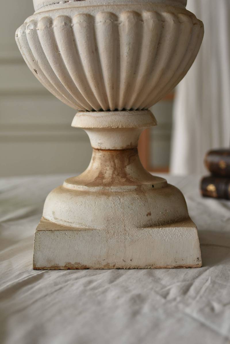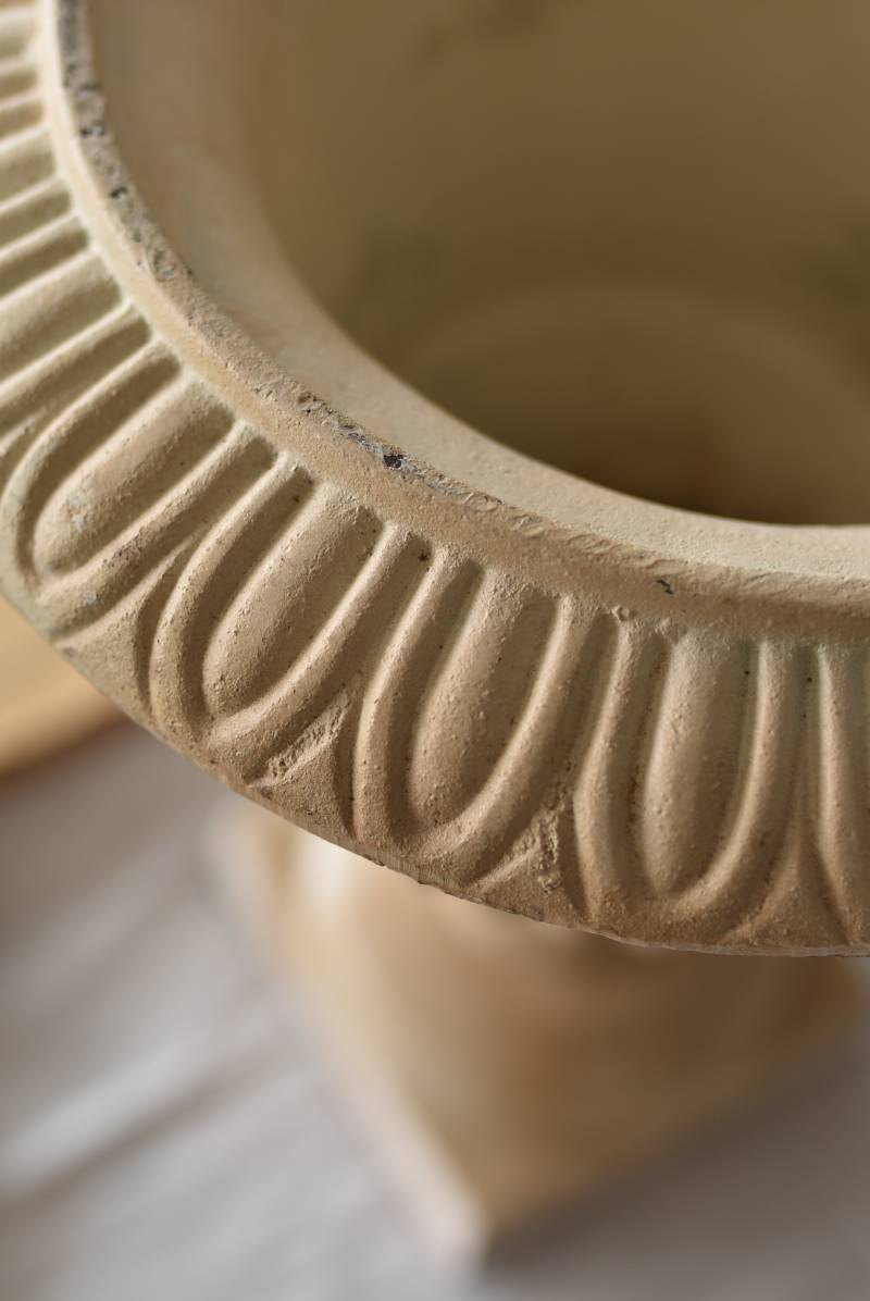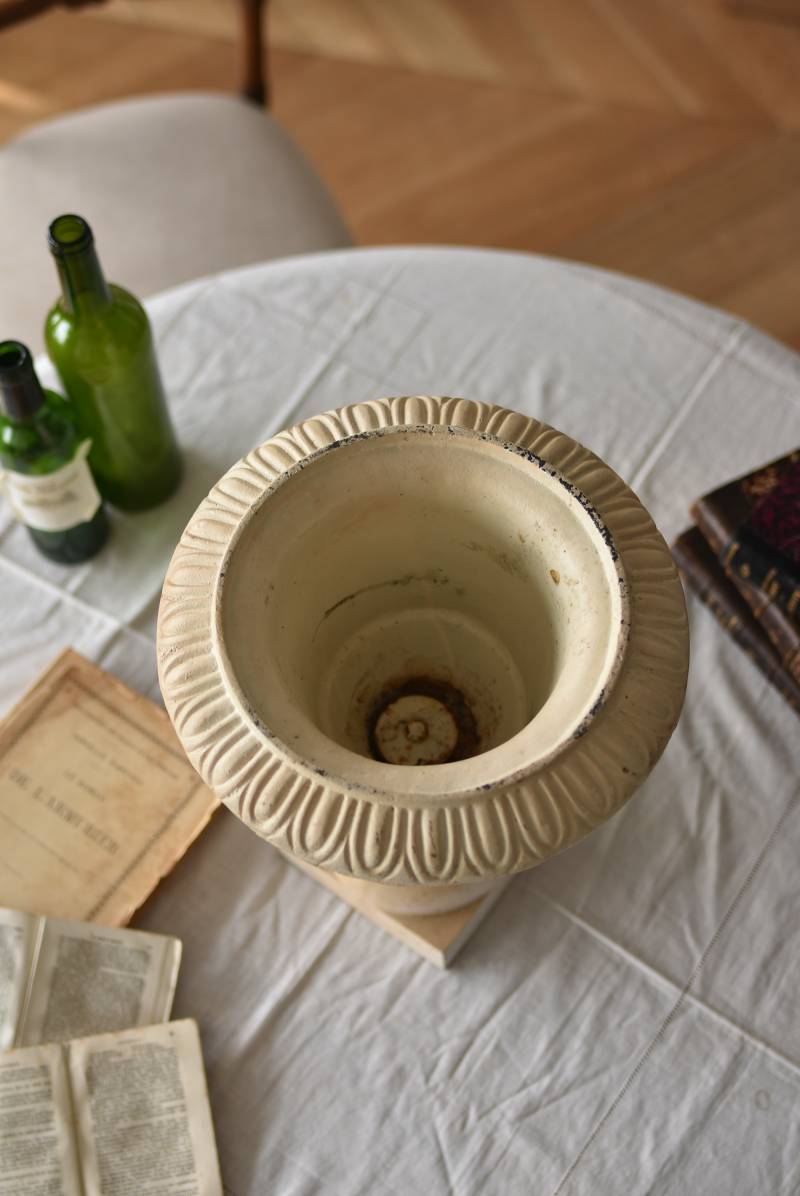 雰囲気たっぷりな表情を持つフランスのメディシス。 柔らかなホワイトカラーでまとまったボディは鋳物製でどっしりとした重量があり、小さめながらも安定感のあるデザイン。キュッとくびれた脚元とふわりと広がる口元のラインが美しく、フレンチシックな空間にも映える優美な姿となっています。サビや多少の歪みなどアンティークならではの風合いが深みのある印象に。 はっきりとした凹凸装飾は独自の存在感を漂わせ、状態は異なりますが同じデザインのメディシスとシンメトリーに飾るのもおすすめのアイテムです。 直径 約28.5cm 脚元 約14cm×14cm H 約36cm 口径 約15cm 深さ 約17.5cm 重量 約11kg