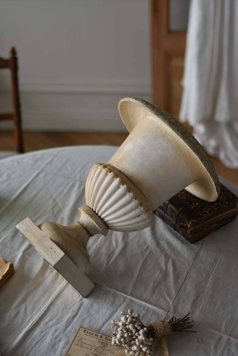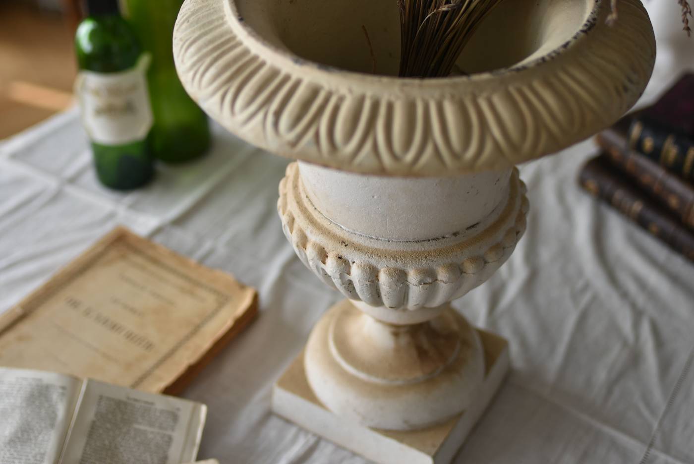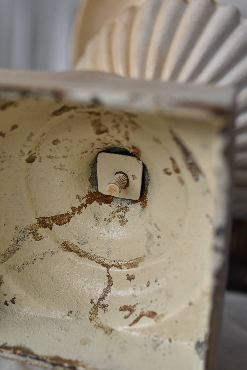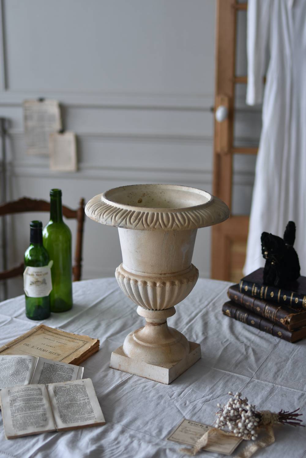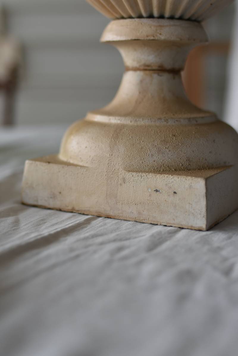 雰囲気たっぷりな表情を持つフランスのメディシス。 柔らかなホワイトカラーでまとまったボディは鋳物製でどっしりとした重量があり、小さめながらも安定感のあるデザイン。キュッとくびれた脚元とふわりと広がる口元のラインが美しく、フレンチシックな空間にも映える優美な姿となっています。サビや多少の歪みなどアンティークならではの風合いが深みのある印象に。 はっきりとした凹凸装飾は独自の存在感を漂わせ、状態は異なりますが同じデザインのメディシスとシンメトリーに飾るのもおすすめのアイテムです。 直径 約28.5cm 脚元 約14cm×14cm H 約36cm 口径 約15cm 深さ 約17.5cm 重量 約11kg