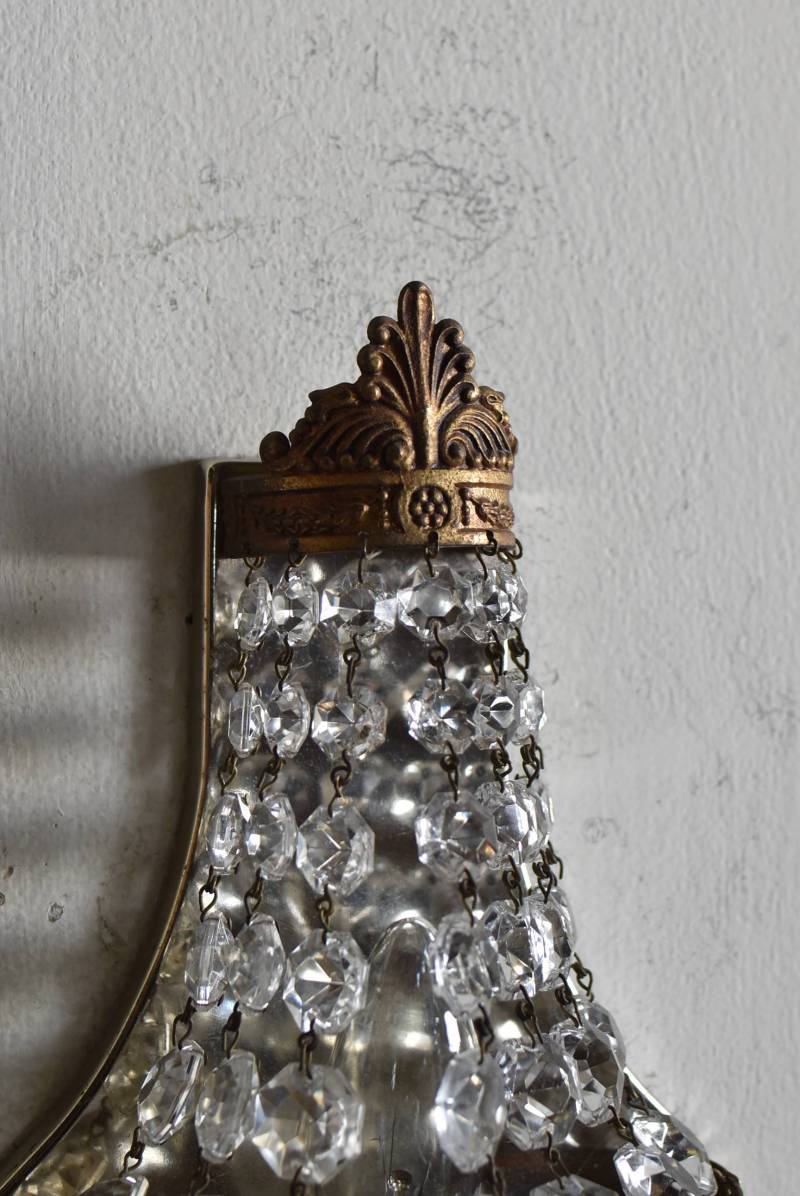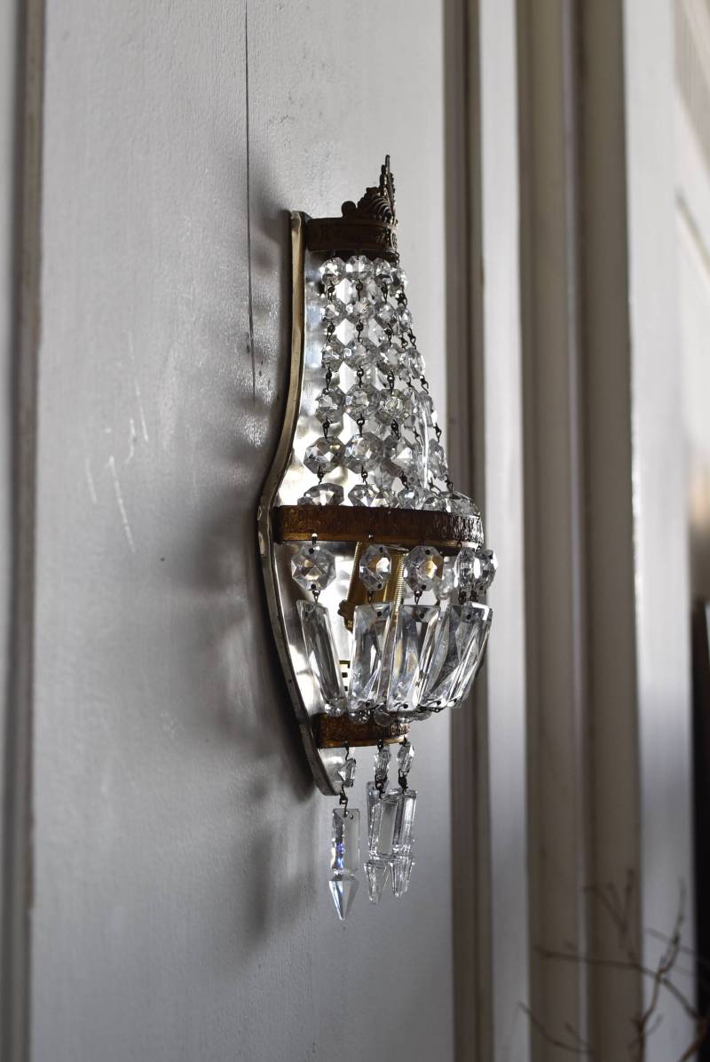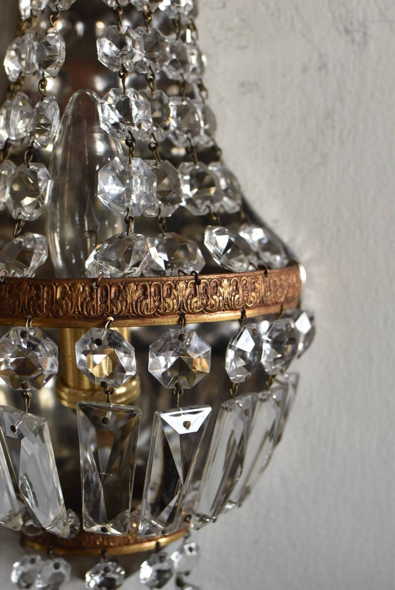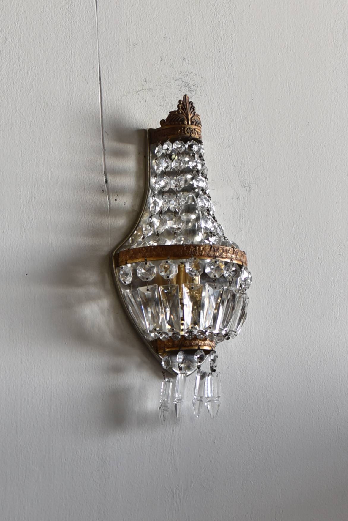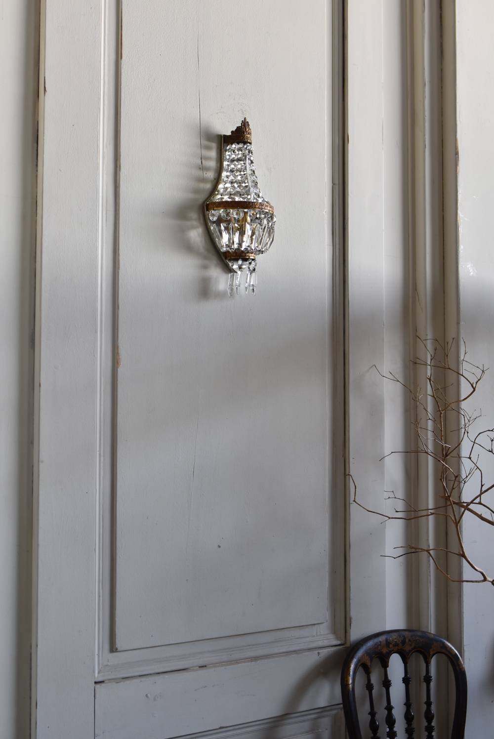 フランスの1灯ウォールランプ。 下部に向かってふっくらと丸みを帯びた滑らかなシルエットに、四角や丸のガラスパーツが連なり、カットデザインに光が反射し澄んだ煌めきが楽しめる優雅な姿です。帯状になったゴールドカラーの装飾にも細やかな連続模様が施され、壁面の雰囲気を引き締めてくれそうです。 構造上、ガラスパーツが電球と接触しますので、LED電球のご使用をおすすめします。古いものですのでガラスパーツに小さなカケが見受けられます。ソケット・コードは新しいものに交換済みです。取り付けの際は配線工事が必要です。 壁に取り付ける為の金具や電球は付属しません。それぞれでの販売となりますが、同じデザインのウォールランプ.Bがあり、シンメトリーに取り付ける事も可能です。 W 約16.5cm D 約8cm H 約36cm 重量 約0.8kg 電球口径 E17 *60W以下をご使用下さい。