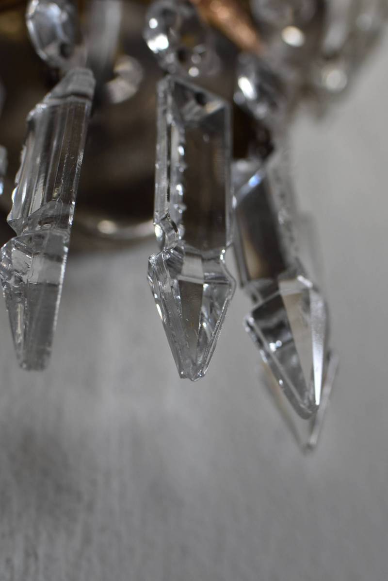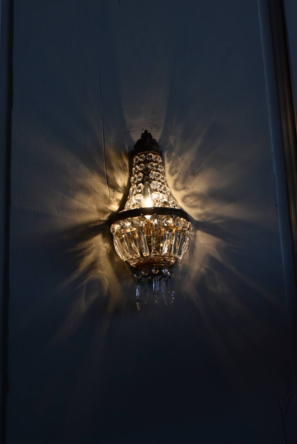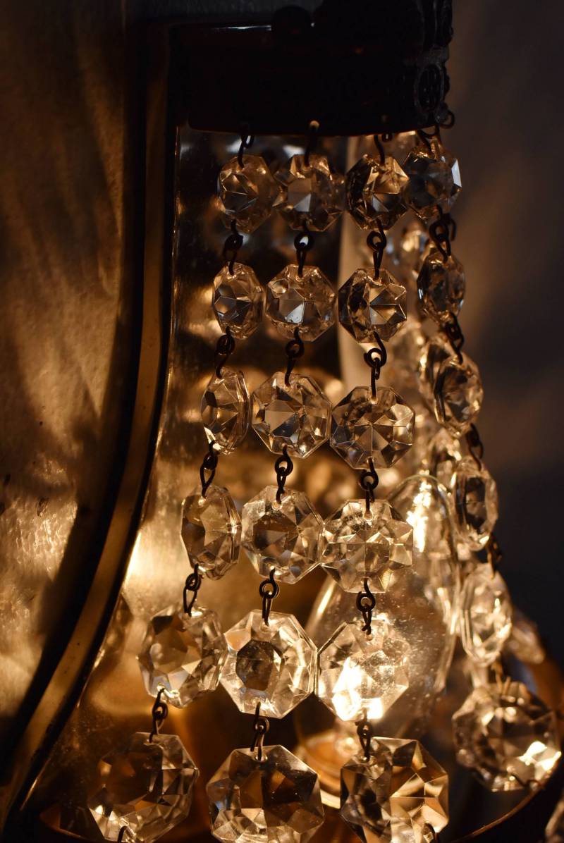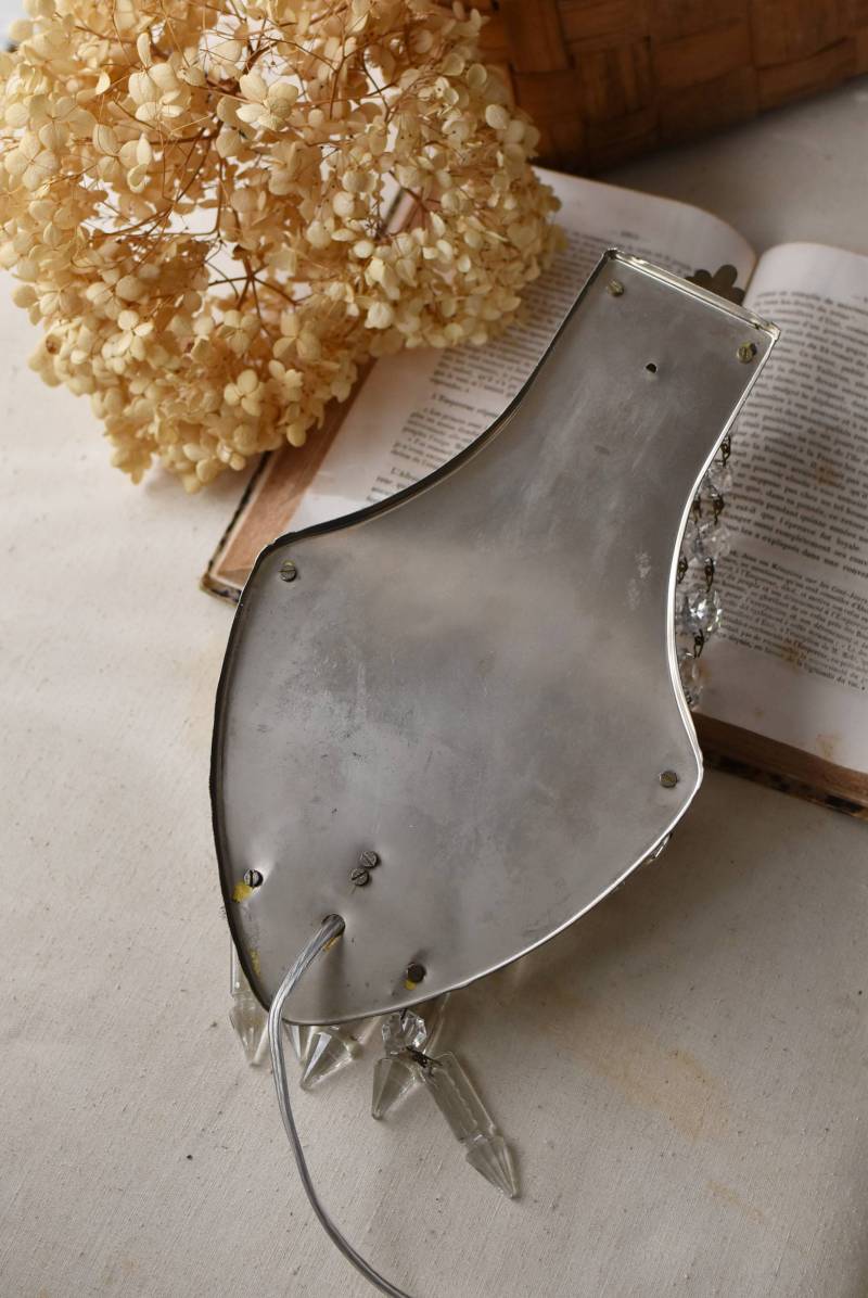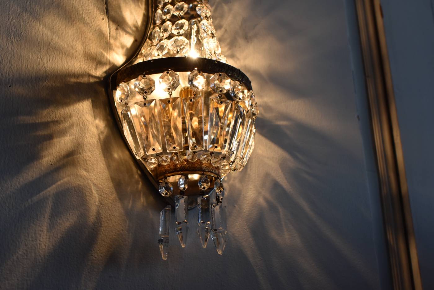フランスの1灯ウォールランプ。 下部に向かってふっくらと丸みを帯びた滑らかなシルエットに、四角や丸のガラスパーツが連なり、カットデザインに光が反射し澄んだ煌めきが楽しめる優雅な姿です。帯状になったゴールドカラーの装飾にも細やかな連続模様が施され、壁面の雰囲気を引き締めてくれそうです。 構造上、ガラスパーツが電球と接触しますので、LED電球のご使用をおすすめします。古いものですのでガラスパーツに小さなカケが見受けられます。ソケット・コードは新しいものに交換済みです。取り付けの際は配線工事が必要です。 壁に取り付ける為の金具や電球は付属しません。それぞれでの販売となりますが、同じデザインのウォールランプ.Bがあり、シンメトリーに取り付ける事も可能です。 W 約16.5cm D 約8cm H 約36cm 重量 約0.8kg 電球口径 E17 *60W以下をご使用下さい。