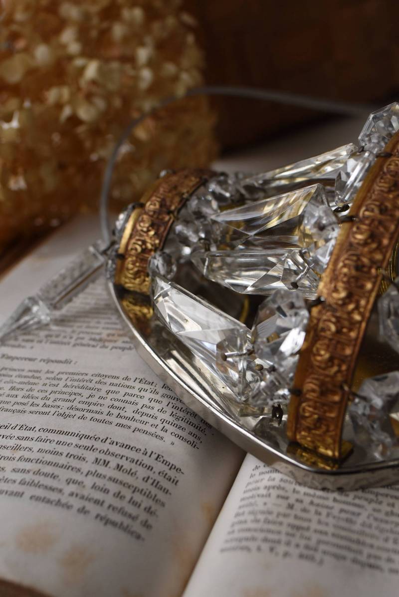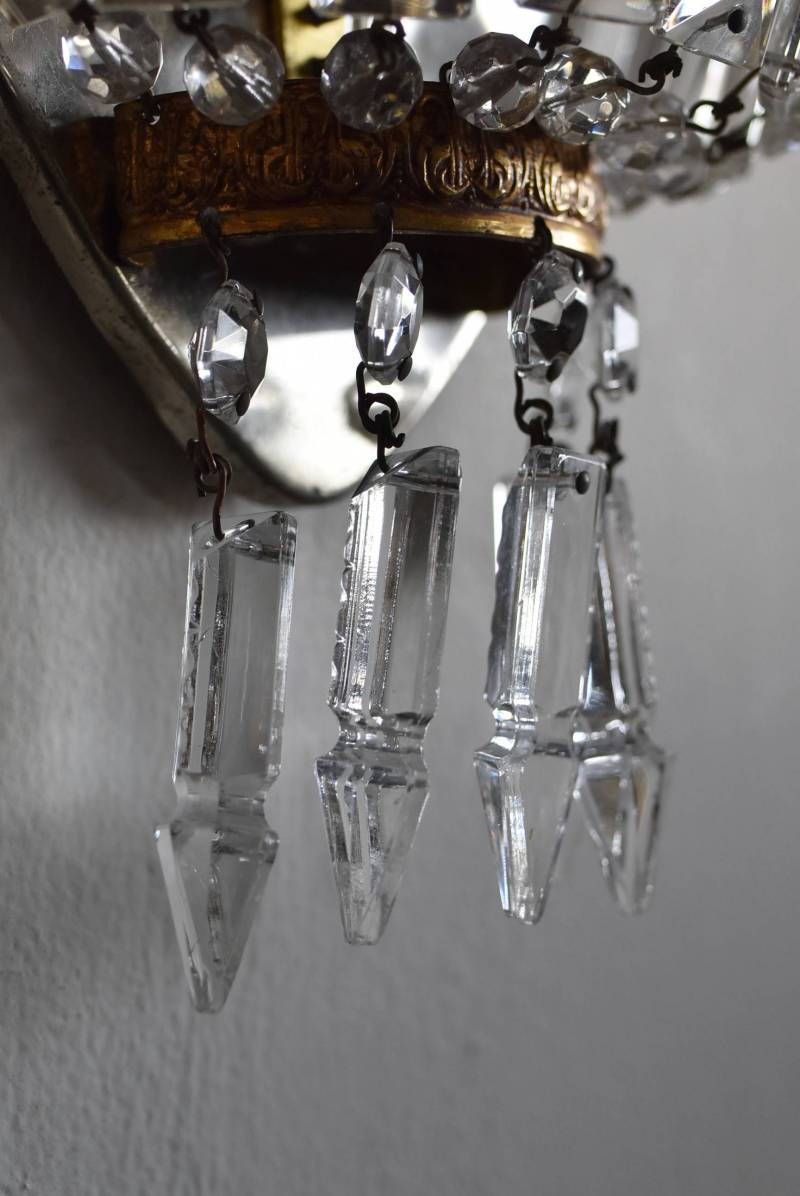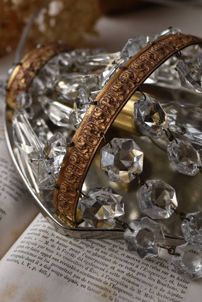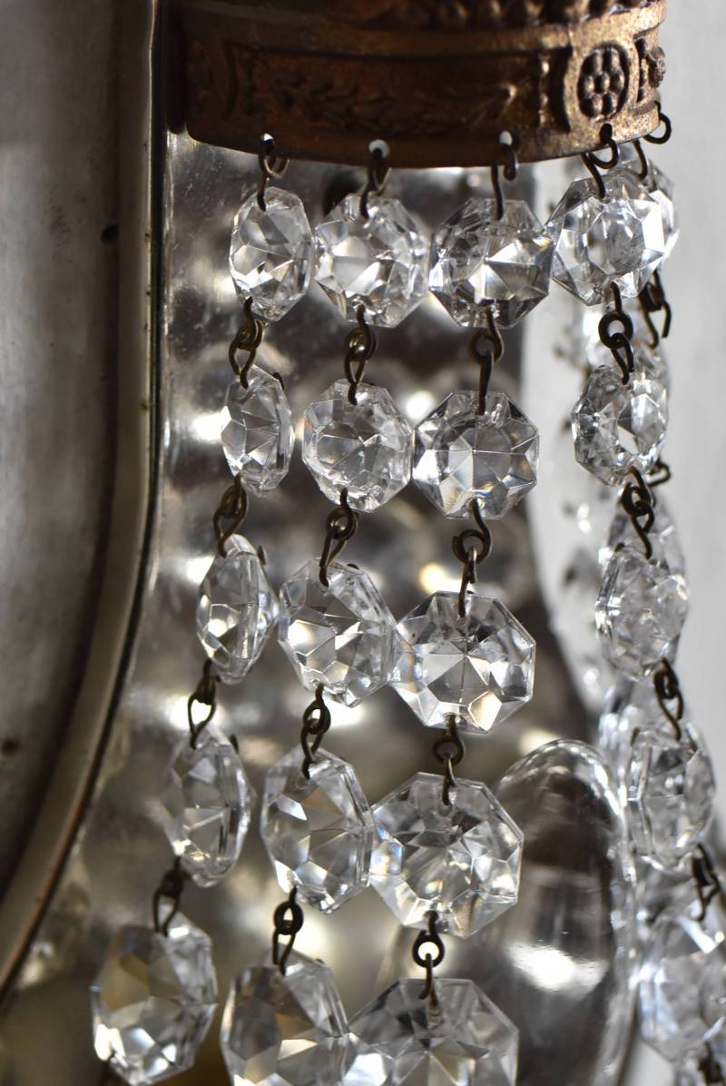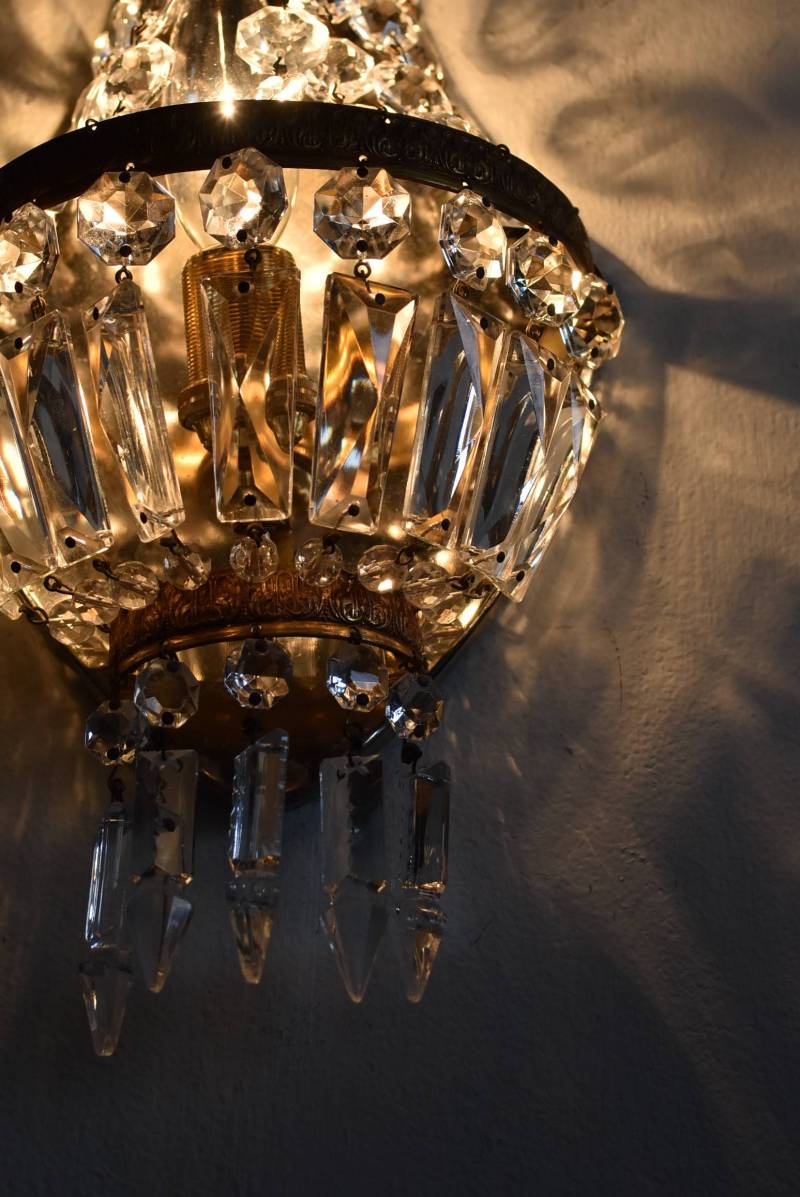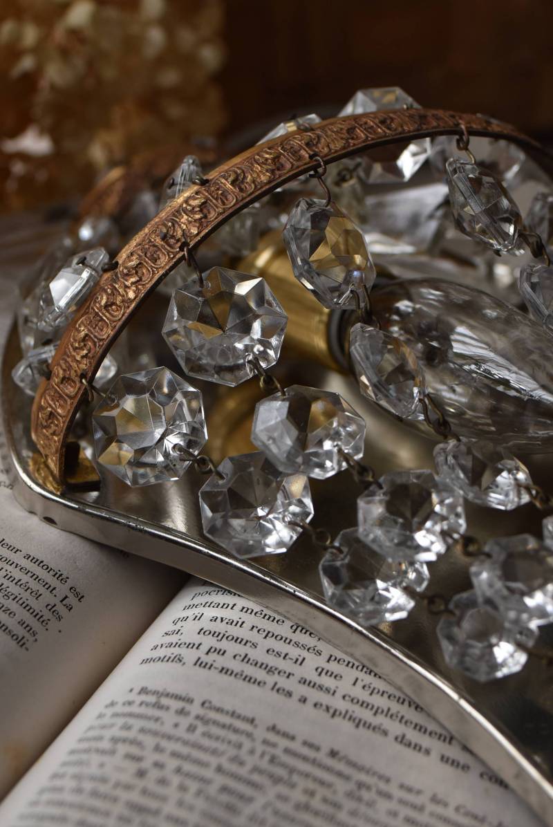 フランスの1灯ウォールランプ。 下部に向かってふっくらと丸みを帯びた滑らかなシルエットに、四角や丸のガラスパーツが連なり、カットデザインに光が反射し澄んだ煌めきが楽しめる優雅な姿です。帯状になったゴールドカラーの装飾にも細やかな連続模様が施され、壁面の雰囲気を引き締めてくれそうです。 構造上、ガラスパーツが電球と接触しますので、LED電球のご使用をおすすめします。古いものですのでガラスパーツに小さなカケが見受けられます。ソケット・コードは新しいものに交換済みです。取り付けの際は配線工事が必要です。 壁に取り付ける為の金具や電球は付属しません。それぞれでの販売となりますが、同じデザインのウォールランプ.Bがあり、シンメトリーに取り付ける事も可能です。 W 約16.5cm D 約8cm H 約36cm 重量 約0.8kg 電球口径 E17 *60W以下をご使用下さい。