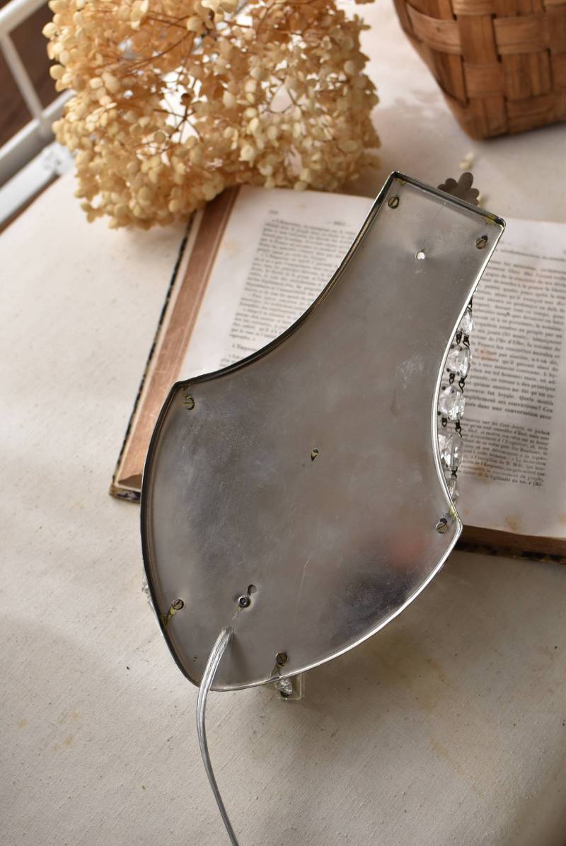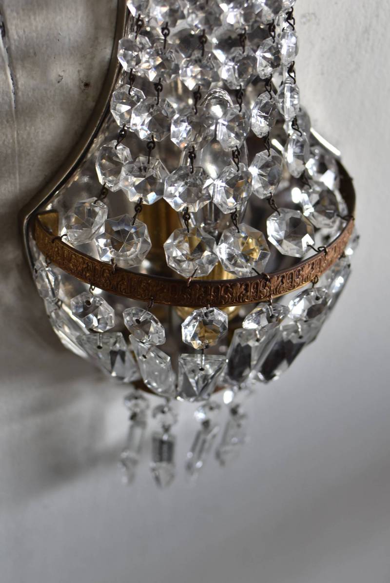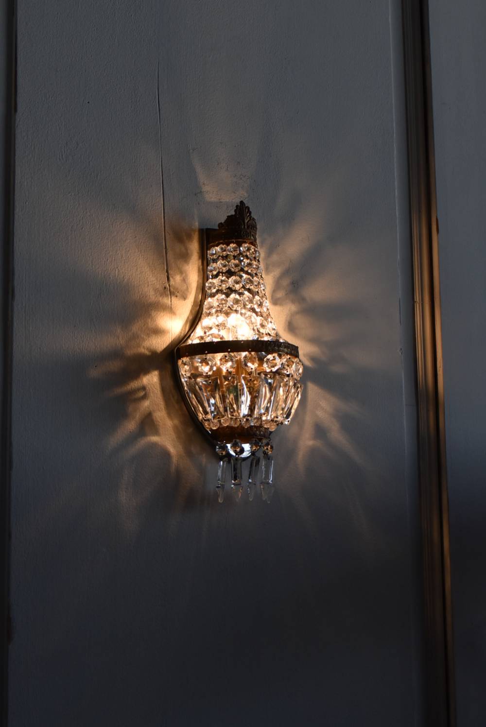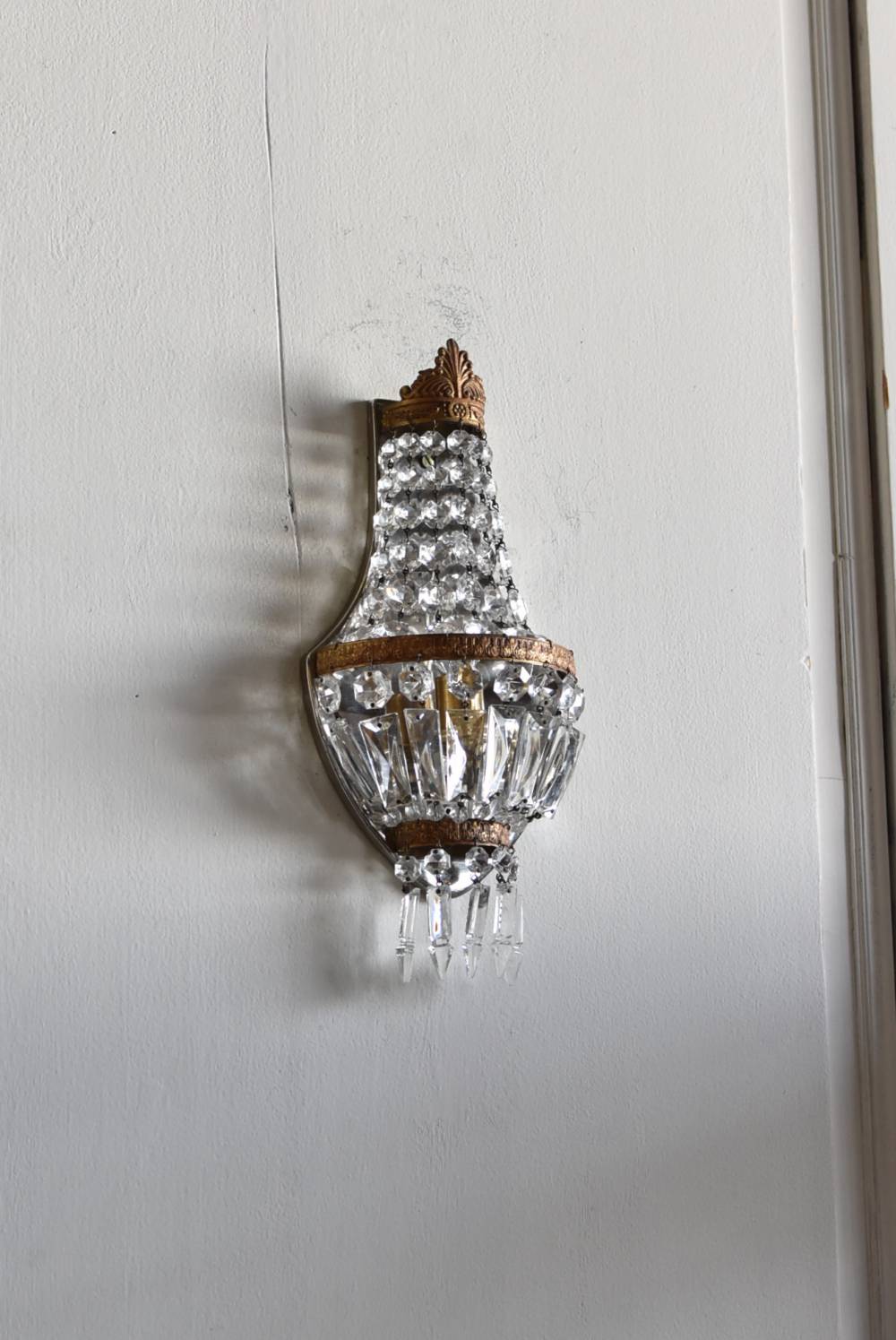 フランスの1灯ウォールランプ。 下部に向かってふっくらと丸みを帯びた滑らかなシルエットに、四角や丸のガラスパーツが連なり、カットデザインに光が反射し澄んだ煌めきが楽しめる優雅な姿です。帯状になったゴールドカラーの装飾にも細やかな連続模様が施され、壁面の雰囲気を引き締めてくれそうです。 構造上、ガラスパーツが電球と接触しますので、LED電球のご使用をおすすめします。古いものですのでガラスパーツに小さなカケが見受けられます。ソケット・コードは新しいものに交換済みです。取り付けの際は配線工事が必要です。 壁に取り付ける為の金具や電球は付属しません。それぞれでの販売となりますが、同じデザインのウォールランプ.Aがあり、シンメトリーに取り付ける事も可能です。 W 約16.5cm D 約8cm H 約36cm 重量 約0.8kg 電球口径 E17 *60W以下をご使用下さい。