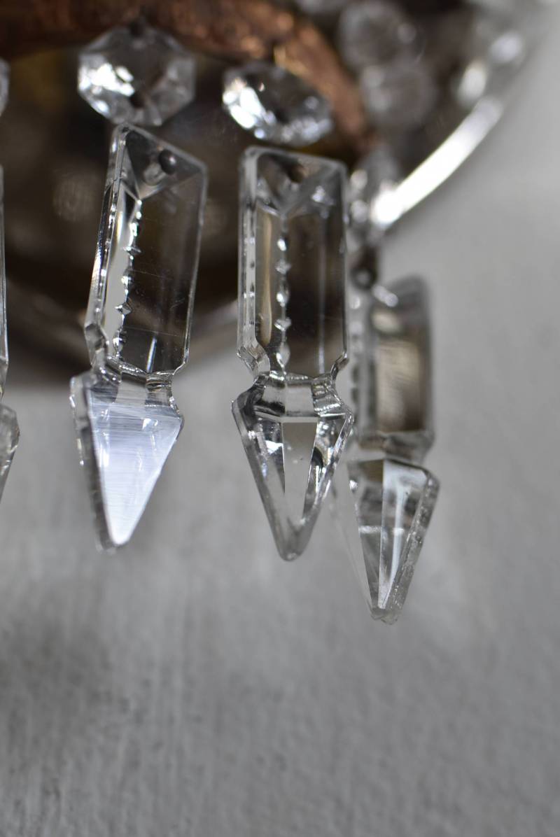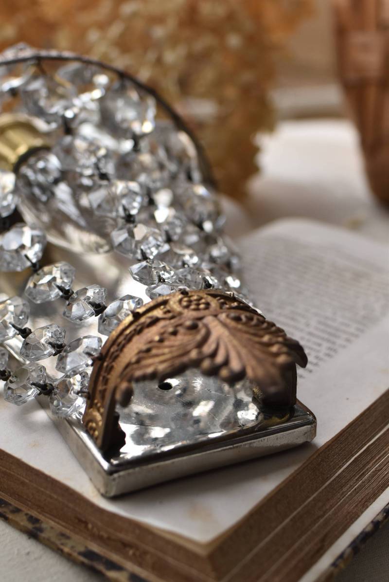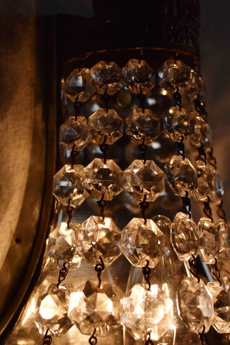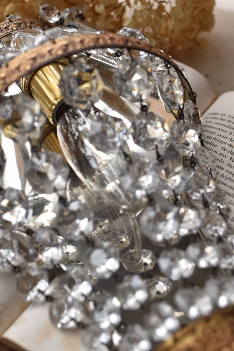 フランスの1灯ウォールランプ。 下部に向かってふっくらと丸みを帯びた滑らかなシルエットに、四角や丸のガラスパーツが連なり、カットデザインに光が反射し澄んだ煌めきが楽しめる優雅な姿です。帯状になったゴールドカラーの装飾にも細やかな連続模様が施され、壁面の雰囲気を引き締めてくれそうです。 構造上、ガラスパーツが電球と接触しますので、LED電球のご使用をおすすめします。古いものですのでガラスパーツに小さなカケが見受けられます。ソケット・コードは新しいものに交換済みです。取り付けの際は配線工事が必要です。 壁に取り付ける為の金具や電球は付属しません。それぞれでの販売となりますが、同じデザインのウォールランプ.Aがあり、シンメトリーに取り付ける事も可能です。 W 約16.5cm D 約8cm H 約36cm 重量 約0.8kg 電球口径 E17 *60W以下をご使用下さい。