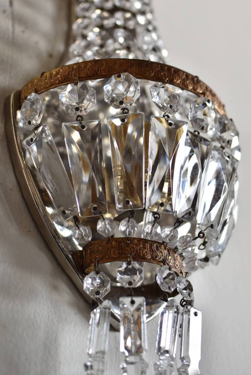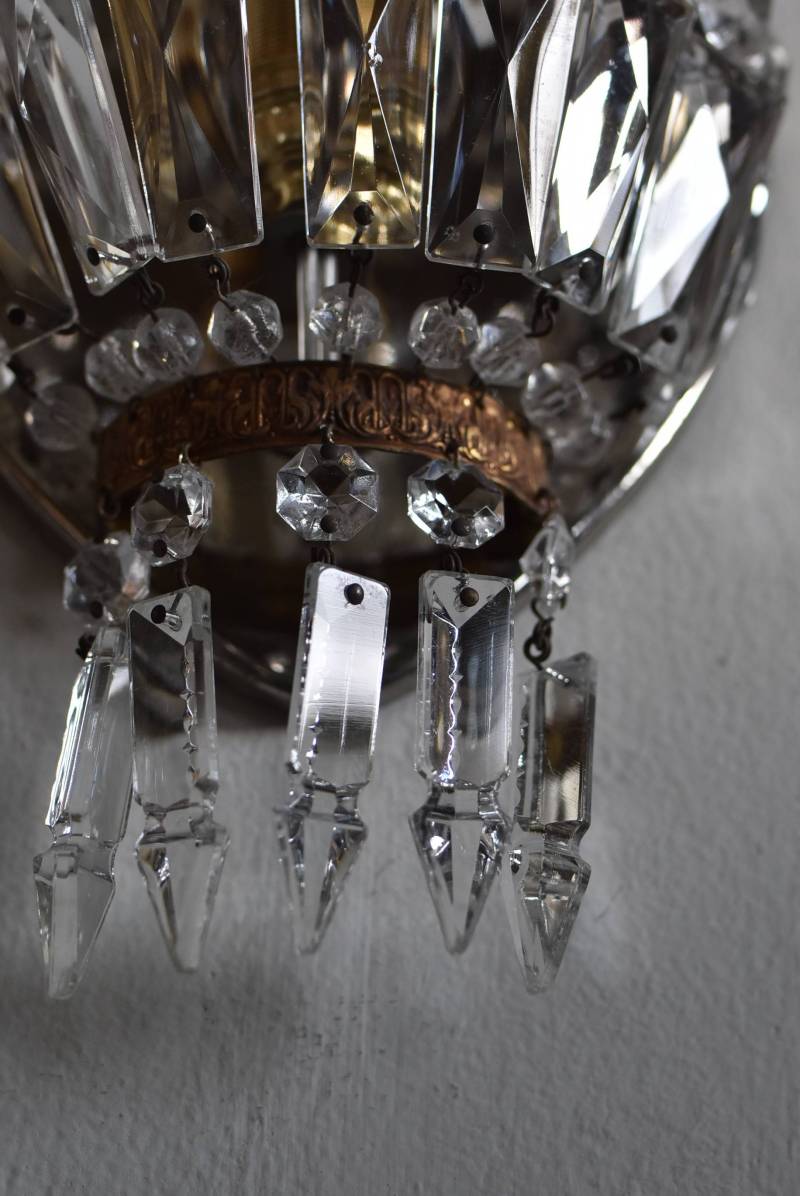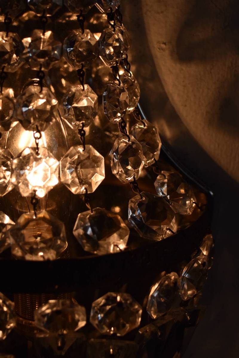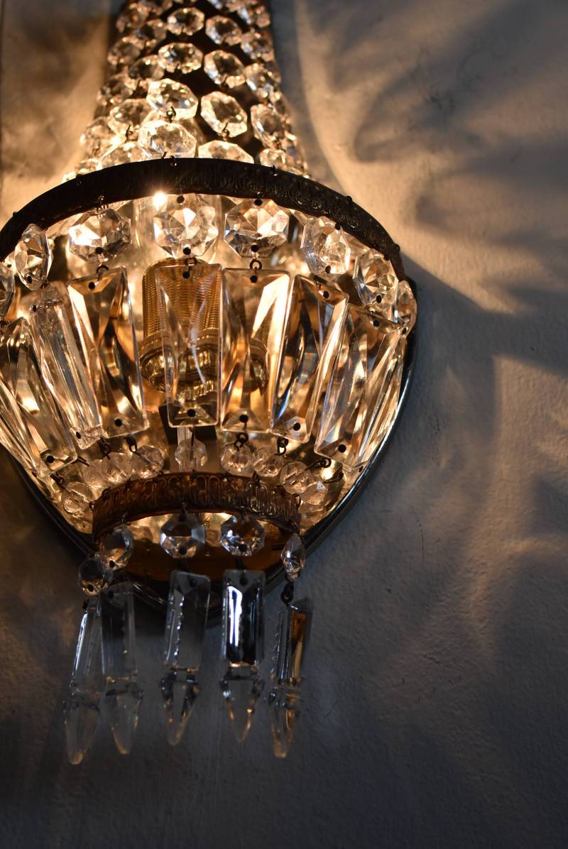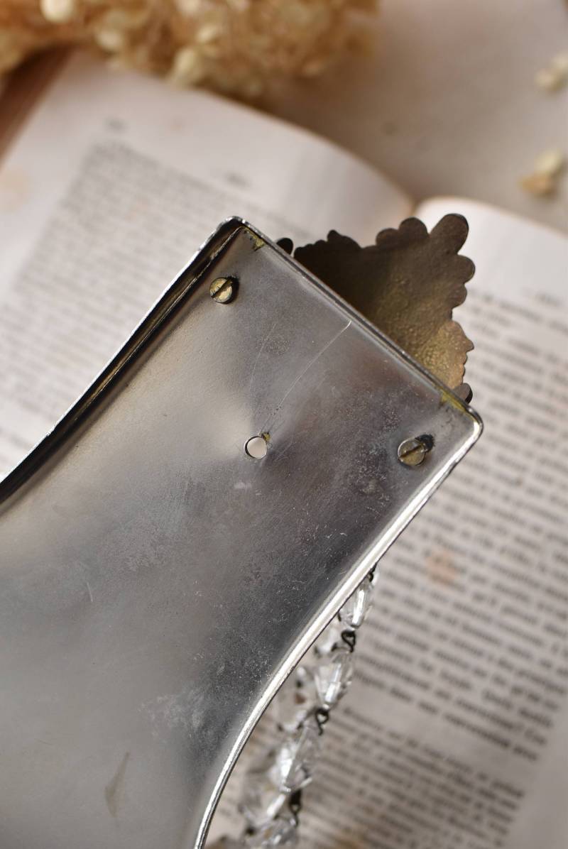 フランスの1灯ウォールランプ。 下部に向かってふっくらと丸みを帯びた滑らかなシルエットに、四角や丸のガラスパーツが連なり、カットデザインに光が反射し澄んだ煌めきが楽しめる優雅な姿です。帯状になったゴールドカラーの装飾にも細やかな連続模様が施され、壁面の雰囲気を引き締めてくれそうです。 構造上、ガラスパーツが電球と接触しますので、LED電球のご使用をおすすめします。古いものですのでガラスパーツに小さなカケが見受けられます。ソケット・コードは新しいものに交換済みです。取り付けの際は配線工事が必要です。 壁に取り付ける為の金具や電球は付属しません。それぞれでの販売となりますが、同じデザインのウォールランプ.Aがあり、シンメトリーに取り付ける事も可能です。 W 約16.5cm D 約8cm H 約36cm 重量 約0.8kg 電球口径 E17 *60W以下をご使用下さい。
