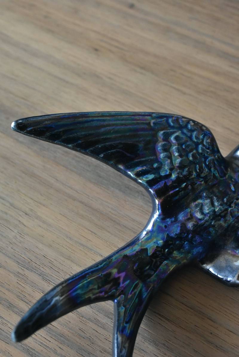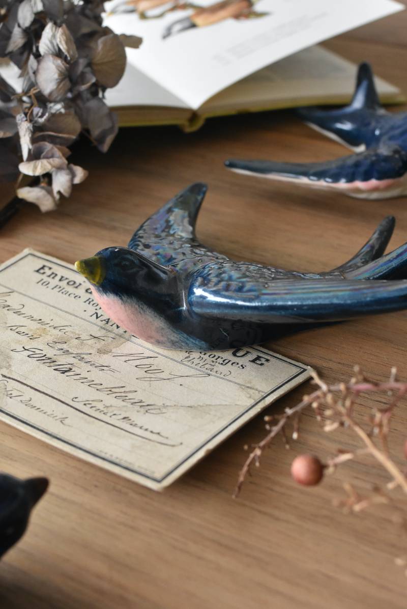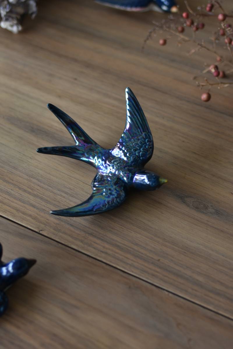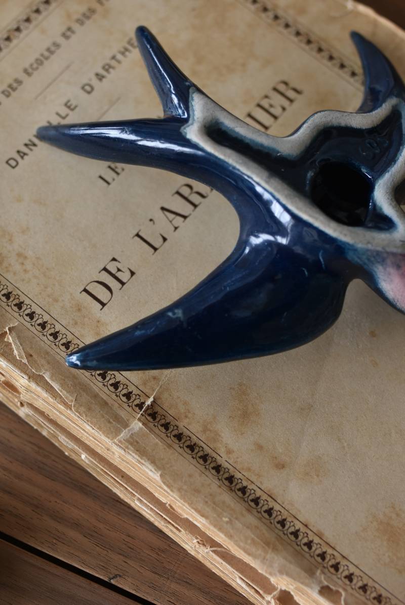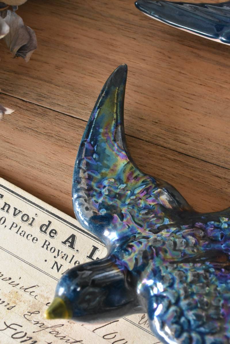 フランスで見つけた陶器のオブジェ。 幸せを運ぶと言われているツバメを象ったウォールオブジェで、気持ち良さそうに空を翔ける躍動感たっぷりな佇まい。深みのあるブルーのボディにまるで虹を纏ったかのような独自の色味が魅力の一つで、丁寧に作り込まれた翼の造形など細部にもこだわりを感じられるデザインです。裏側には壁掛け用の穴がついており、壁に掛けてウォールデコレーションとしても活躍してくれそう。 程よい存在感で遊び心のある壁面を演出し、個体差のあるツバメオブジェ達と仲良く並べて飾ってあげるのも素敵です。 W 約13.5cm D 約14cm H 約4.5cm