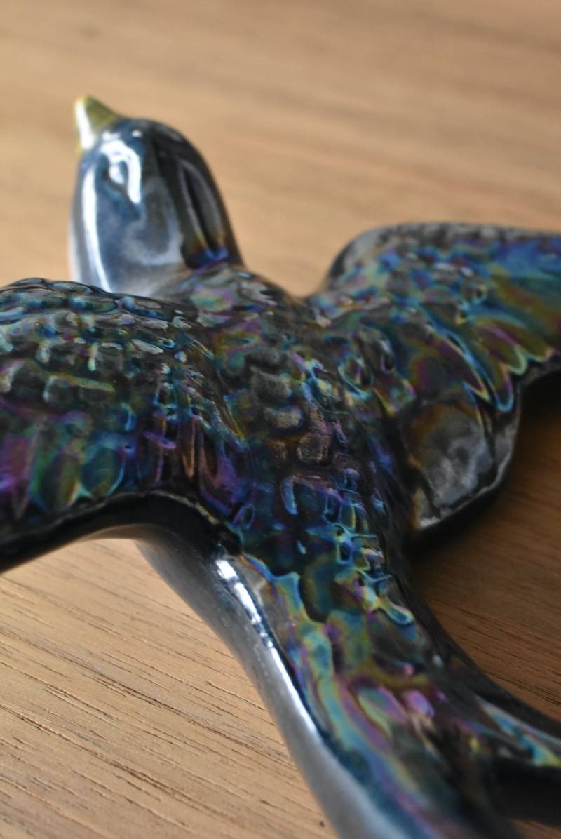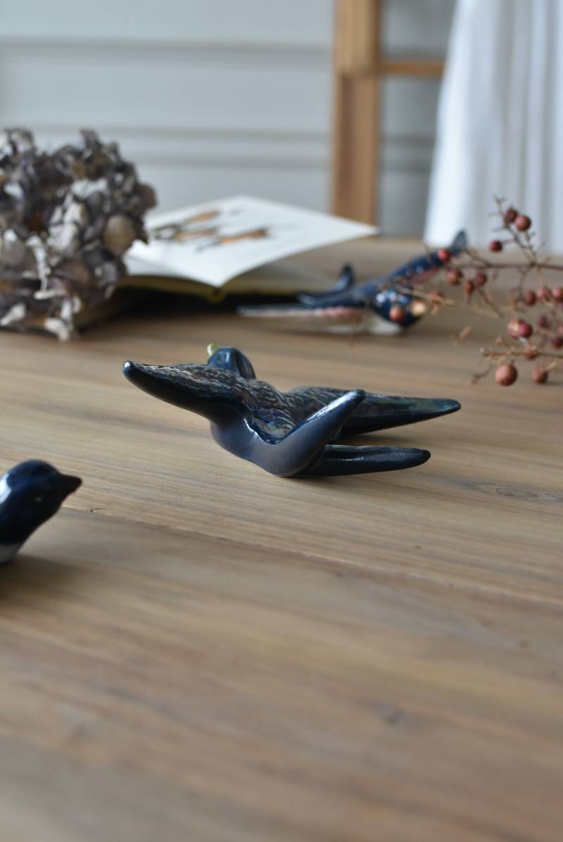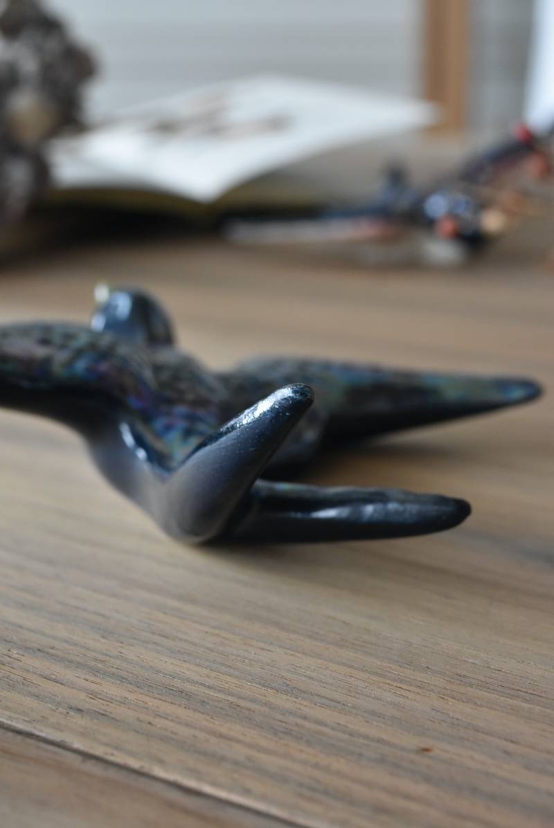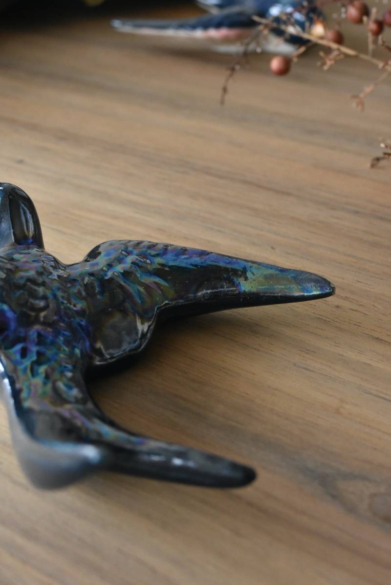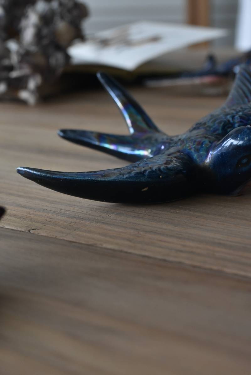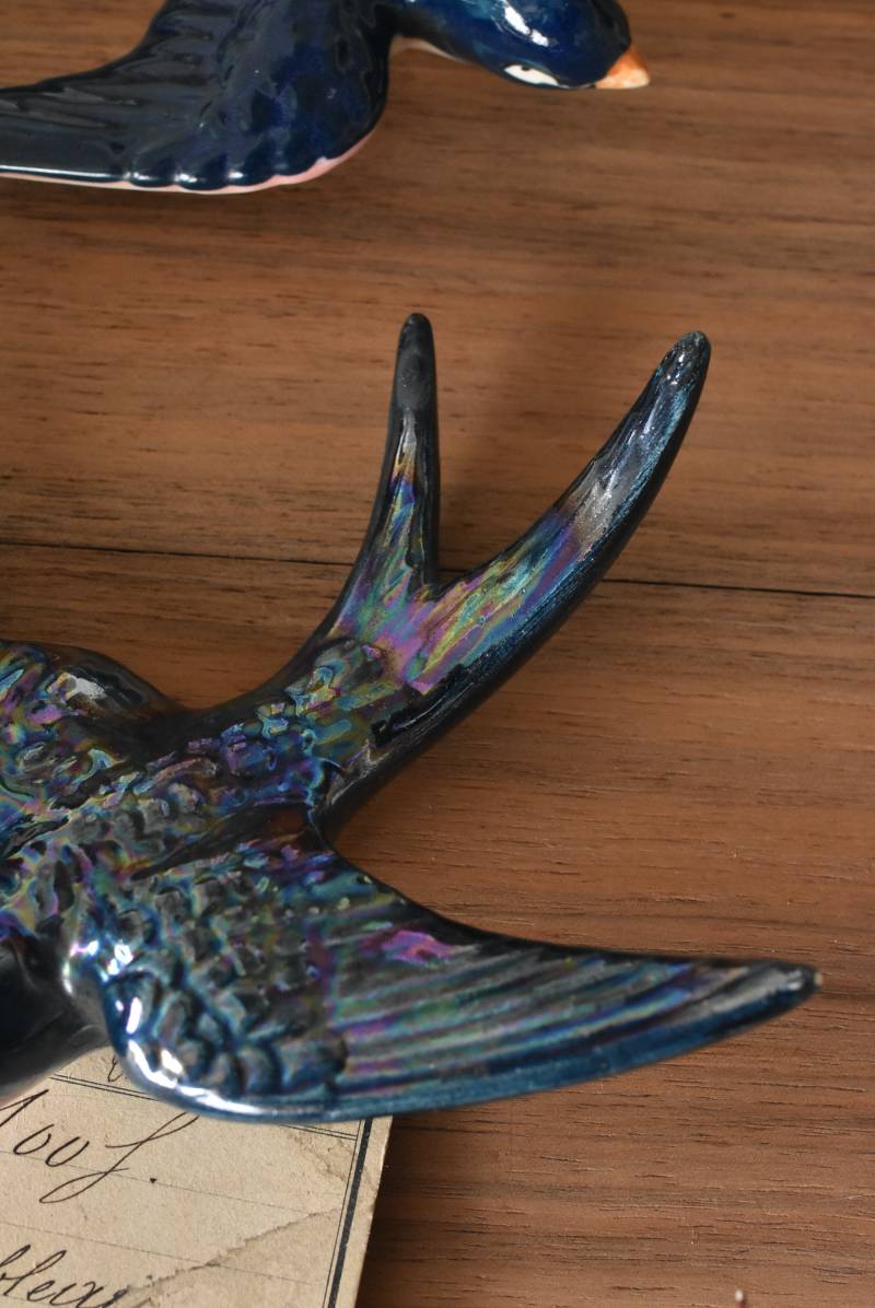 フランスで見つけた陶器のオブジェ。 幸せを運ぶと言われているツバメを象ったウォールオブジェで、気持ち良さそうに空を翔ける躍動感たっぷりな佇まい。深みのあるブルーのボディにまるで虹を纏ったかのような独自の色味が魅力の一つで、丁寧に作り込まれた翼の造形など細部にもこだわりを感じられるデザインです。裏側には壁掛け用の穴がついており、壁に掛けてウォールデコレーションとしても活躍してくれそう。 程よい存在感で遊び心のある壁面を演出し、個体差のあるツバメオブジェ達と仲良く並べて飾ってあげるのも素敵です。 W 約13.5cm D 約14cm H 約4.5cm