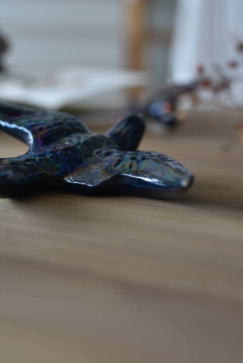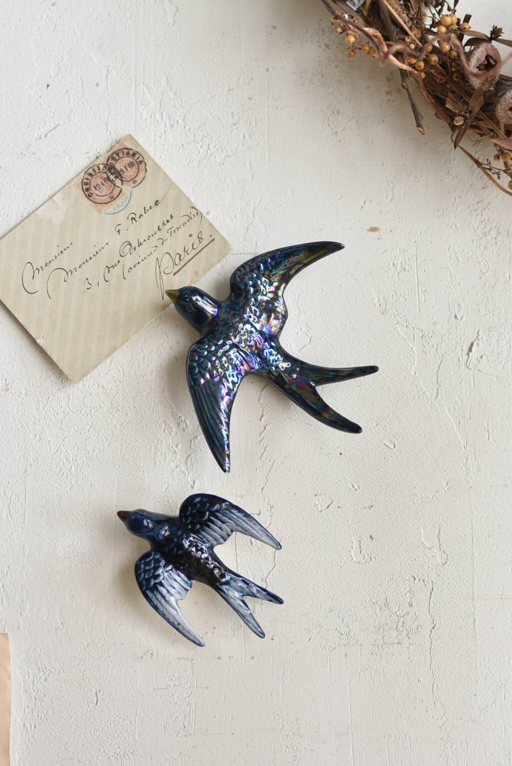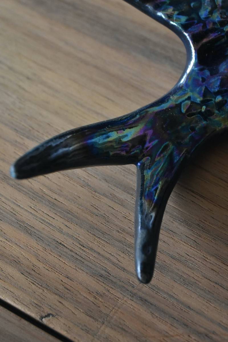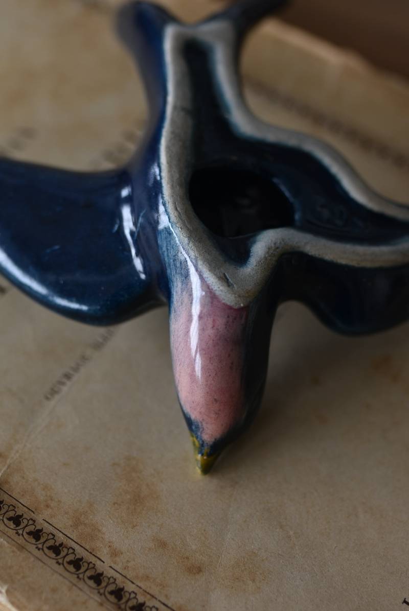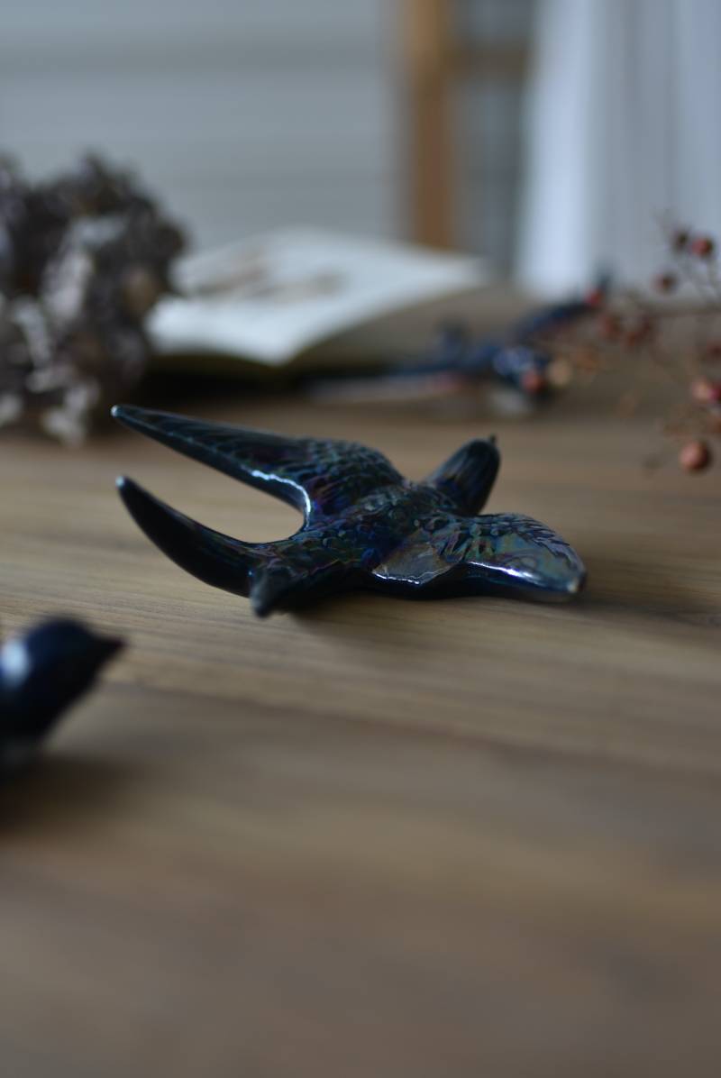 フランスで見つけた陶器のオブジェ。 幸せを運ぶと言われているツバメを象ったウォールオブジェで、気持ち良さそうに空を翔ける躍動感たっぷりな佇まい。深みのあるブルーのボディにまるで虹を纏ったかのような独自の色味が魅力の一つで、丁寧に作り込まれた翼の造形など細部にもこだわりを感じられるデザインです。裏側には壁掛け用の穴がついており、壁に掛けてウォールデコレーションとしても活躍してくれそう。 程よい存在感で遊び心のある壁面を演出し、個体差のあるツバメオブジェ達と仲良く並べて飾ってあげるのも素敵です。 W 約13.5cm D 約14cm H 約4.5cm