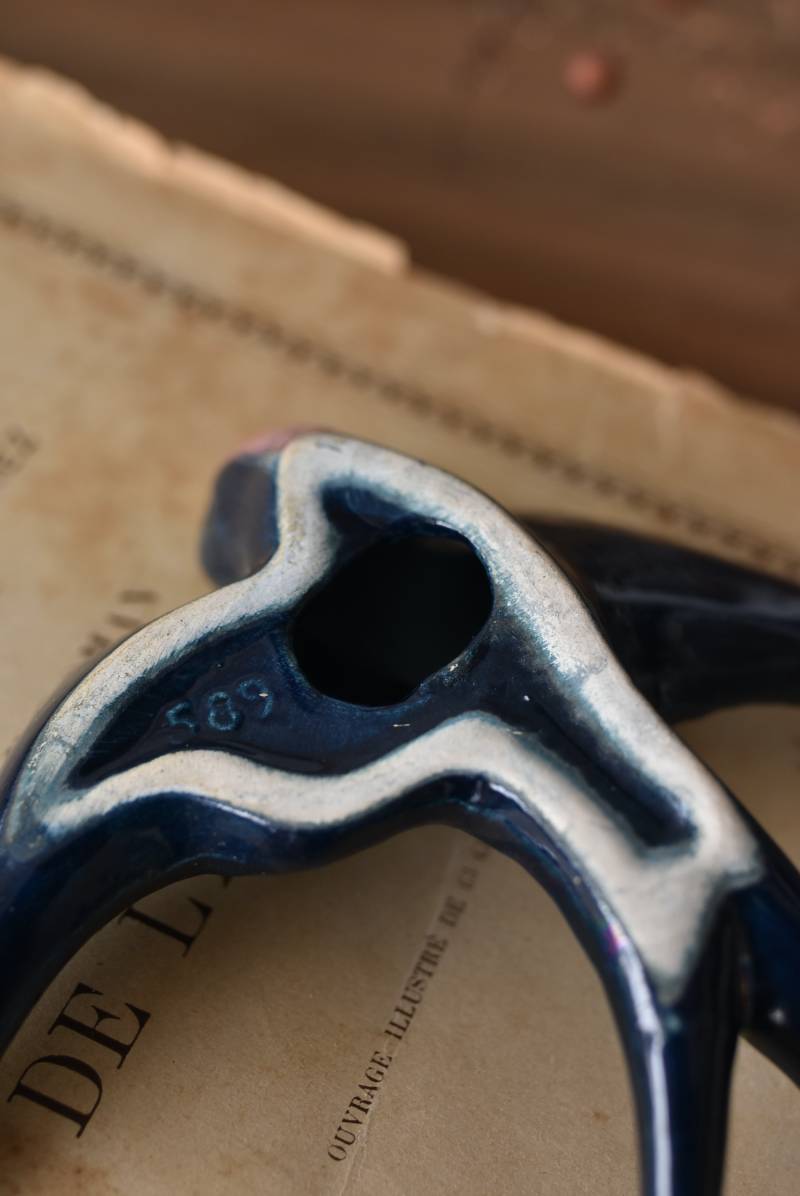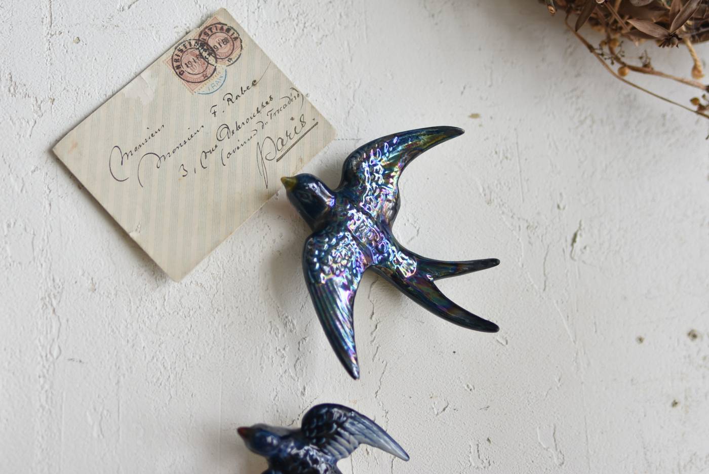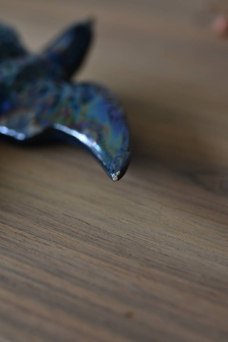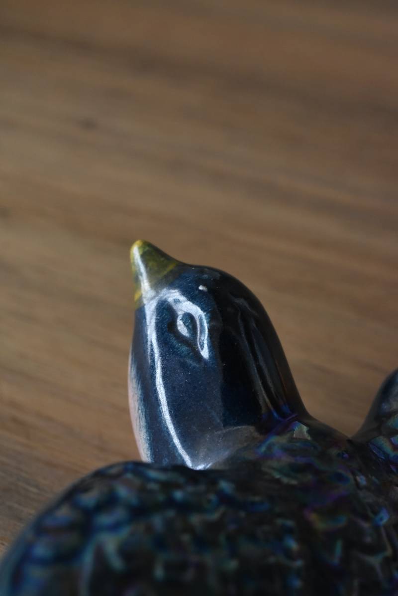 フランスで見つけた陶器のオブジェ。 幸せを運ぶと言われているツバメを象ったウォールオブジェで、気持ち良さそうに空を翔ける躍動感たっぷりな佇まい。深みのあるブルーのボディにまるで虹を纏ったかのような独自の色味が魅力の一つで、丁寧に作り込まれた翼の造形など細部にもこだわりを感じられるデザインです。裏側には壁掛け用の穴がついており、壁に掛けてウォールデコレーションとしても活躍してくれそう。 程よい存在感で遊び心のある壁面を演出し、個体差のあるツバメオブジェ達と仲良く並べて飾ってあげるのも素敵です。 W 約13.5cm D 約14cm H 約4.5cm
