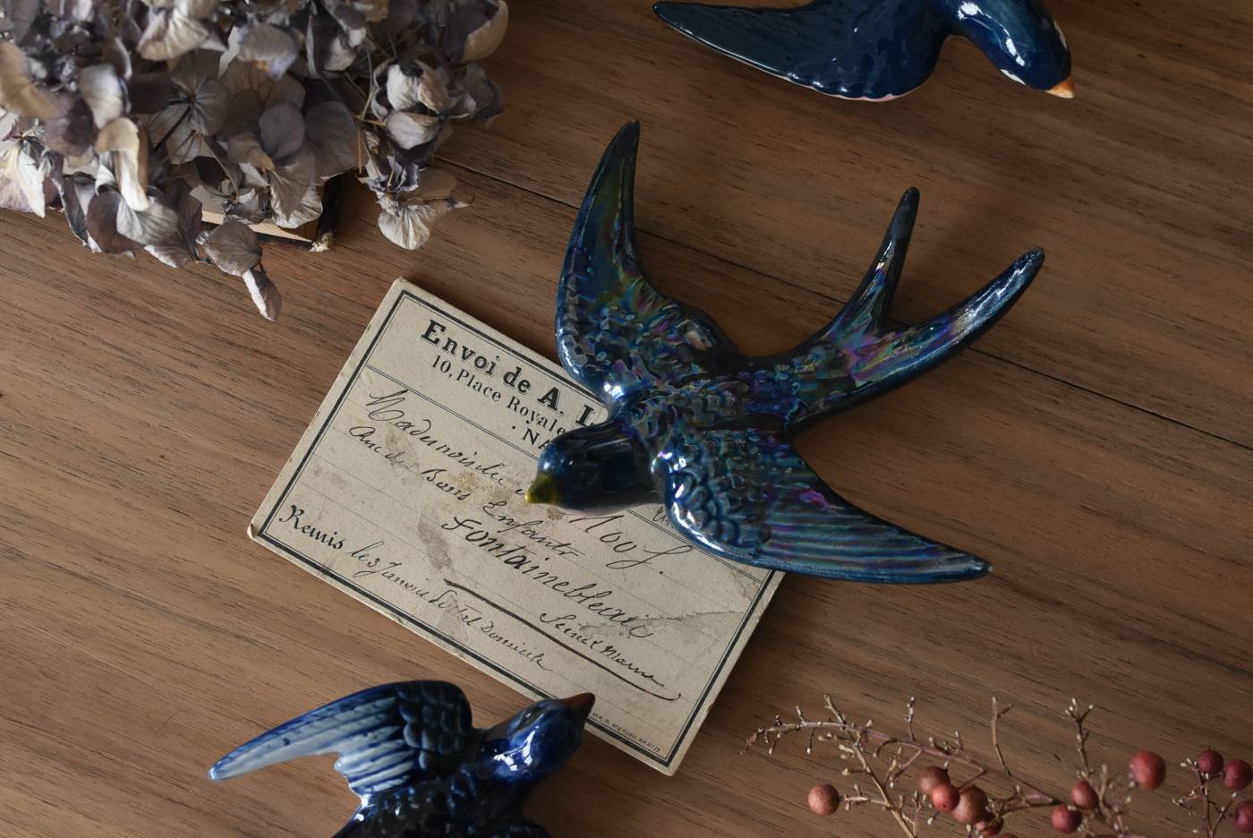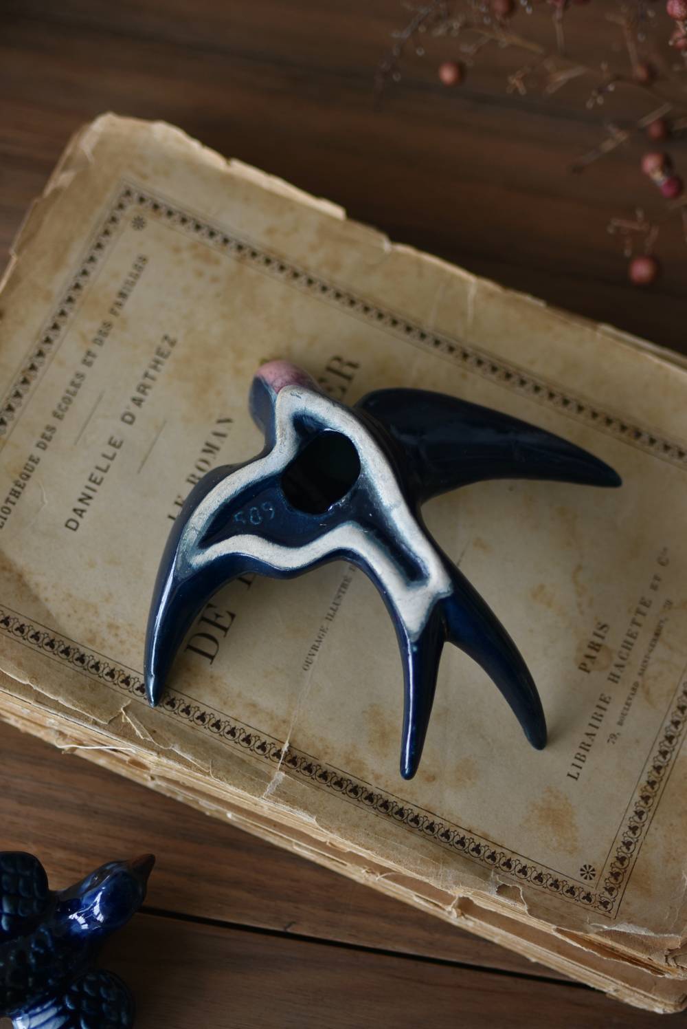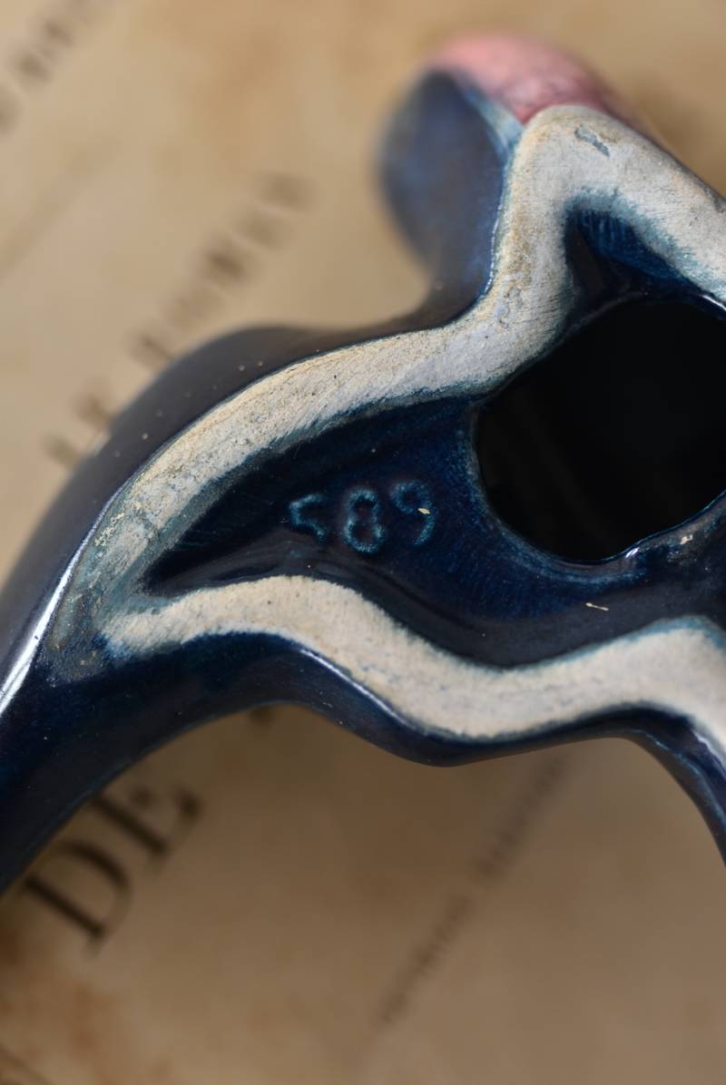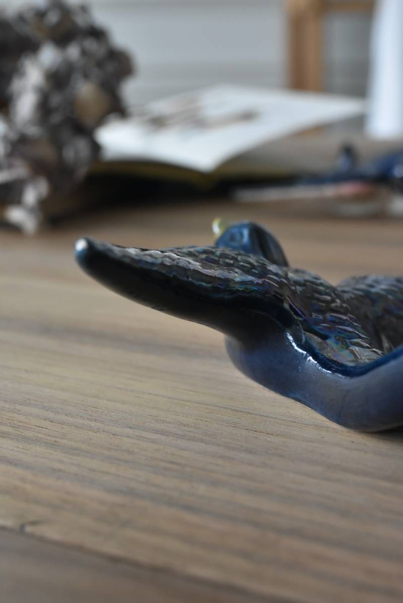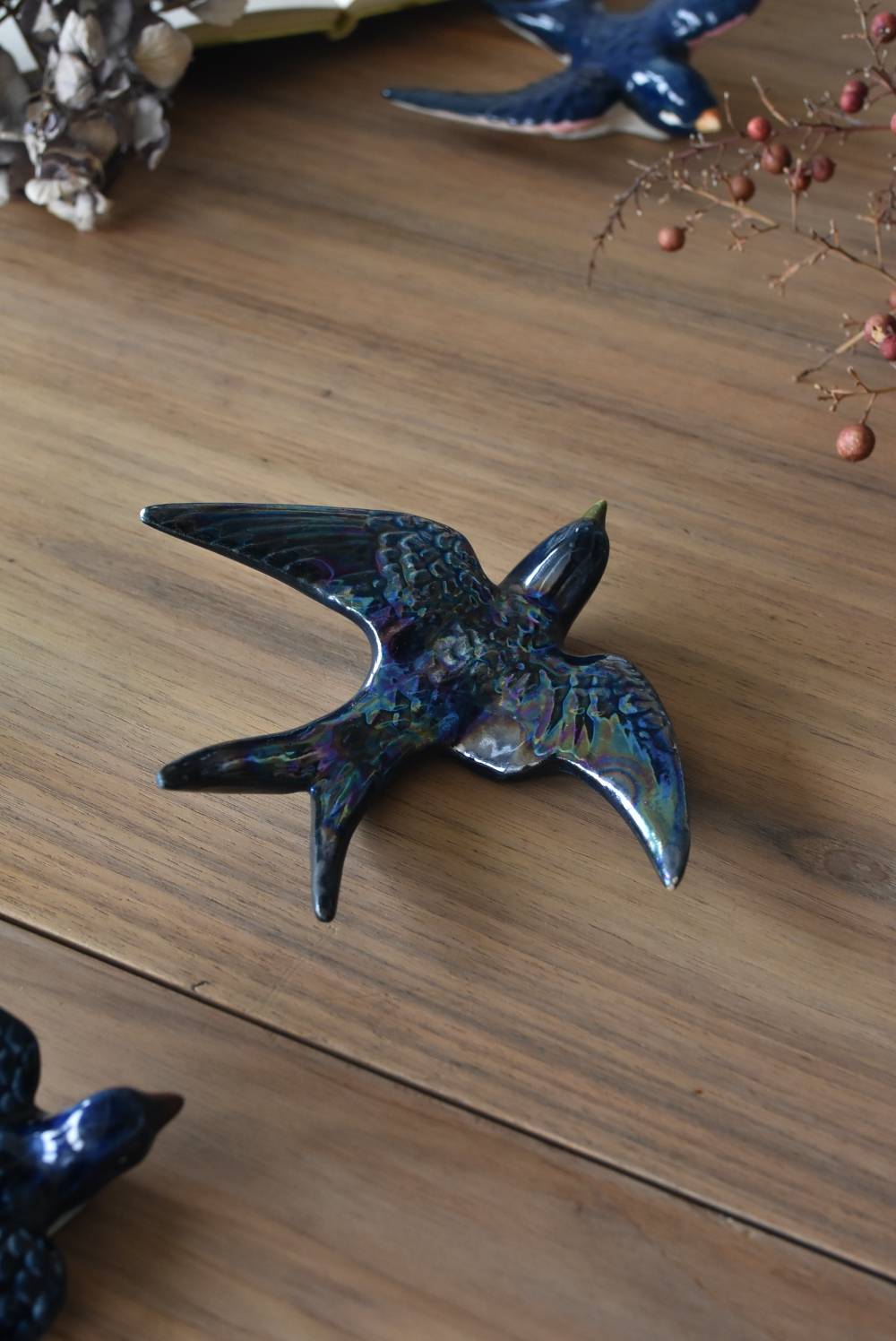 フランスで見つけた陶器のオブジェ。 幸せを運ぶと言われているツバメを象ったウォールオブジェで、気持ち良さそうに空を翔ける躍動感たっぷりな佇まい。深みのあるブルーのボディにまるで虹を纏ったかのような独自の色味が魅力の一つで、丁寧に作り込まれた翼の造形など細部にもこだわりを感じられるデザインです。裏側には壁掛け用の穴がついており、壁に掛けてウォールデコレーションとしても活躍してくれそう。 程よい存在感で遊び心のある壁面を演出し、個体差のあるツバメオブジェ達と仲良く並べて飾ってあげるのも素敵です。 W 約13.5cm D 約14cm H 約4.5cm