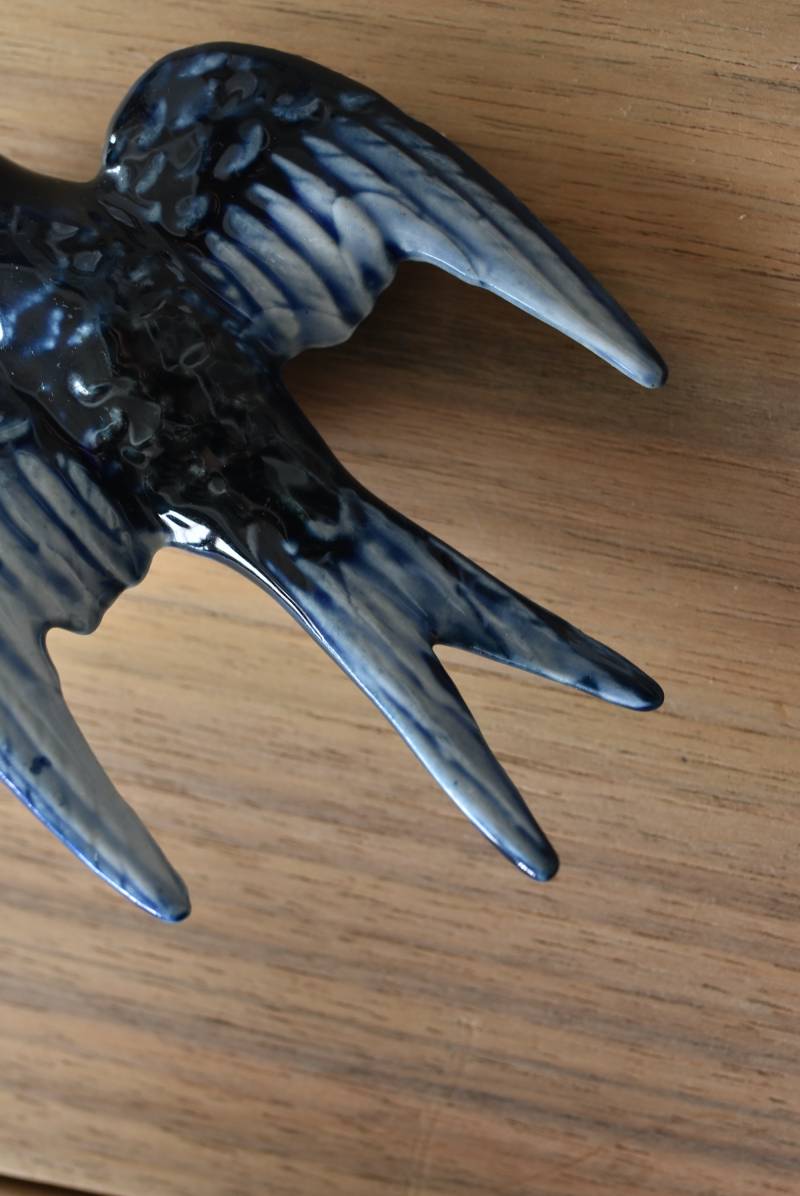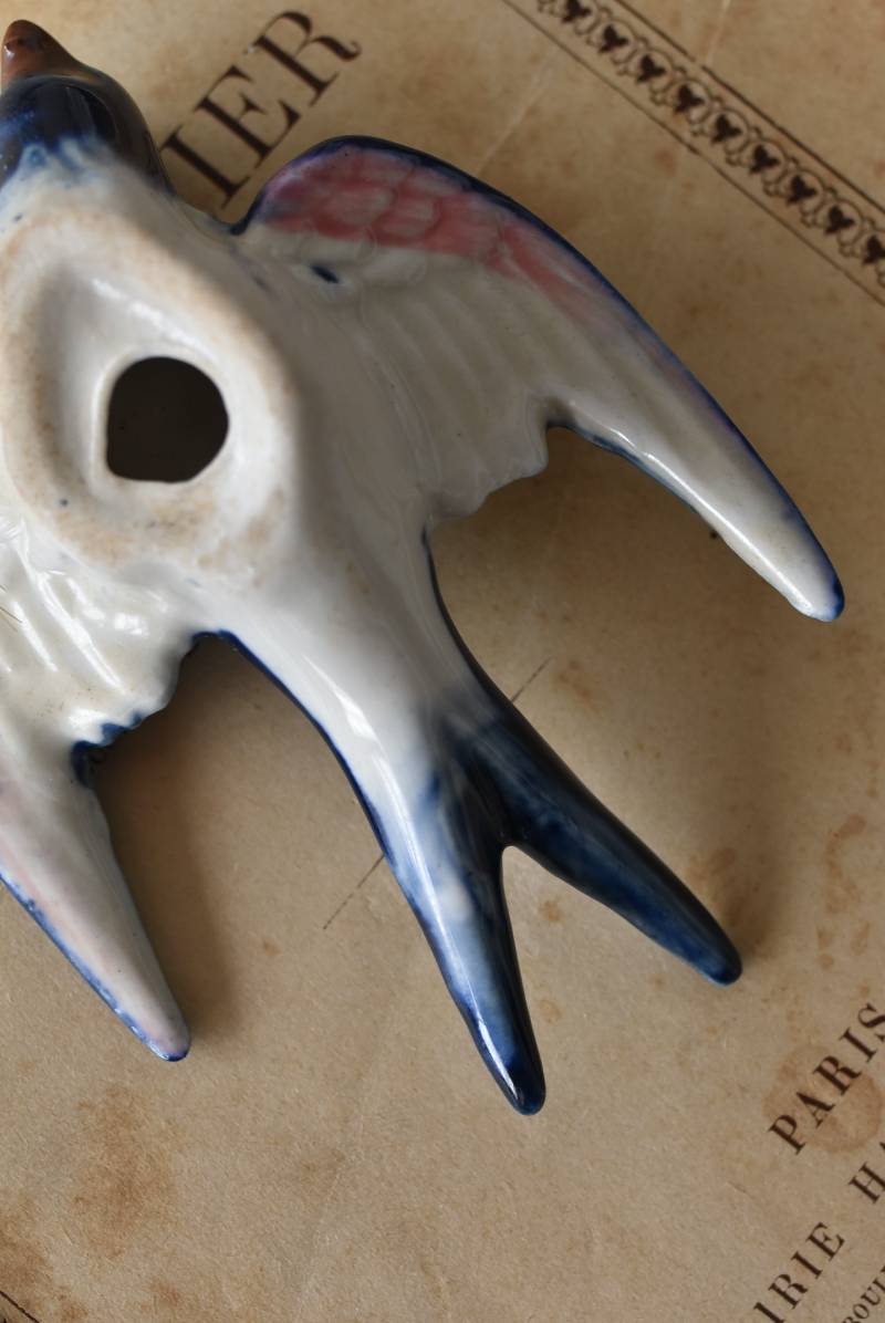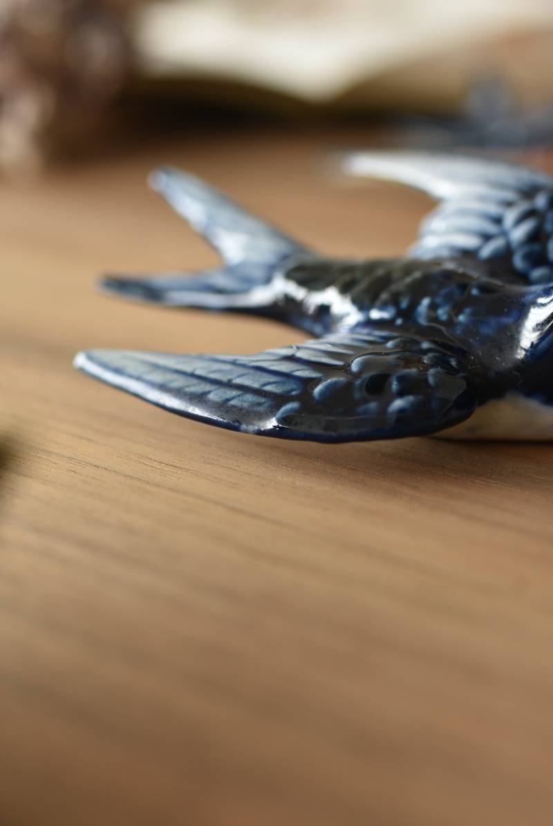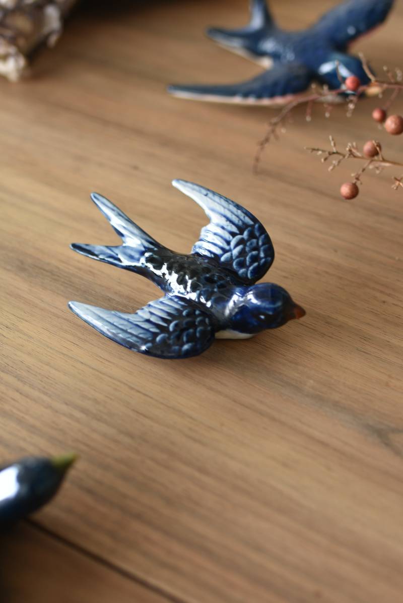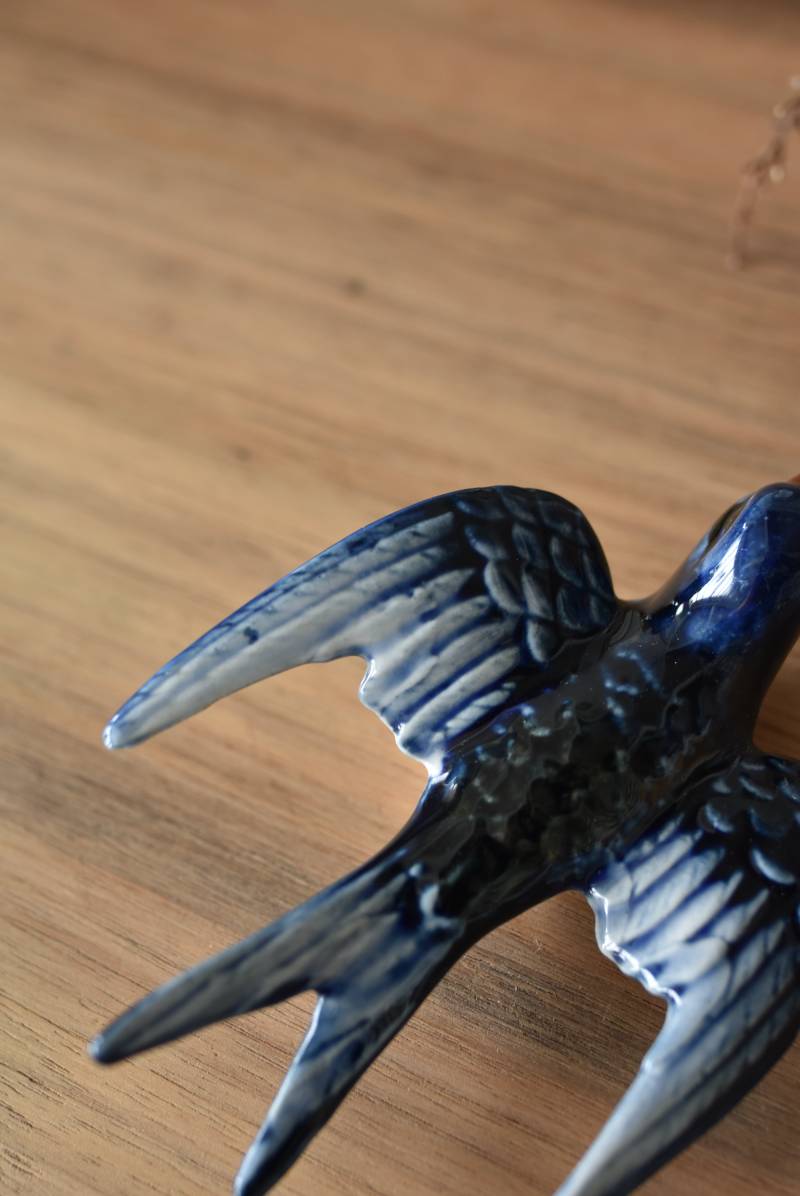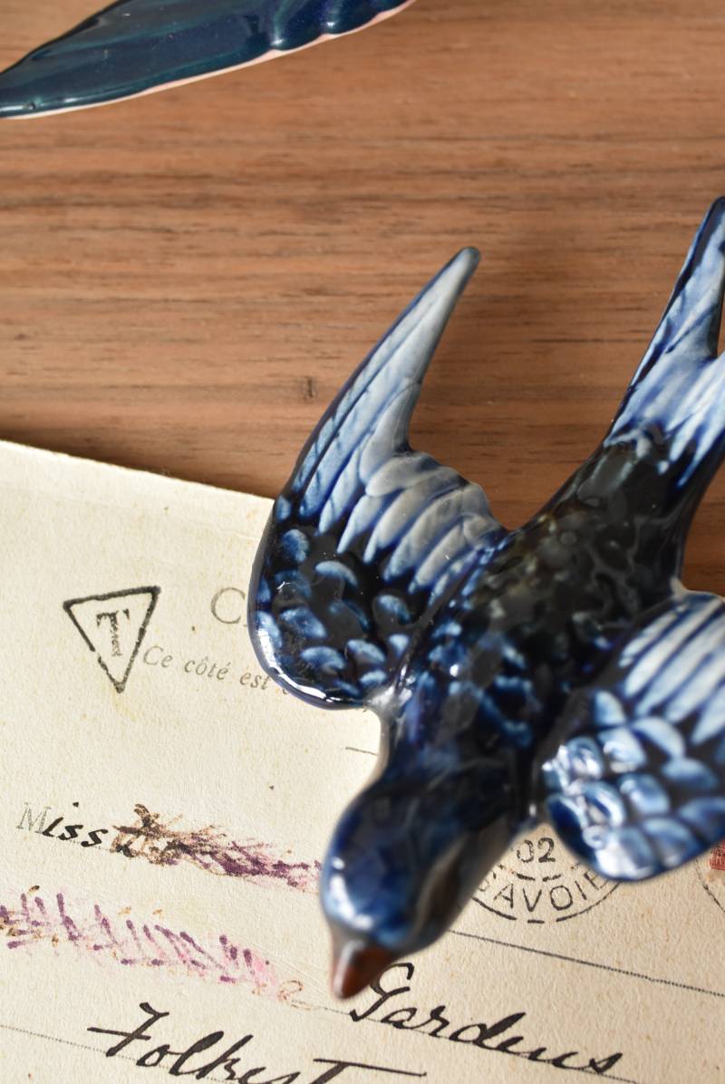 フランスで見つけた陶器のオブジェ。 幸せを運ぶと言われているツバメを象ったウォールオブジェで、気持ち良さそうに空を翔ける躍動感たっぷりな佇まい。やや小さめのボディは深みのあるブルーと淡いホワイトに彩られ、丁寧に作り込まれた翼の造形など細部にもこだわりを感じられるデザインです。裏側には壁掛け用の穴がついており、壁に掛けてウォールデコレーションとしても活躍してくれそう。 程よい存在感で遊び心のある壁面を演出し、個体差のあるツバメオブジェ達と仲良く並べて飾ってあげるのも素敵です。 W 約10.5cm D 約7.5cm H 約3.5cm