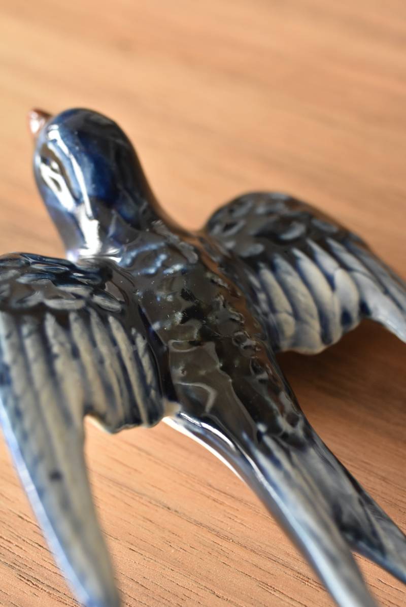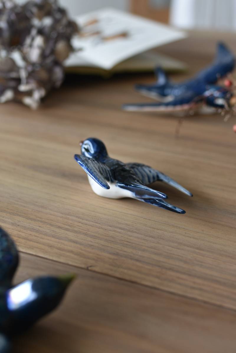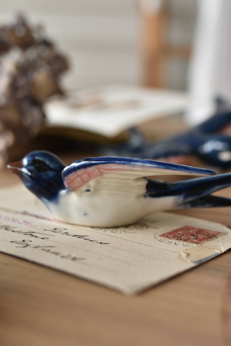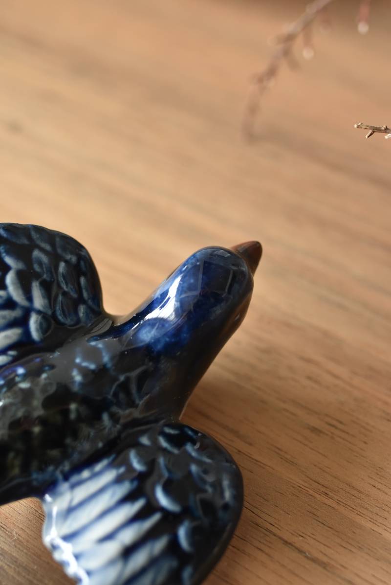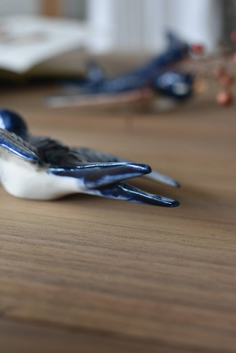 フランスで見つけた陶器のオブジェ。 幸せを運ぶと言われているツバメを象ったウォールオブジェで、気持ち良さそうに空を翔ける躍動感たっぷりな佇まい。やや小さめのボディは深みのあるブルーと淡いホワイトに彩られ、丁寧に作り込まれた翼の造形など細部にもこだわりを感じられるデザインです。裏側には壁掛け用の穴がついており、壁に掛けてウォールデコレーションとしても活躍してくれそう。 程よい存在感で遊び心のある壁面を演出し、個体差のあるツバメオブジェ達と仲良く並べて飾ってあげるのも素敵です。 W 約10.5cm D 約7.5cm H 約3.5cm