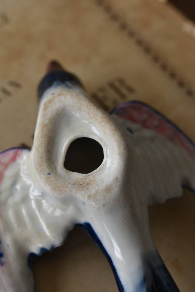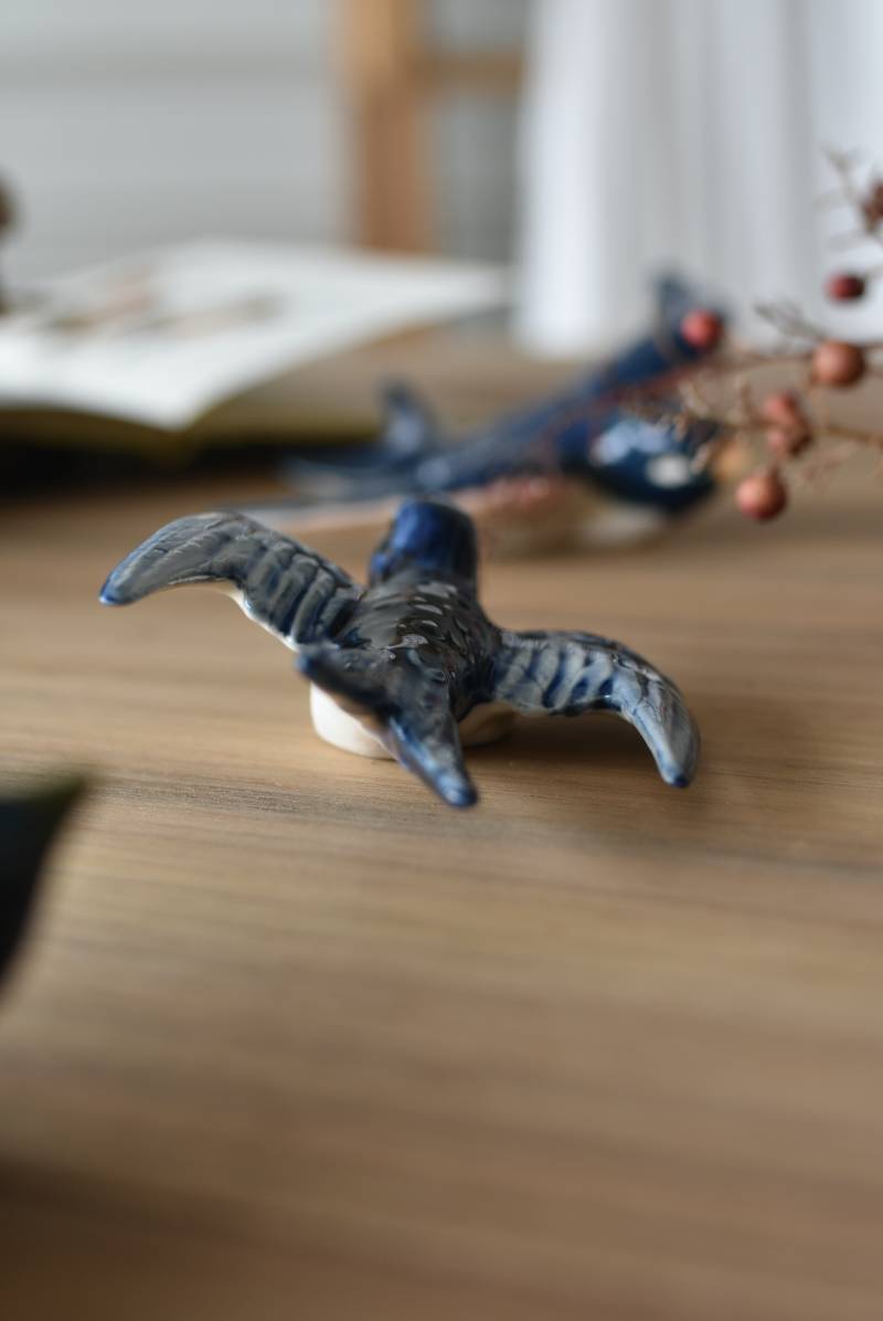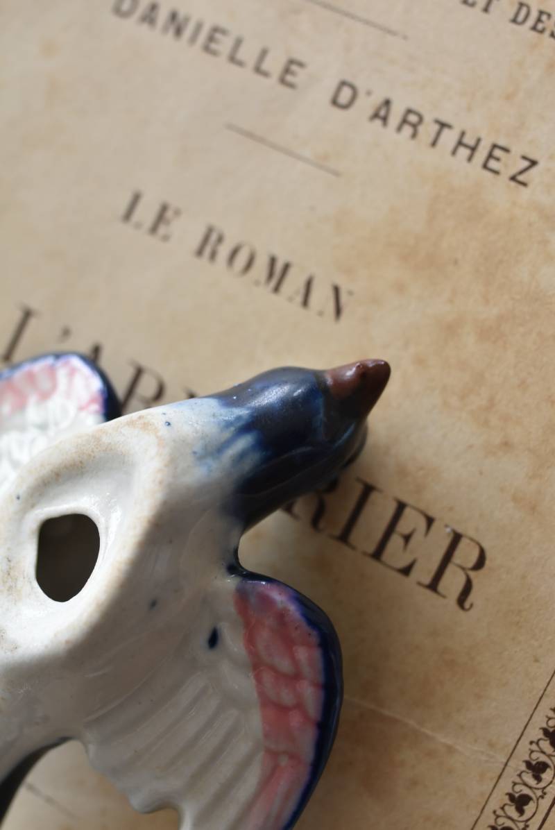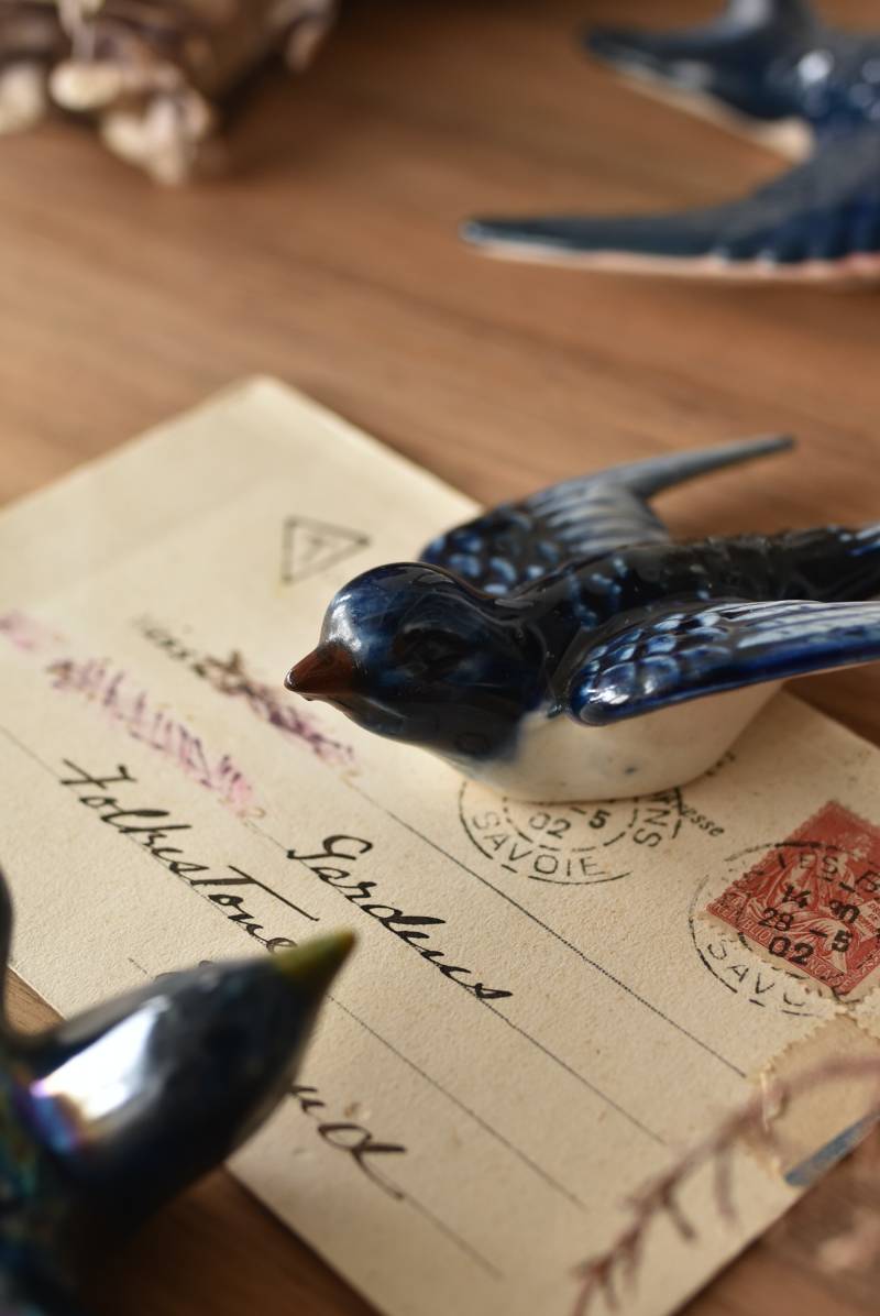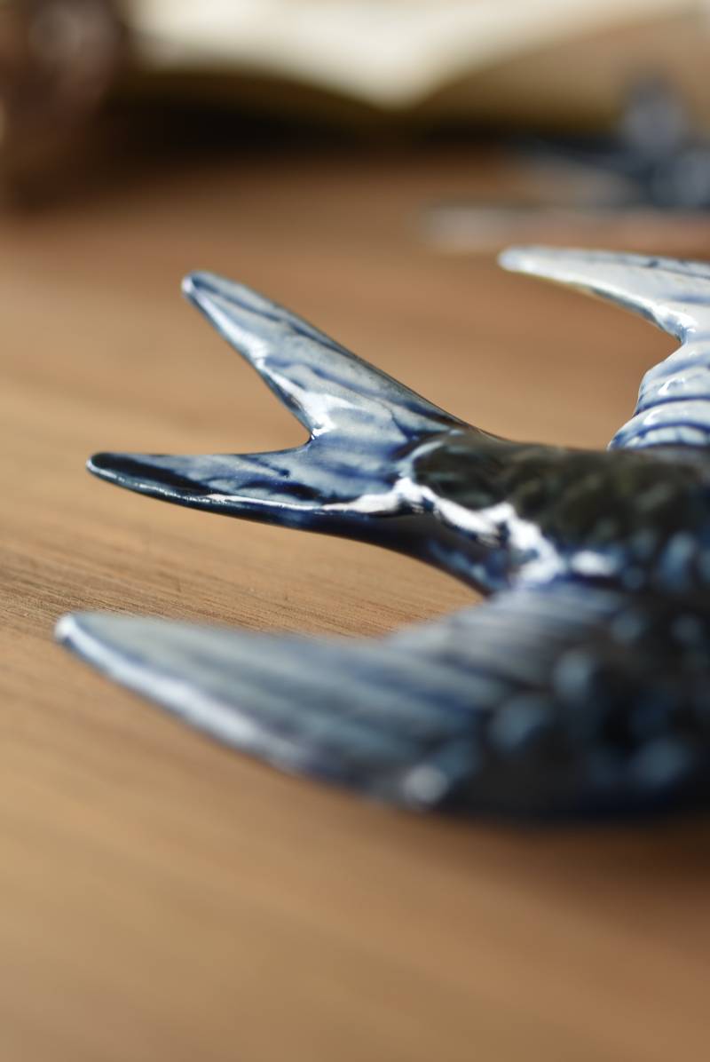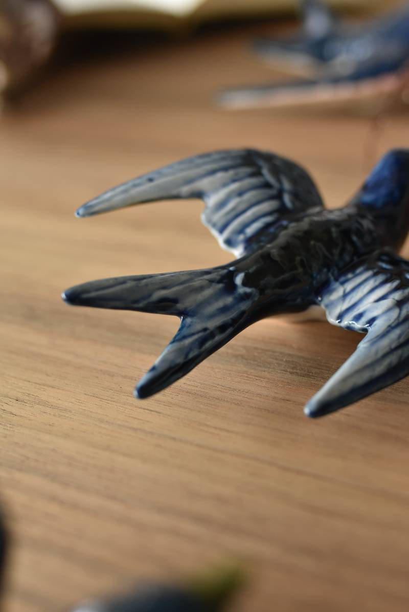フランスで見つけた陶器のオブジェ。 幸せを運ぶと言われているツバメを象ったウォールオブジェで、気持ち良さそうに空を翔ける躍動感たっぷりな佇まい。やや小さめのボディは深みのあるブルーと淡いホワイトに彩られ、丁寧に作り込まれた翼の造形など細部にもこだわりを感じられるデザインです。裏側には壁掛け用の穴がついており、壁に掛けてウォールデコレーションとしても活躍してくれそう。 程よい存在感で遊び心のある壁面を演出し、個体差のあるツバメオブジェ達と仲良く並べて飾ってあげるのも素敵です。 W 約10.5cm D 約7.5cm H 約3.5cm