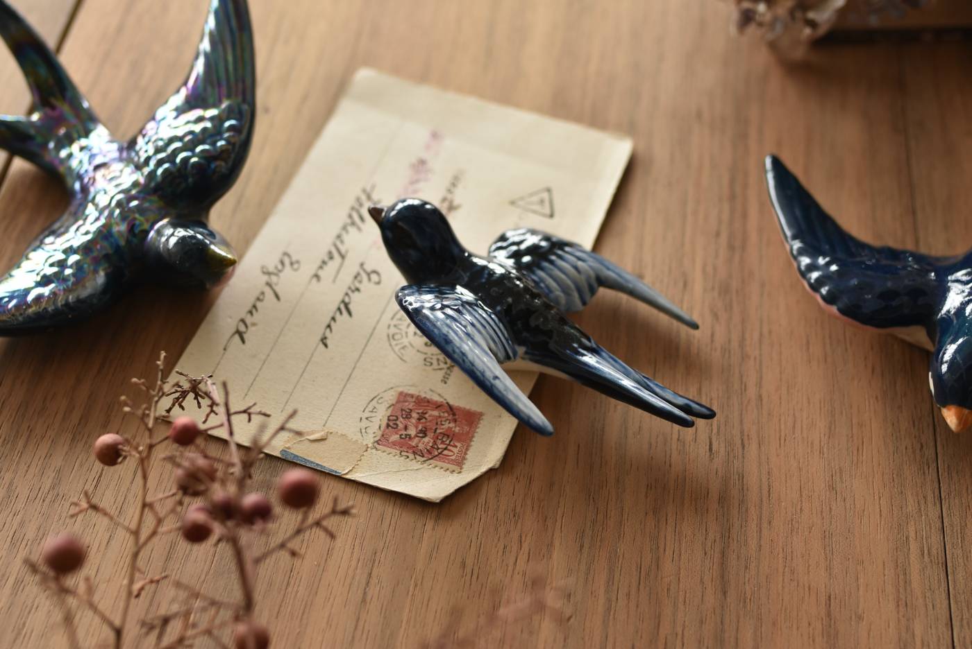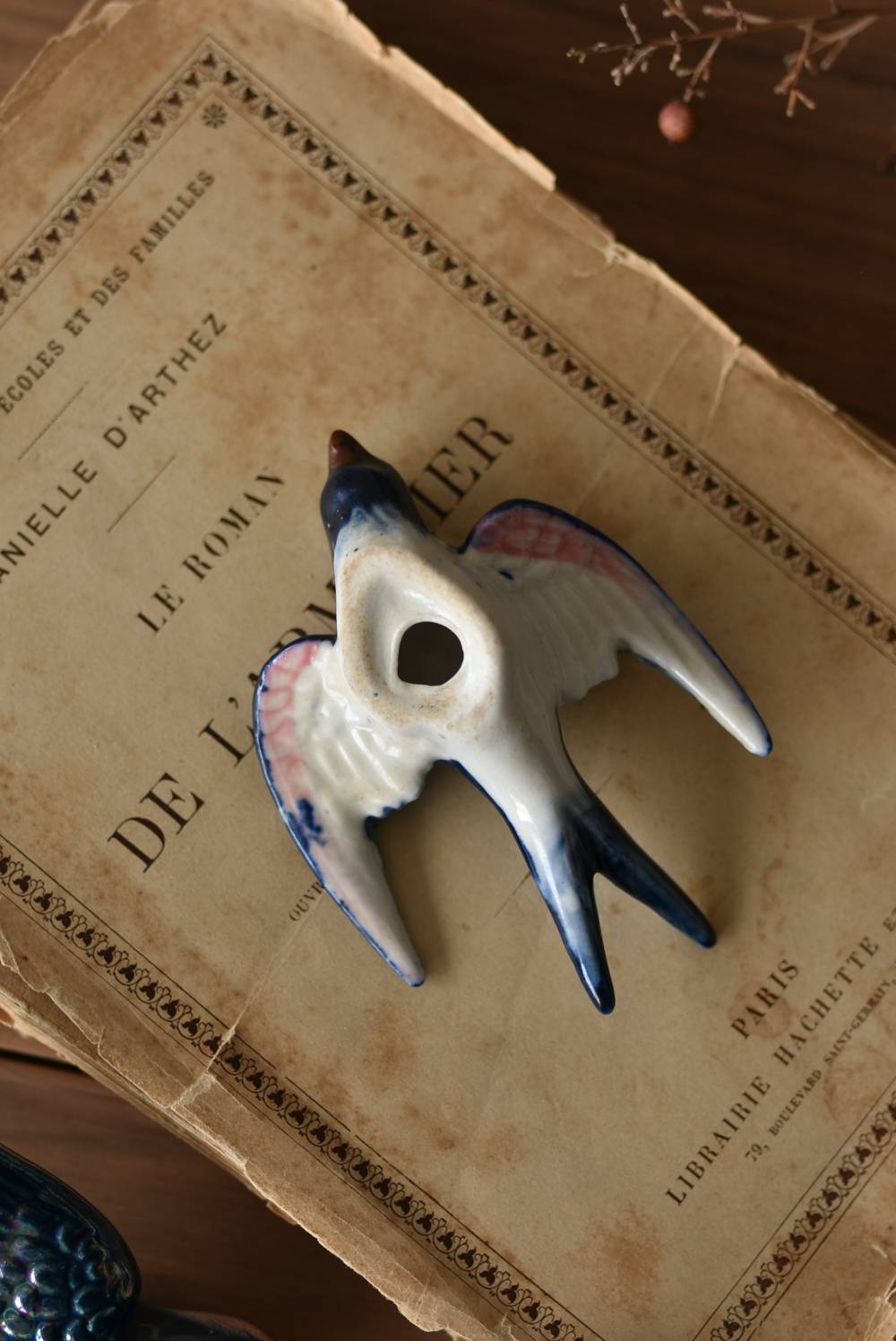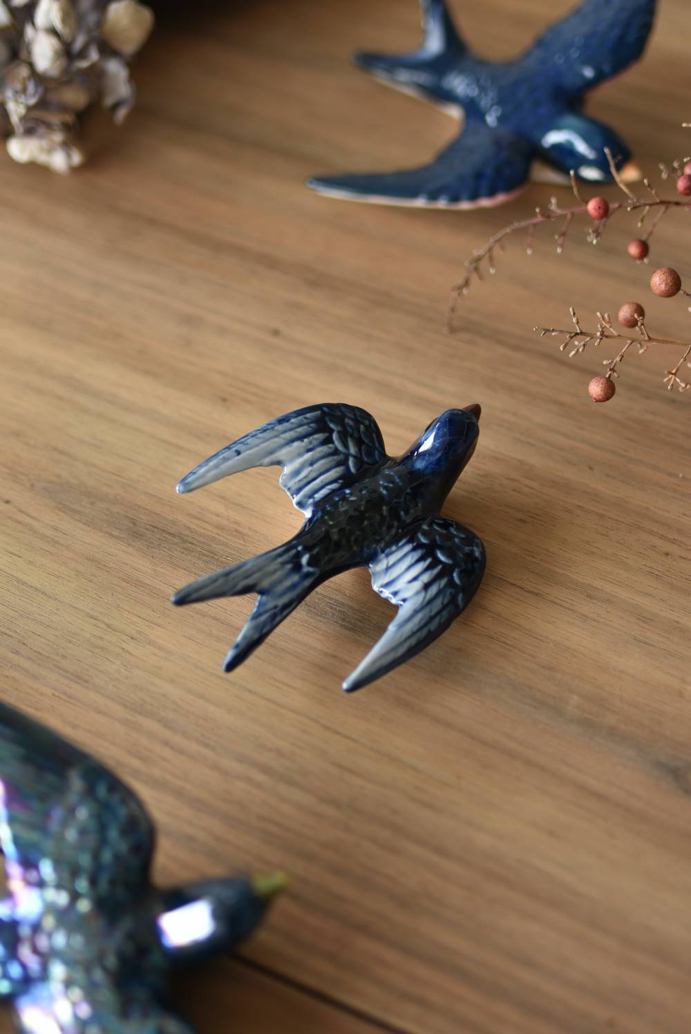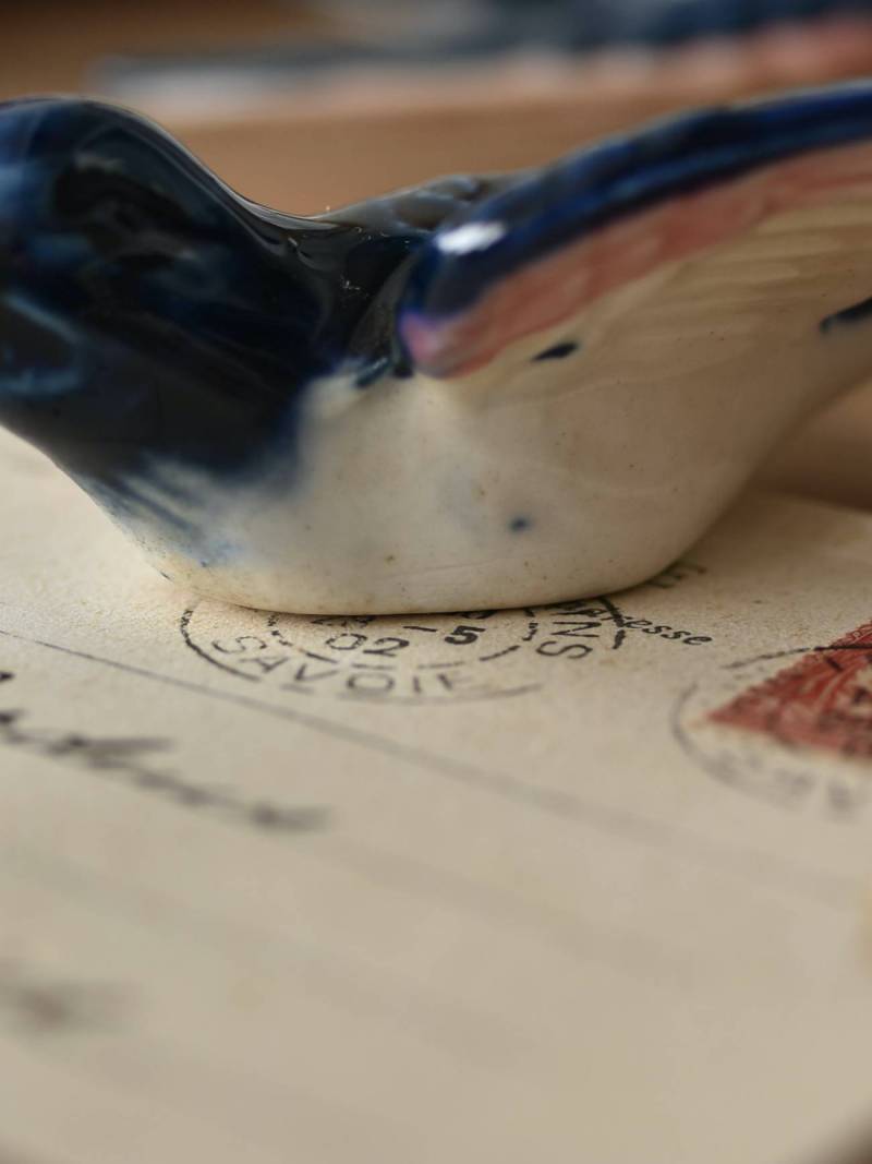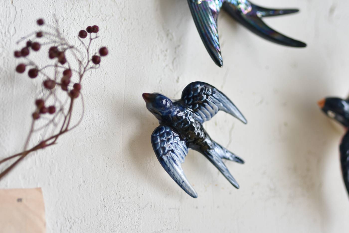 フランスで見つけた陶器のオブジェ。 幸せを運ぶと言われているツバメを象ったウォールオブジェで、気持ち良さそうに空を翔ける躍動感たっぷりな佇まい。やや小さめのボディは深みのあるブルーと淡いホワイトに彩られ、丁寧に作り込まれた翼の造形など細部にもこだわりを感じられるデザインです。裏側には壁掛け用の穴がついており、壁に掛けてウォールデコレーションとしても活躍してくれそう。 程よい存在感で遊び心のある壁面を演出し、個体差のあるツバメオブジェ達と仲良く並べて飾ってあげるのも素敵です。 W 約10.5cm D 約7.5cm H 約3.5cm