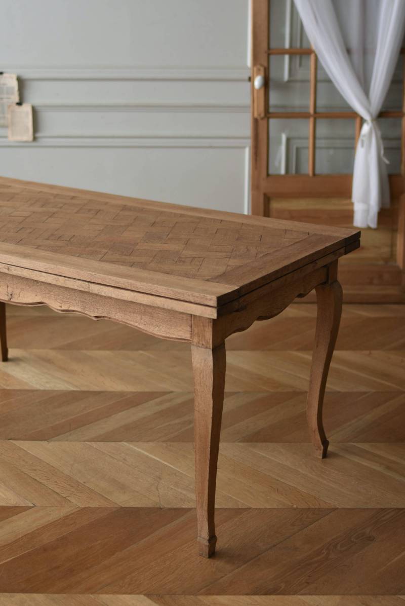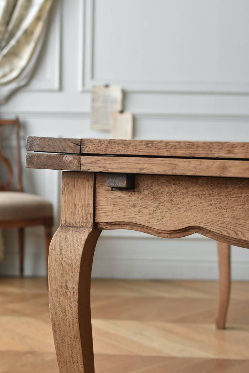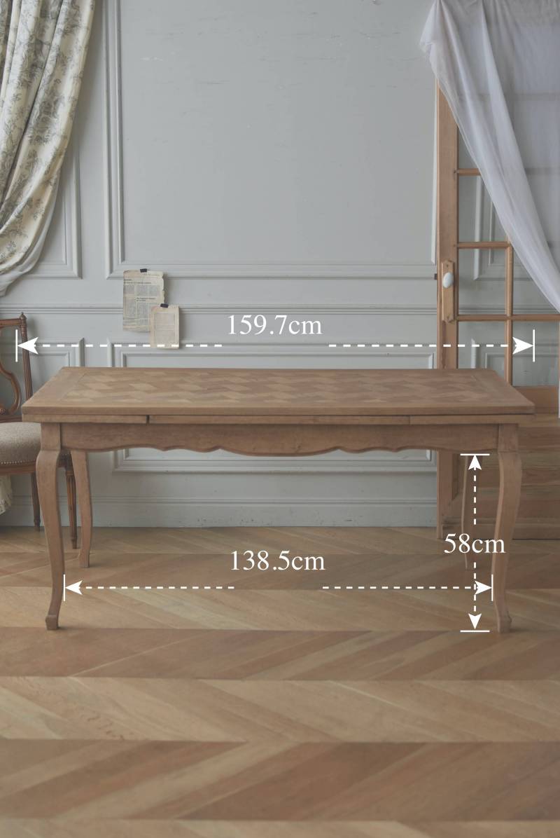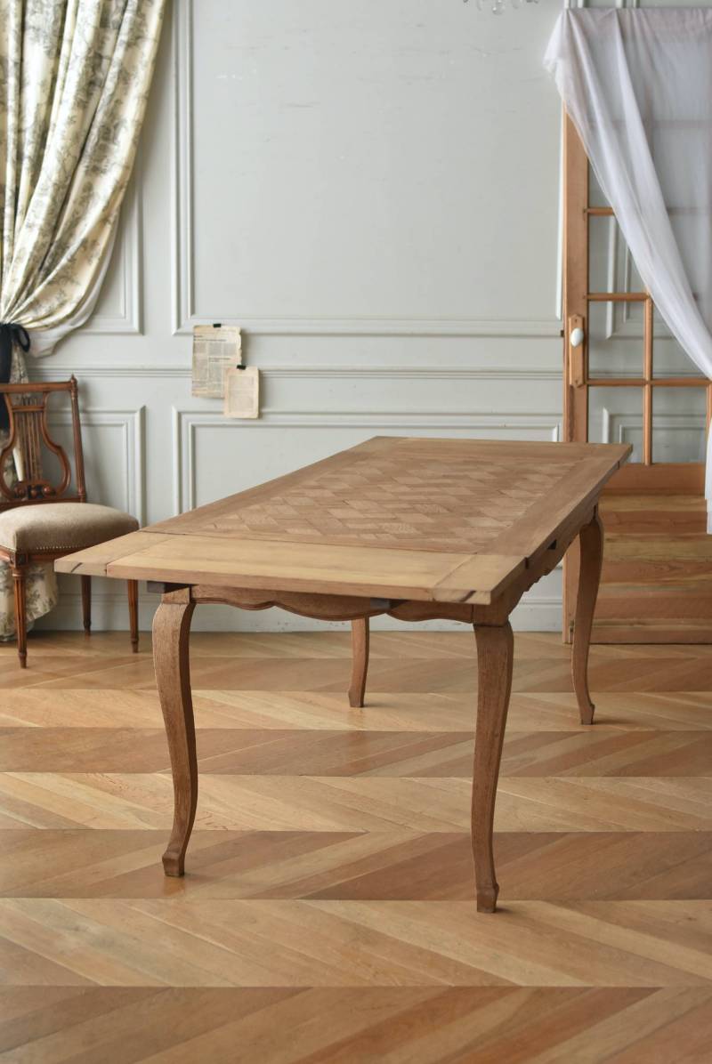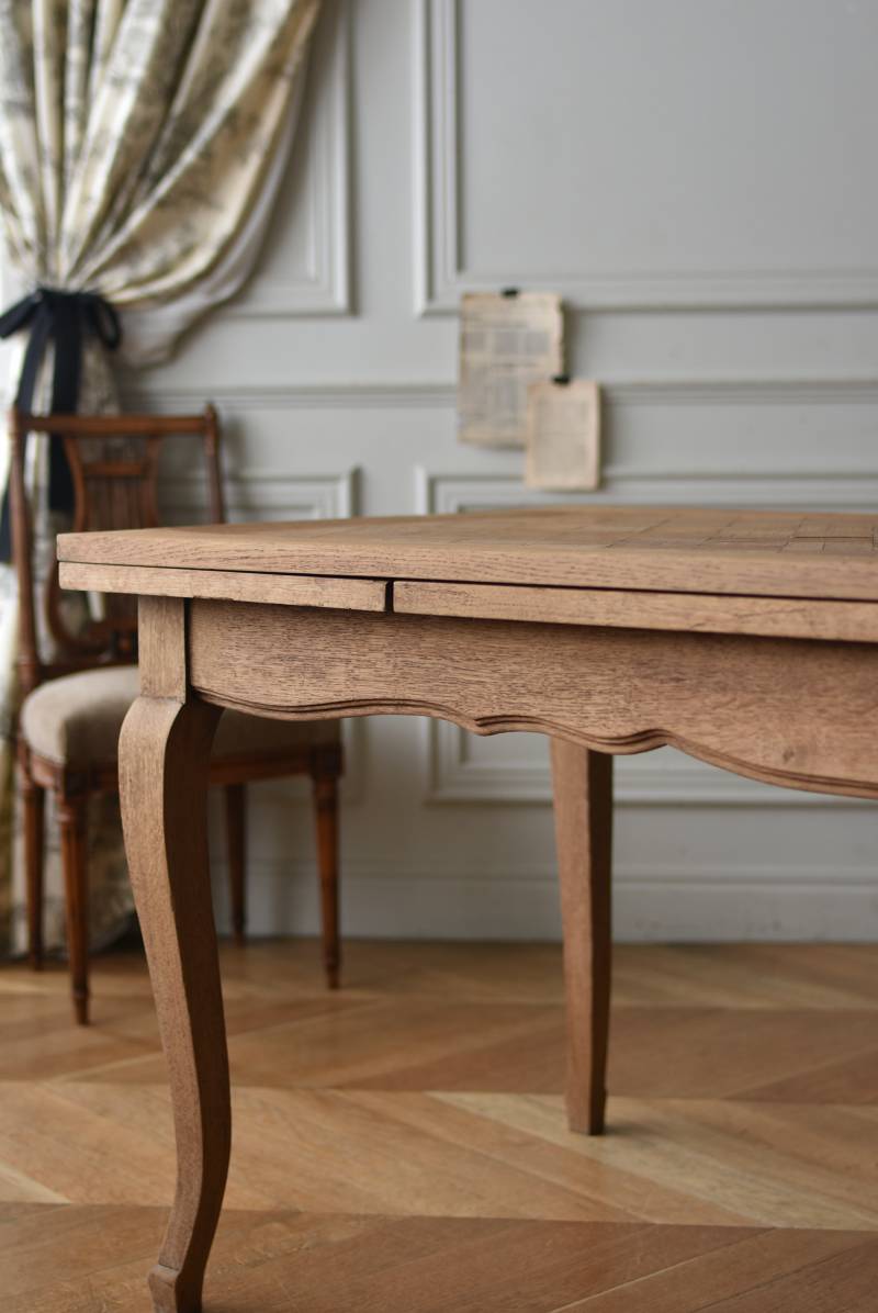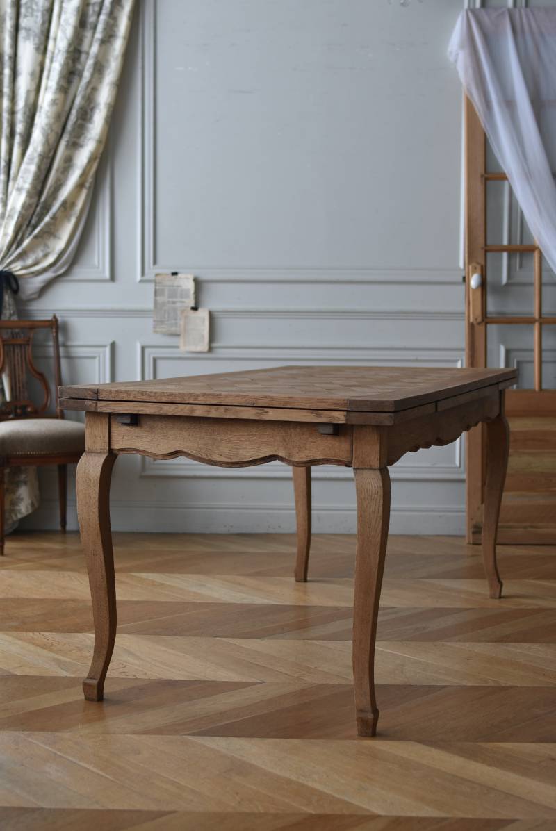 剥離されたオーク材の豊かな表情が深みを増し、どっしりと構えた風格漂う佇まい。穏やかに波打つ幕板ラインや天板にあしらわれた突板模様が美しく、厳格さを残しながらもフランスらしい優美なイメージをもたらしてくれるデザインとなっています。天板は左右に引き出して広げることができ、シーンに合わせて変形を楽しめるフレキシブルな構造に。