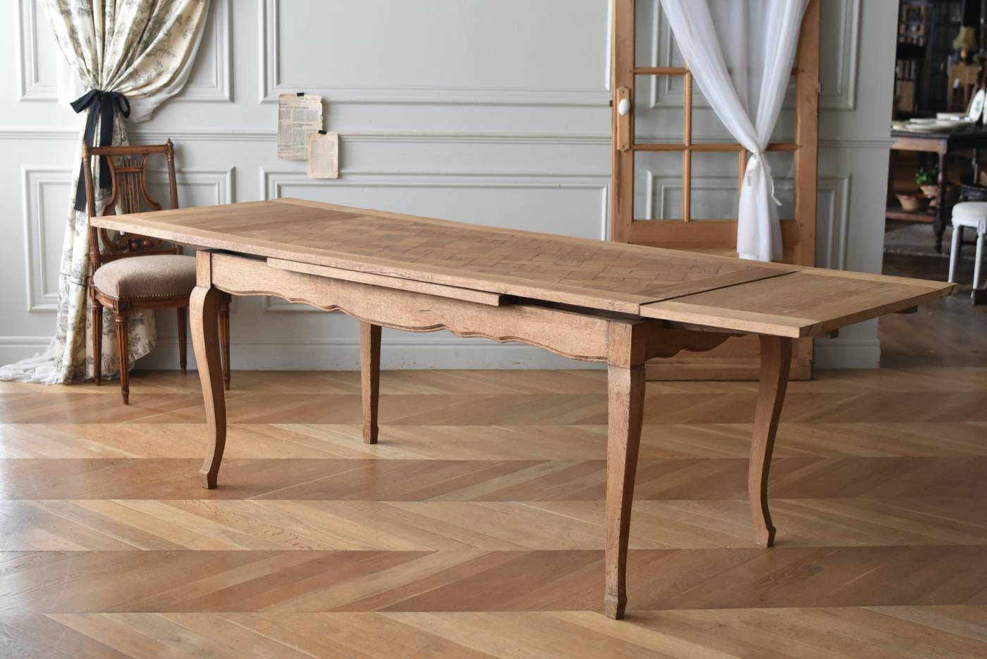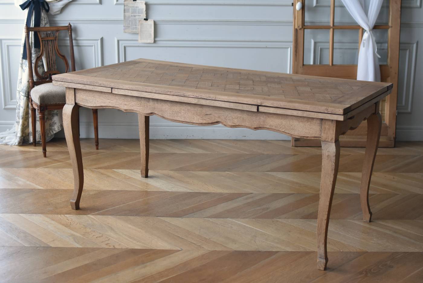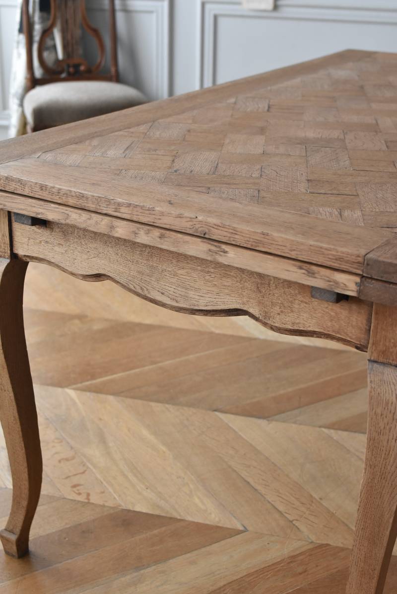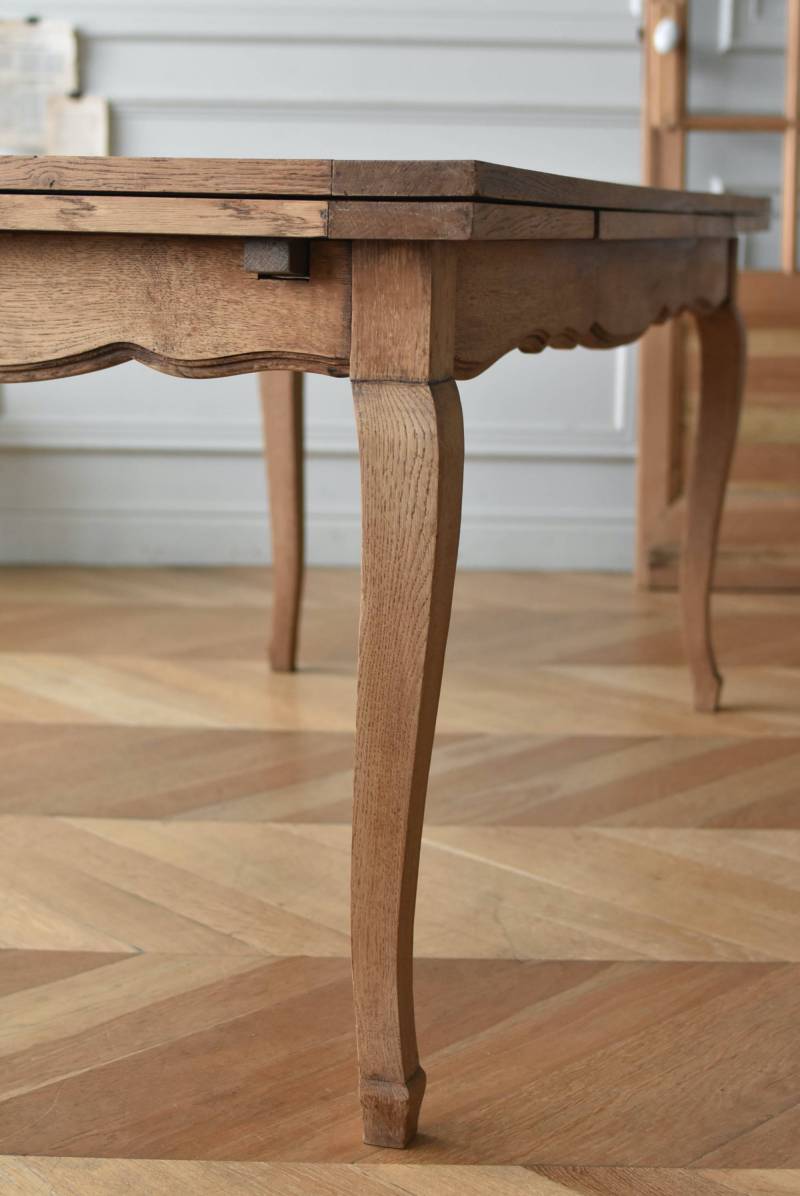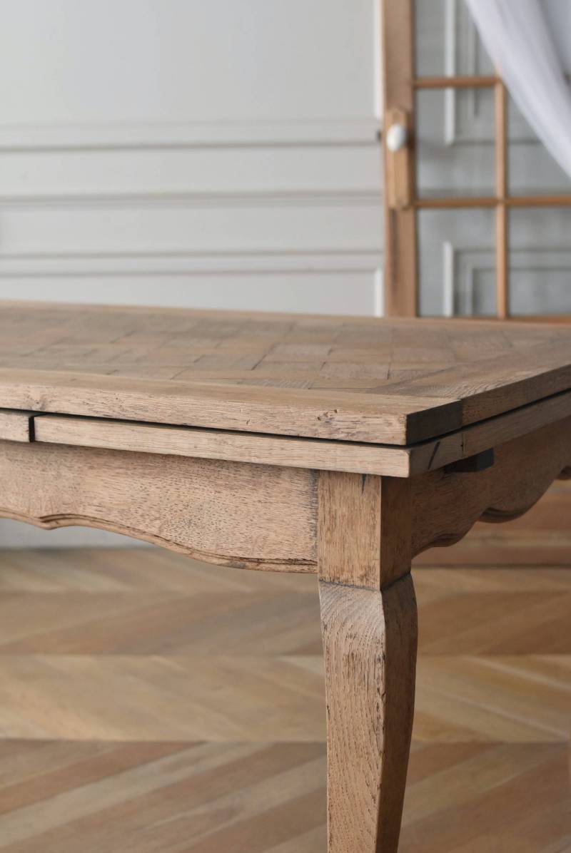 剥離されたオーク材の豊かな表情が深みを増し、どっしりと構えた風格漂う佇まい。穏やかに波打つ幕板ラインや天板にあしらわれた突板模様が美しく、厳格さを残しながらもフランスらしい優美なイメージをもたらしてくれるデザインとなっています。天板は左右に引き出して広げることができ、シーンに合わせて変形を楽しめるフレキシブルな構造に。