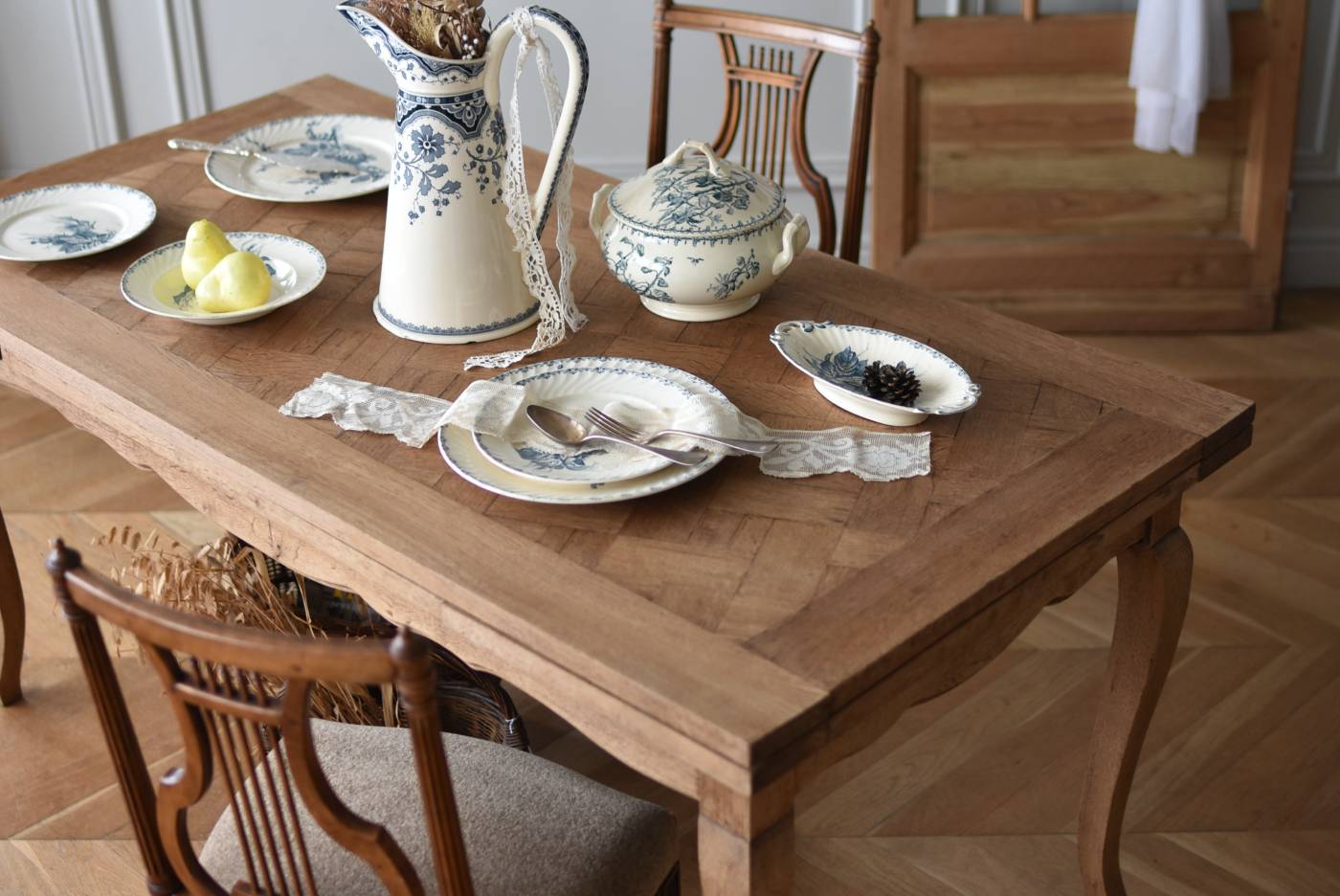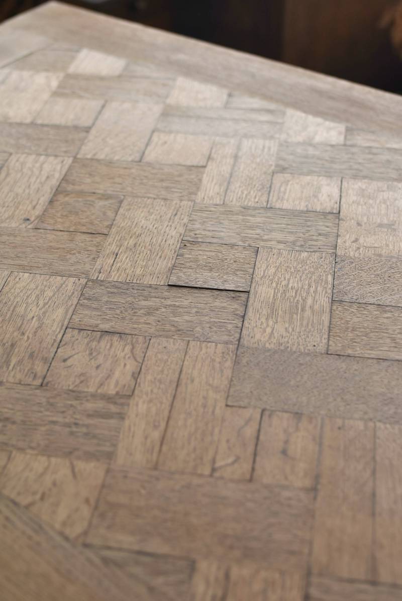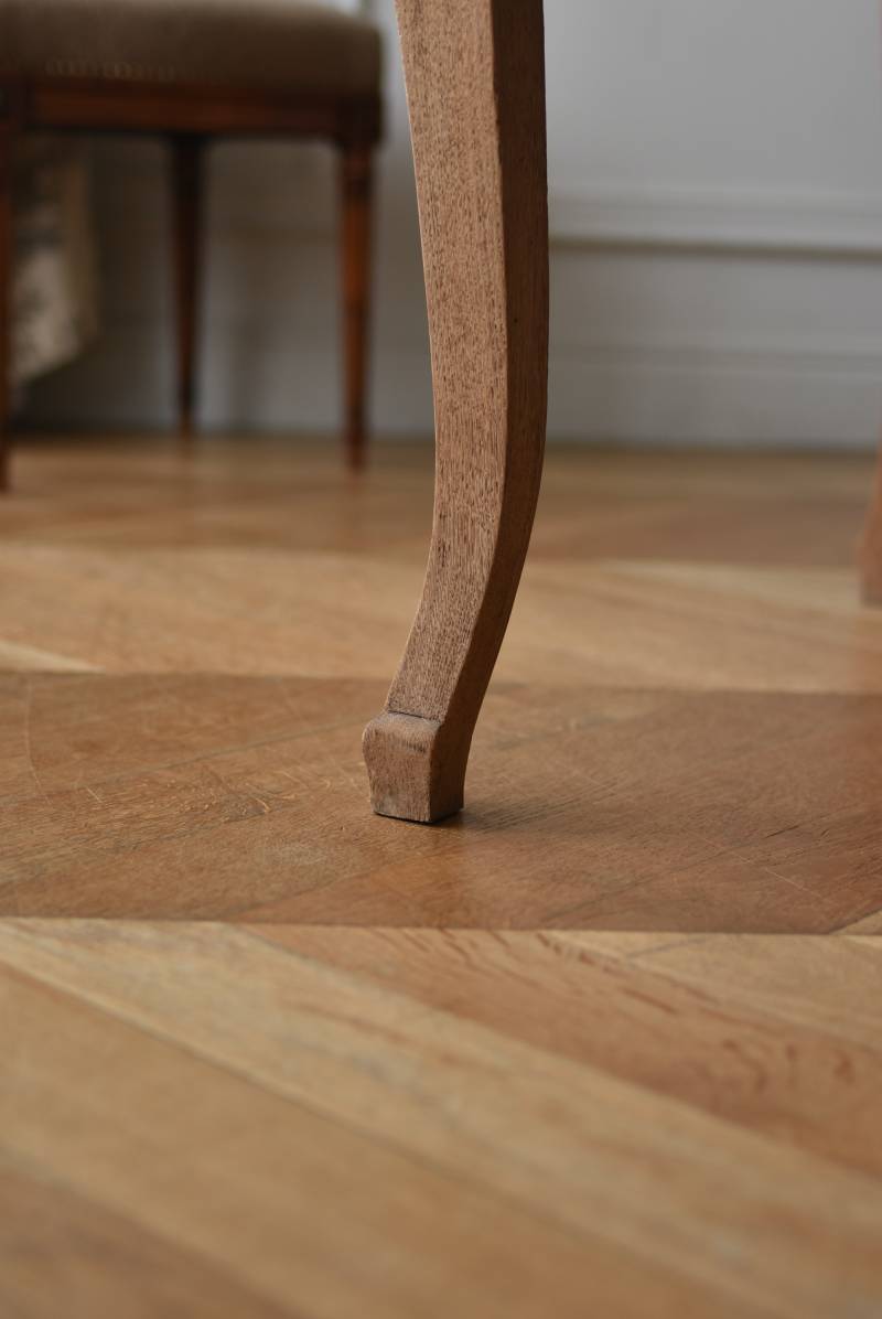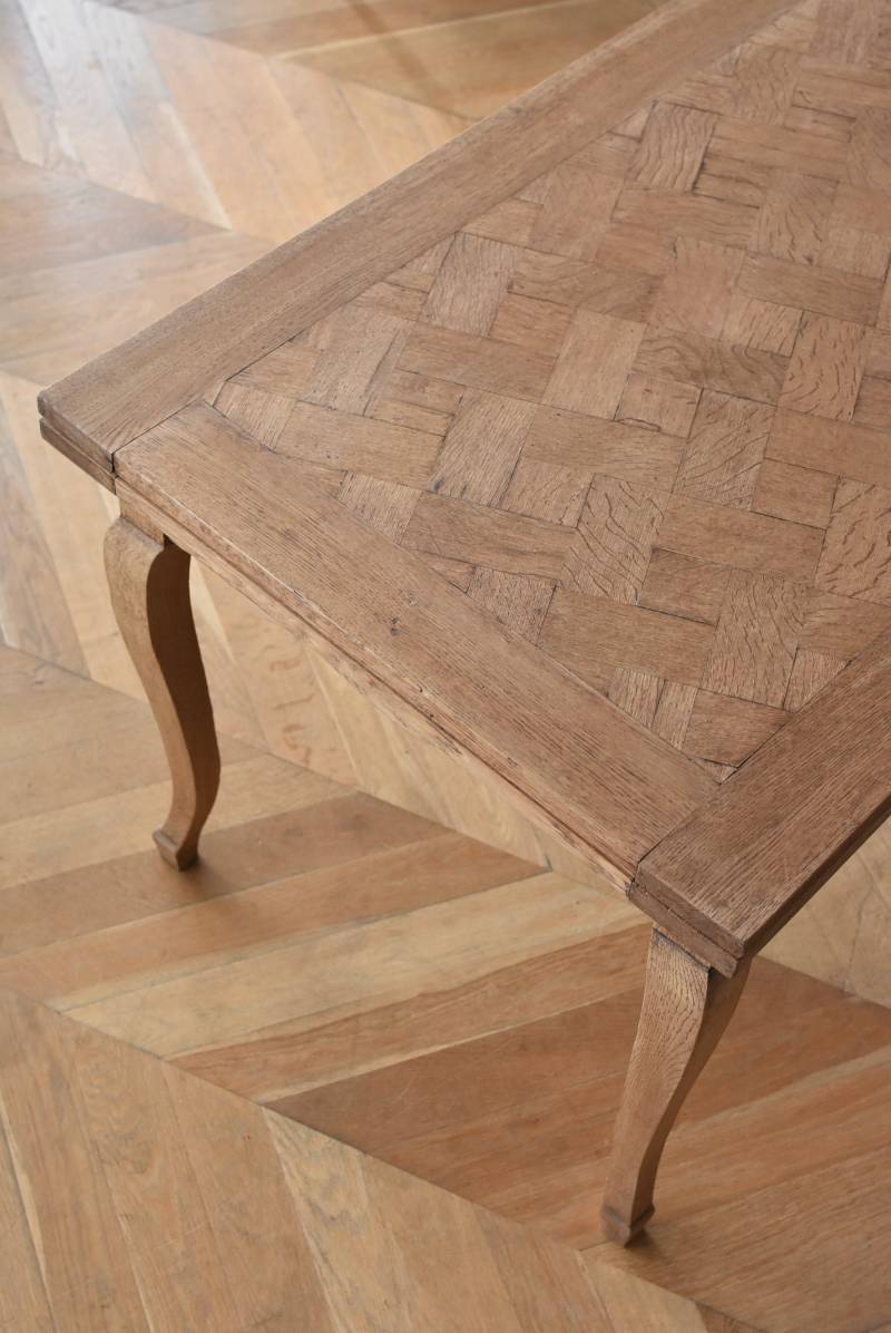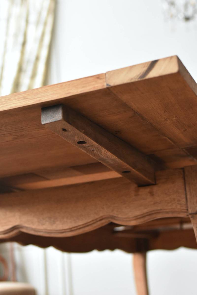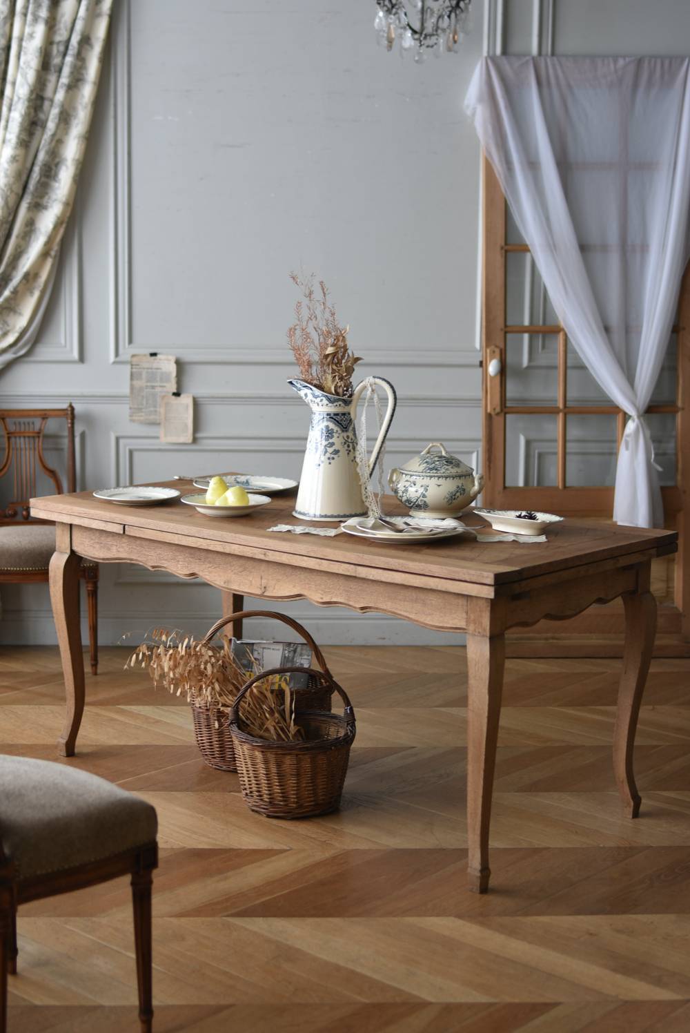 剥離されたオーク材の豊かな表情が深みを増し、どっしりと構えた風格漂う佇まい。穏やかに波打つ幕板ラインや天板にあしらわれた突板模様が美しく、厳格さを残しながらもフランスらしい優美なイメージをもたらしてくれるデザインとなっています。天板は左右に引き出して広げることができ、シーンに合わせて変形を楽しめるフレキシブルな構造に。