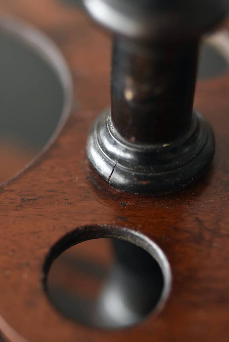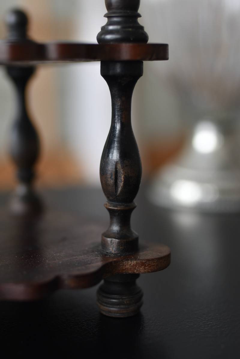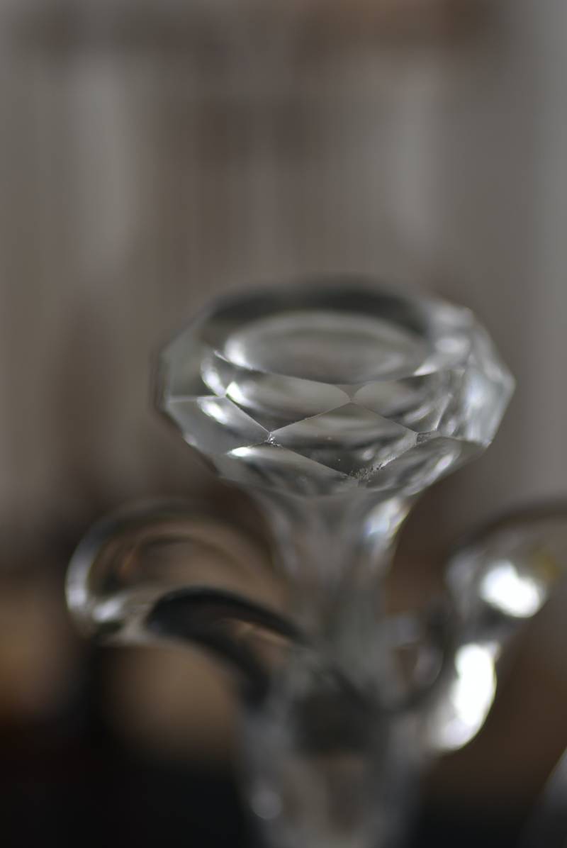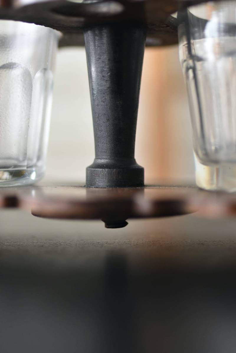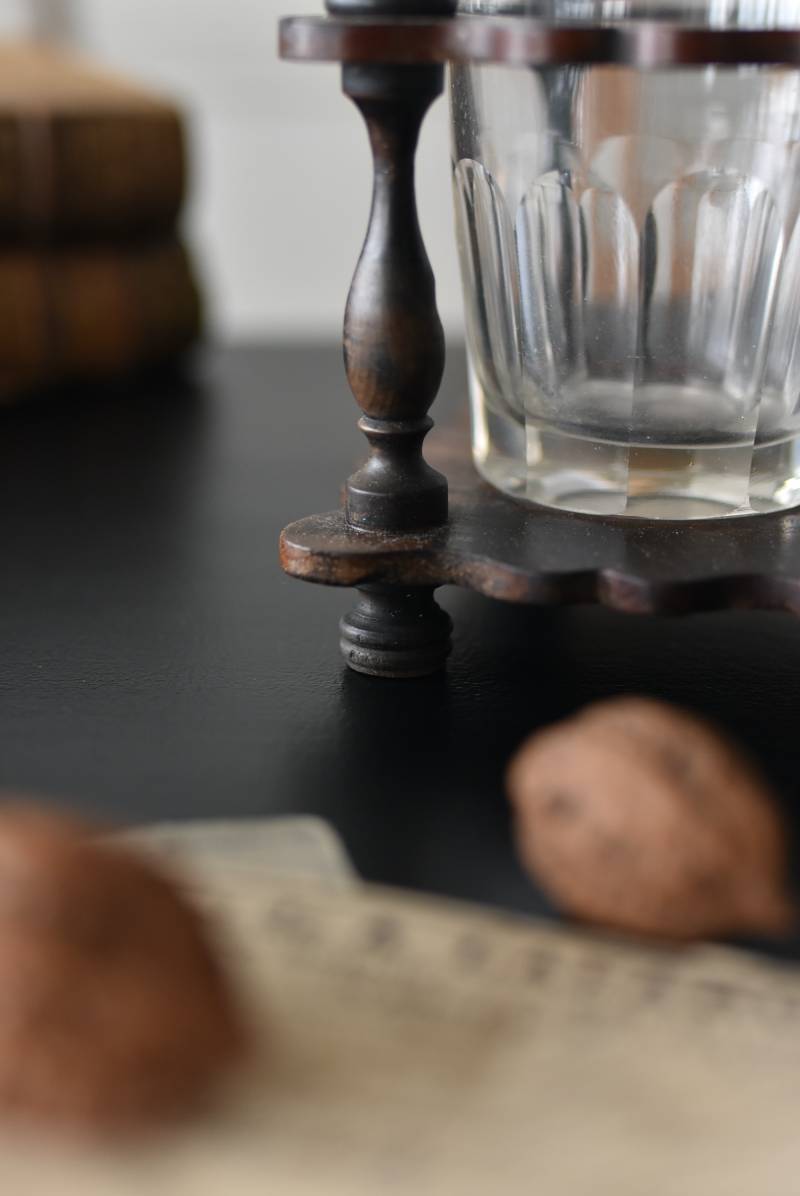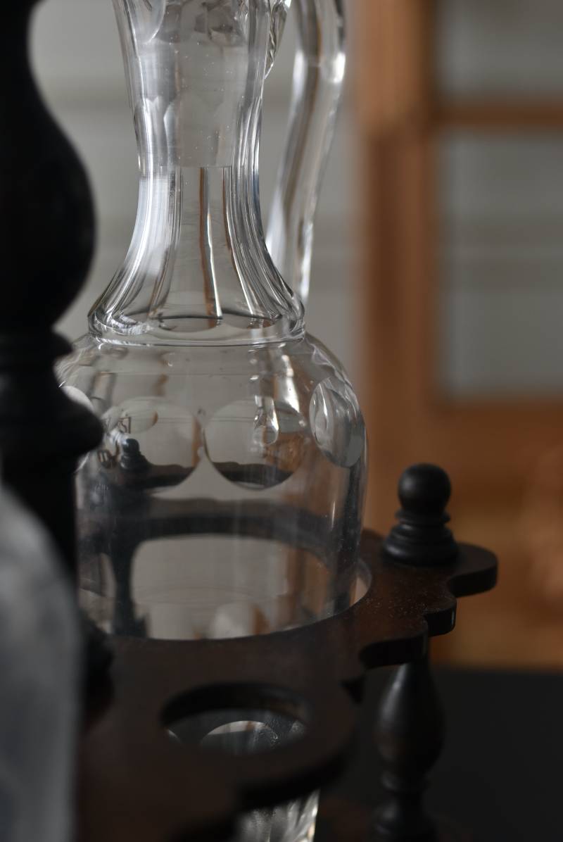 上品な艶感のある木製ホルダーはブラック×レッドブラウンの配色がシックな印象で、落ち着いた雰囲気漂う凛とした佇まい。細やかなカットが表面に施されたボトルは2つセットされ、きらりと光を反射する姿が煌びやかで美しいデザインです。一つ一つ手作業で作られており、やや歪なシルエットやカットの細やかな違いが見受けられる唯一無二の逸品に。