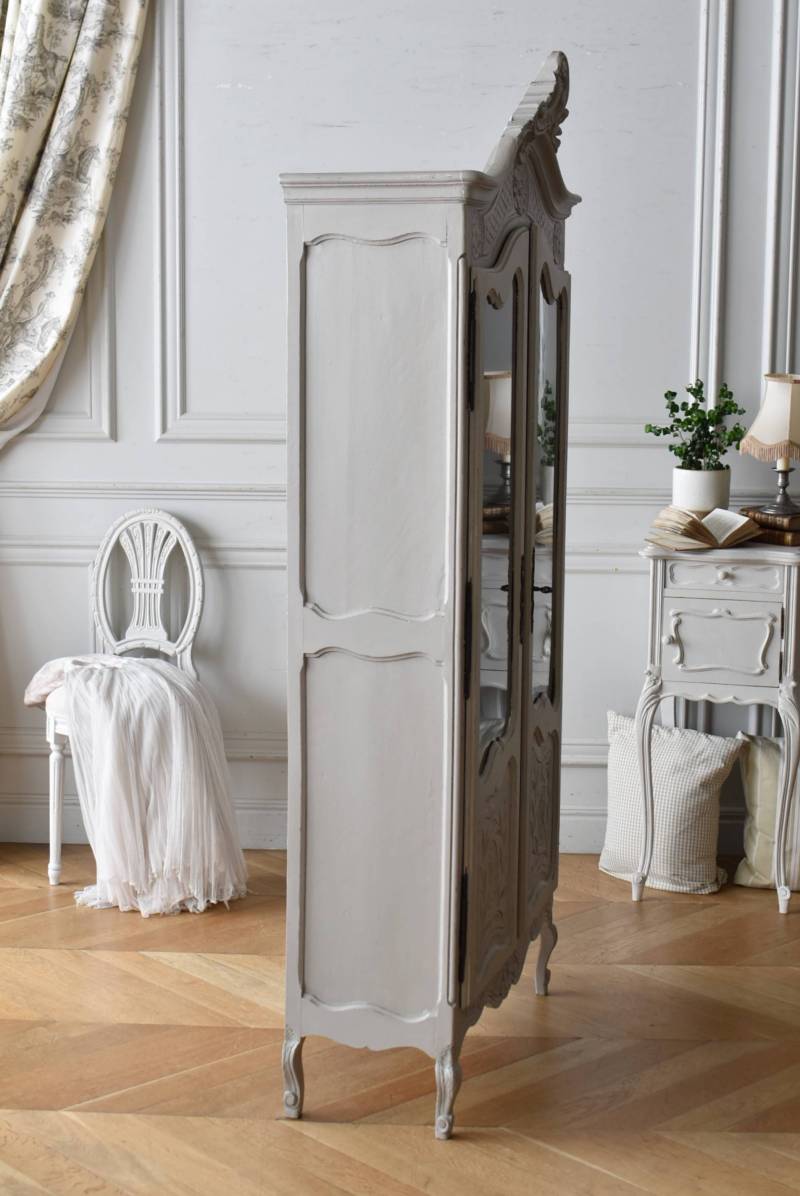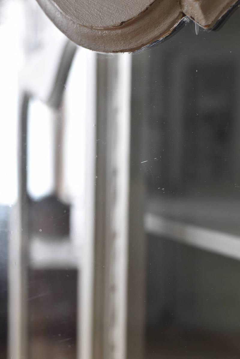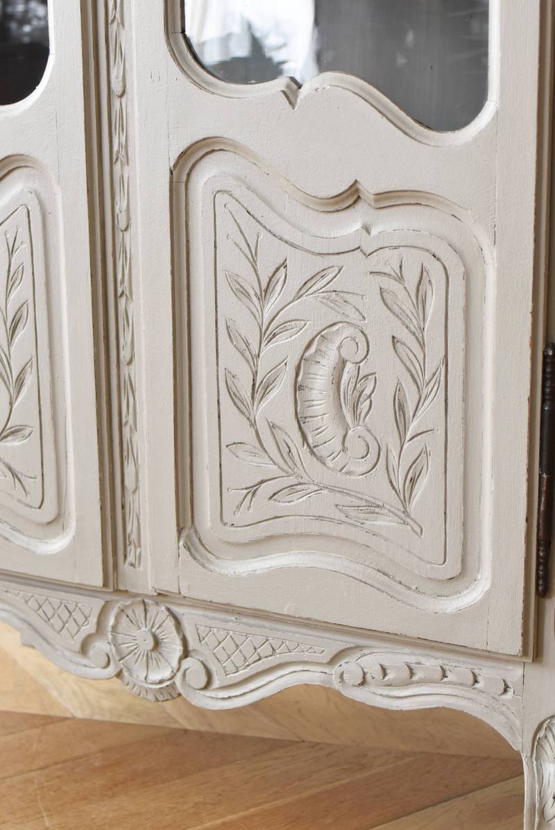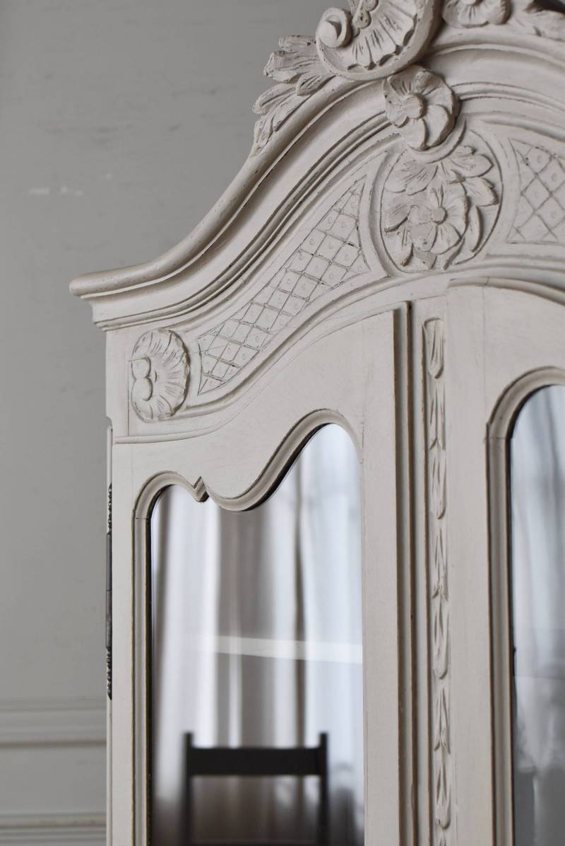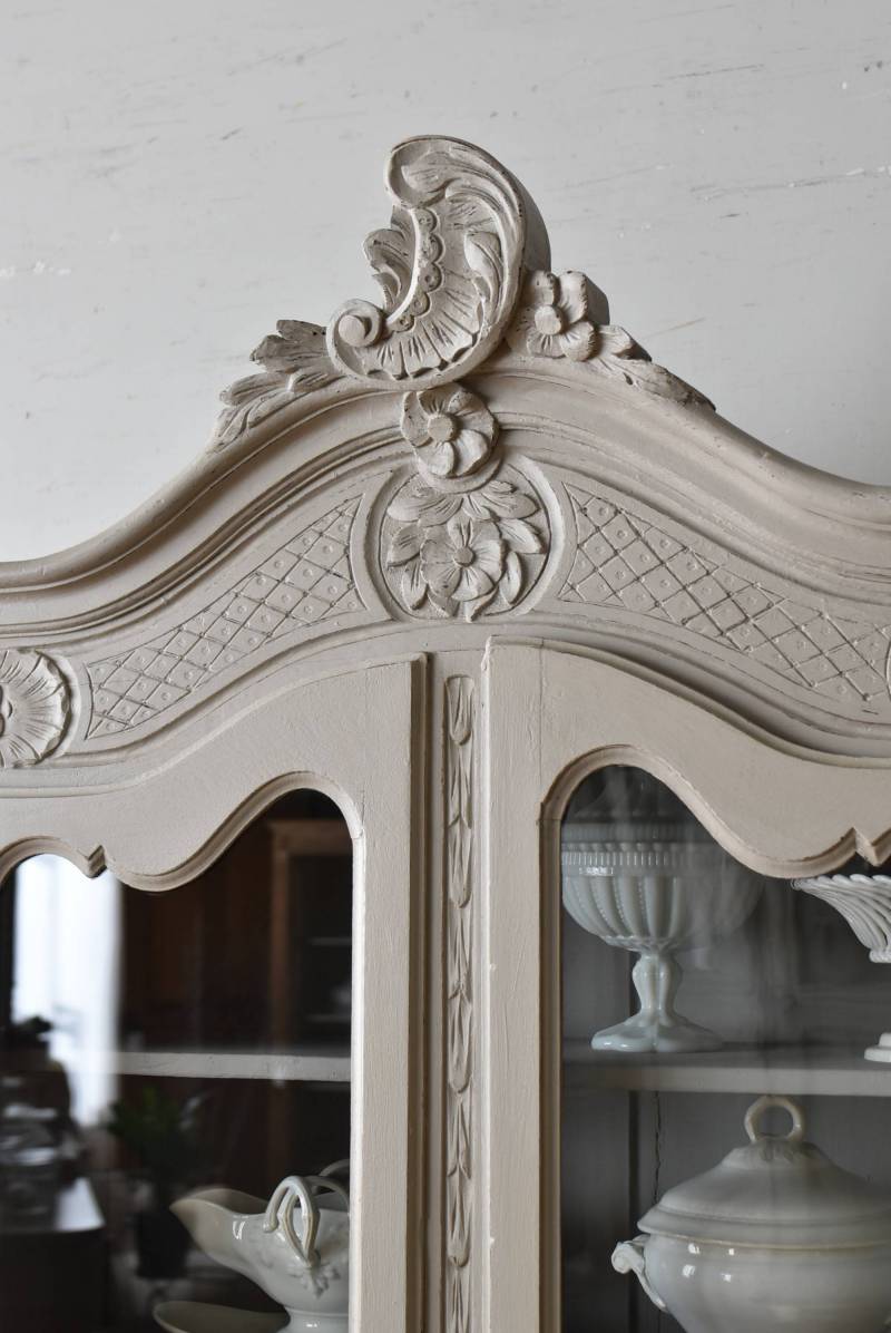 ロカイユや植物モチーフとなった彫り模様が豪華に施されており、しなやかなカーブを描いたトップにも大きな装飾があしらわれ、思わず目を奪われるような存在感があります。先端がくるんと巻かれた脚元まで優美な雰囲気が漂い、広々としたガラス面も相まって程よい抜け感のある佇まいです。