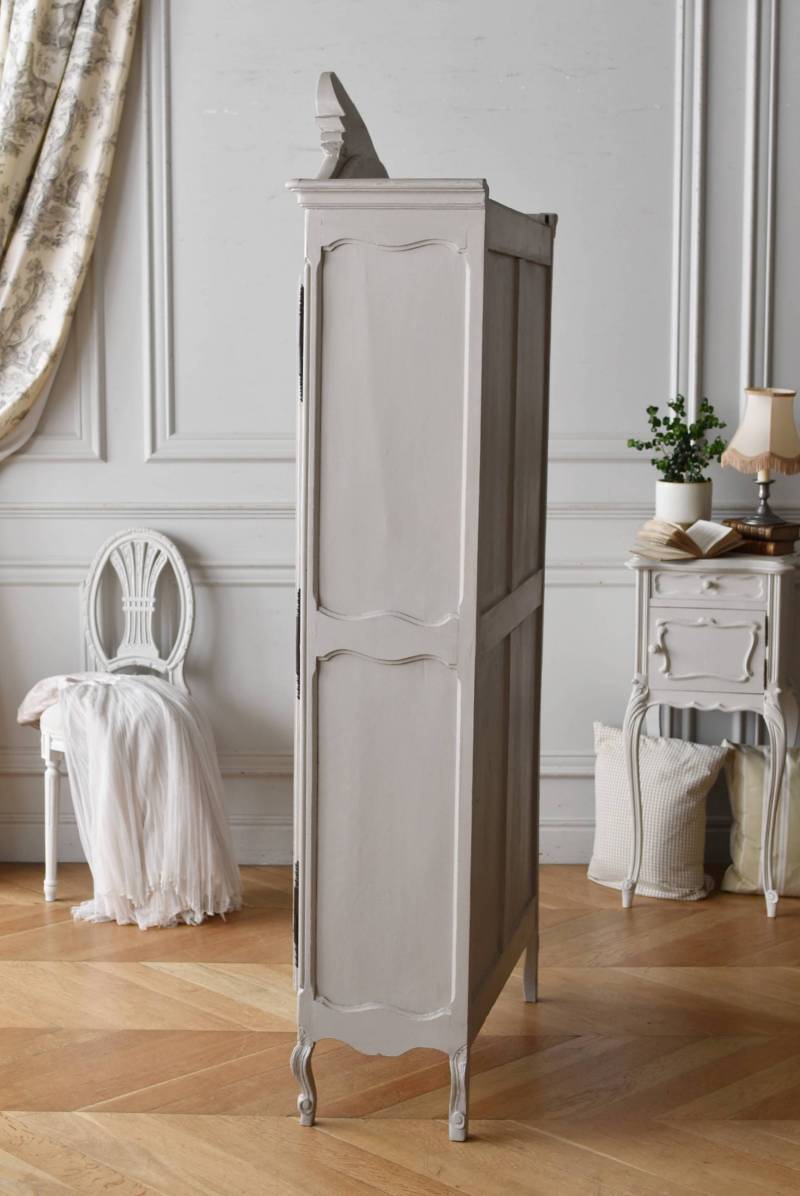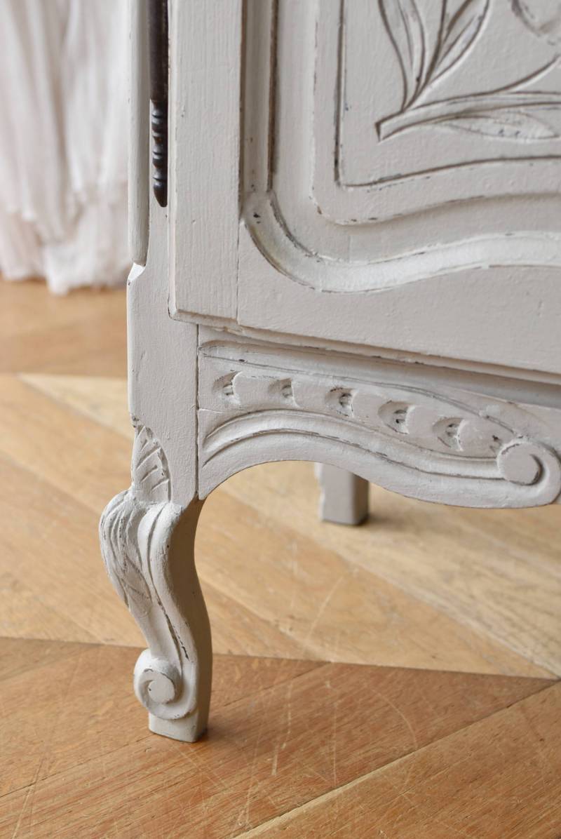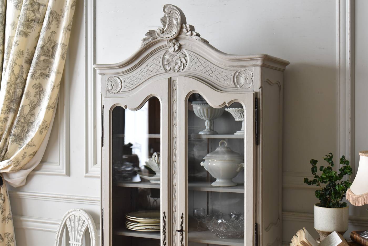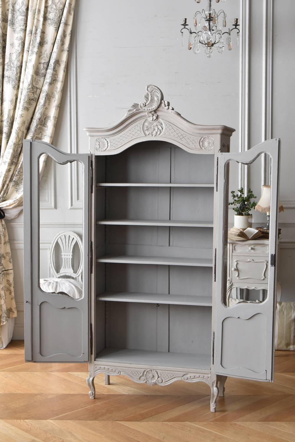 ロカイユや植物モチーフとなった彫り模様が豪華に施されており、しなやかなカーブを描いたトップにも大きな装飾があしらわれ、思わず目を奪われるような存在感があります。先端がくるんと巻かれた脚元まで優美な雰囲気が漂い、広々としたガラス面も相まって程よい抜け感のある佇まいです。